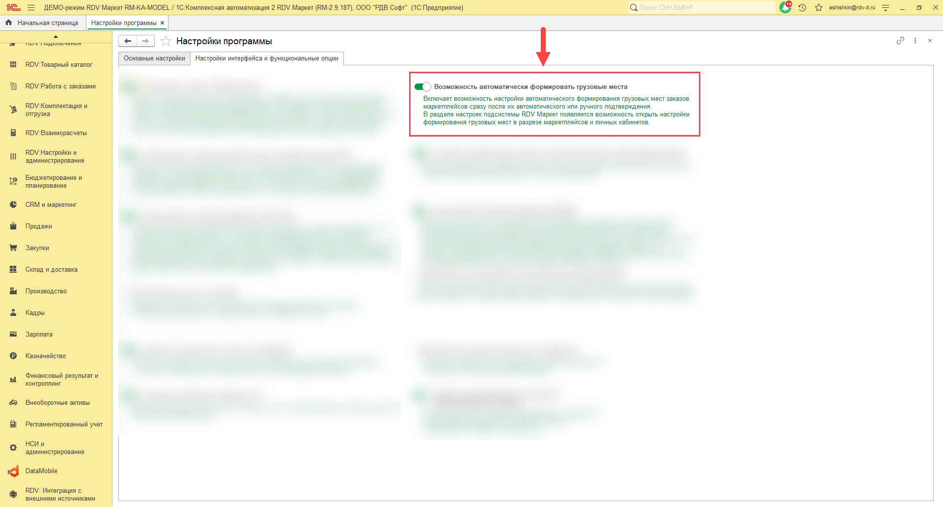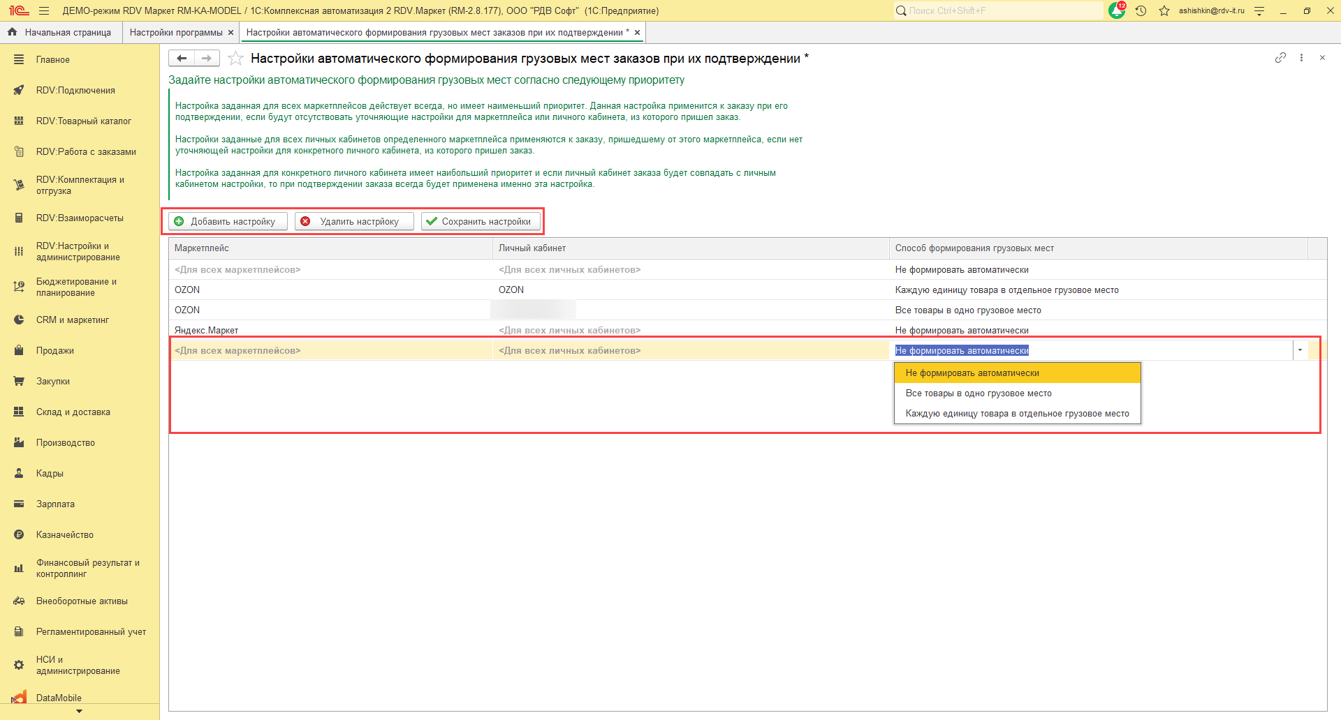 1. В меню "RDV Настройки и администрирование" - "Настройки программы" - "Настройки интерфейса и функциональные опции" - "Возможность автоматически формировать грузовые места":