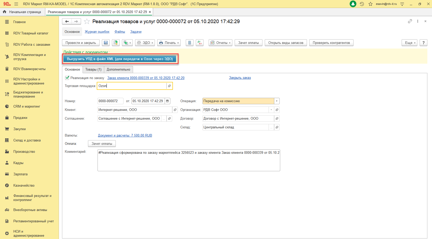 При нажатии на кнопку "Выгрузить УПД в файл XML (для передачи в Ozon через ЭДО)" формируется УПД в файл XML.