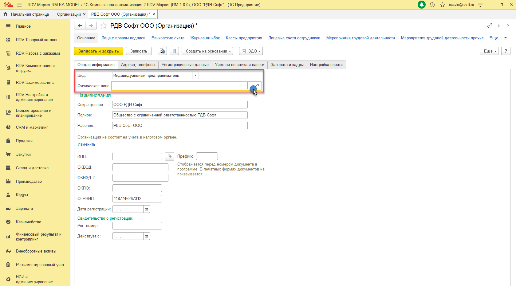 Во вкладке "Общая информация", Если выбран "Вид" - "Индивидуальный предприниматель", необходимо указать "Физическое лицо".