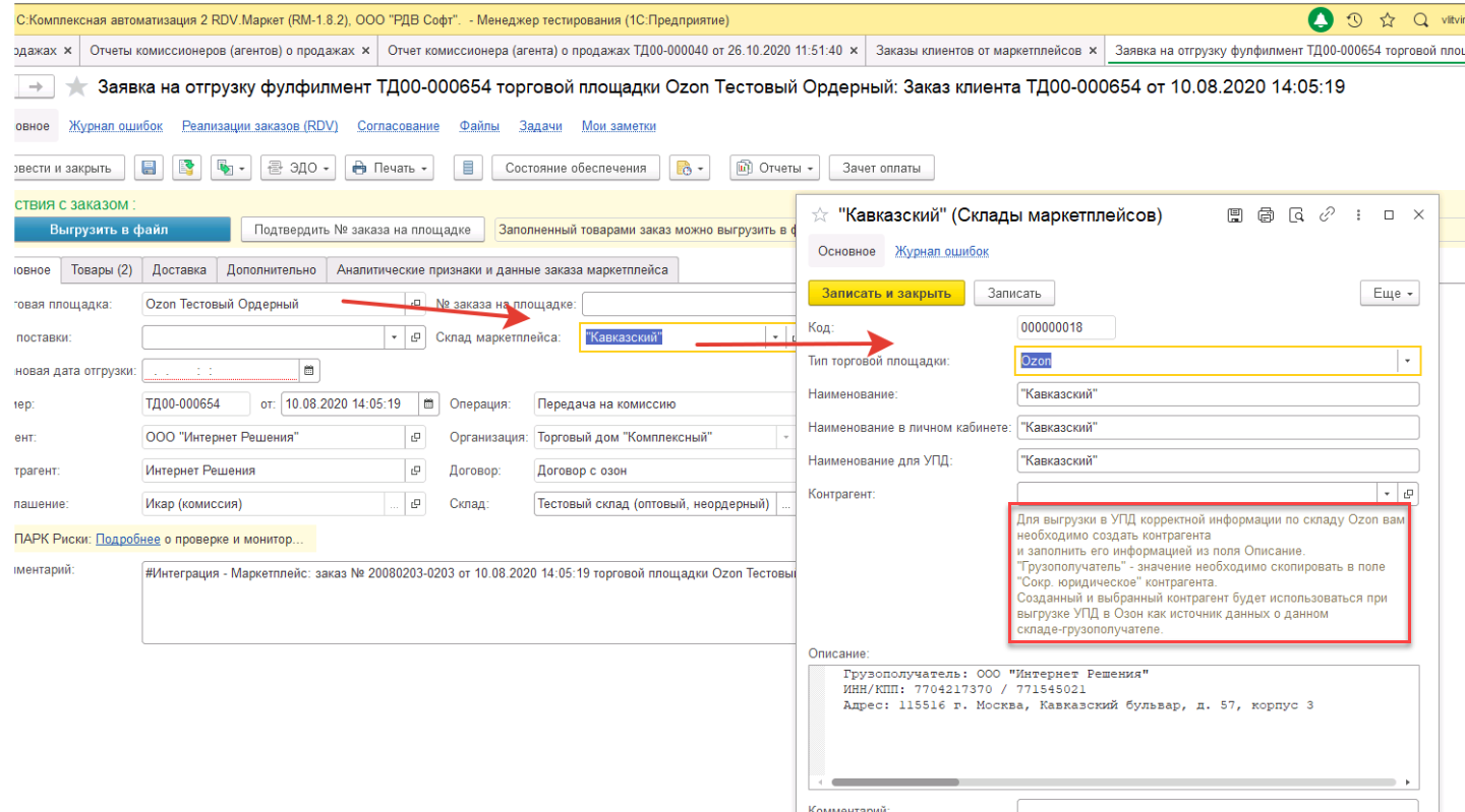 5. В заказе, по которому создана реализация, необходимо перейти в "Склад маркетплейса" и настроить его так, как написано в подсказке на форме склада.