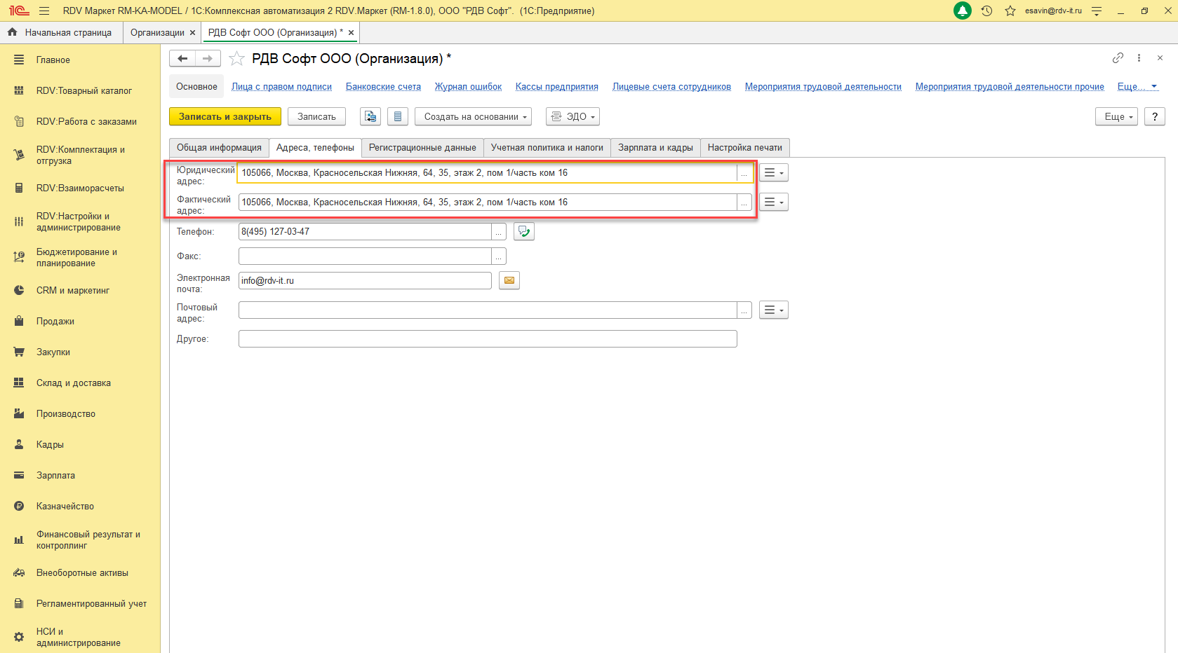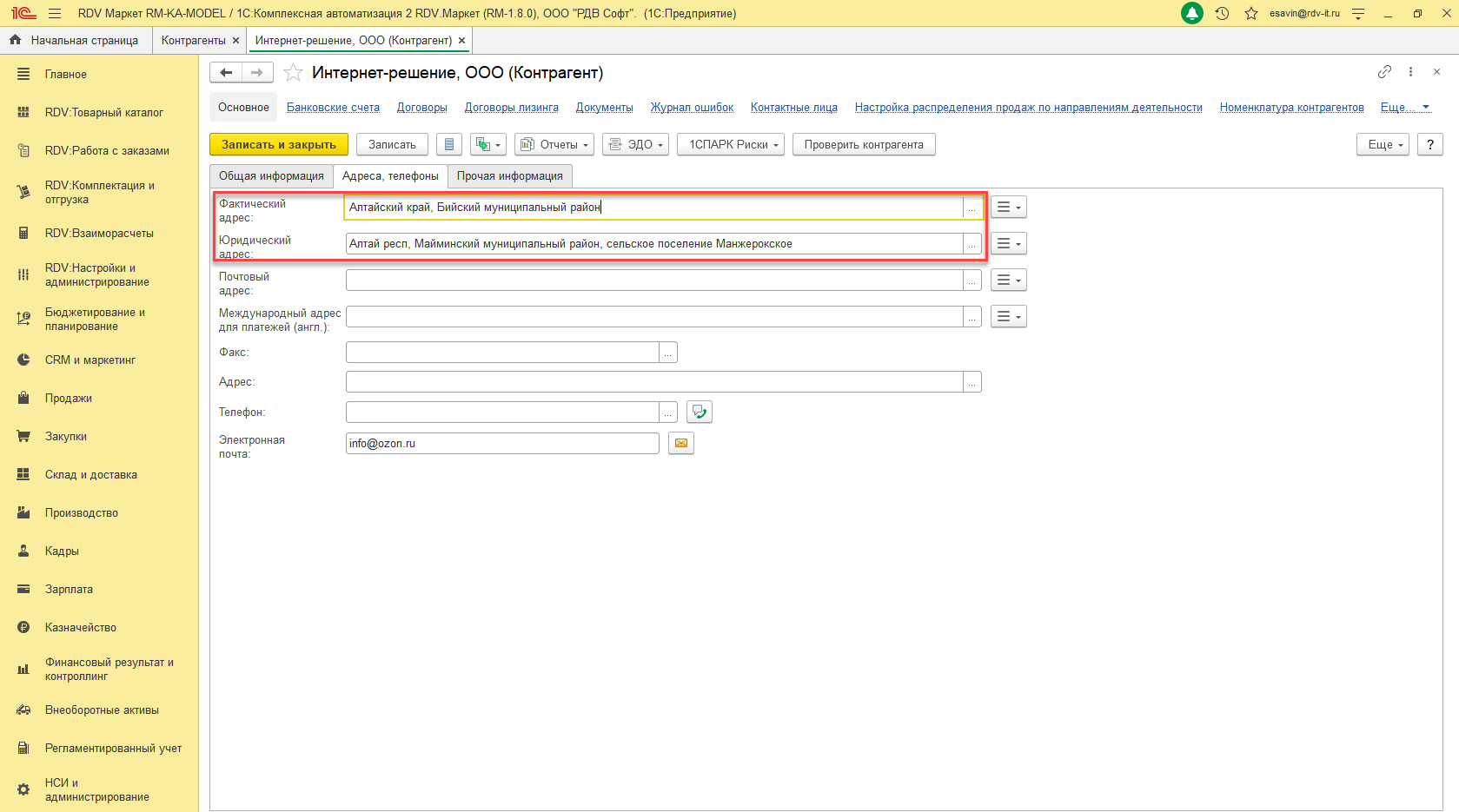 6. В контрагенте реализации необходимо заполнить юридический и фактический адреса ("НСИ и администрирование" - "Контрагенты" - "Интернет-решение, ООО" - вкладка "Адреса, телефоны").