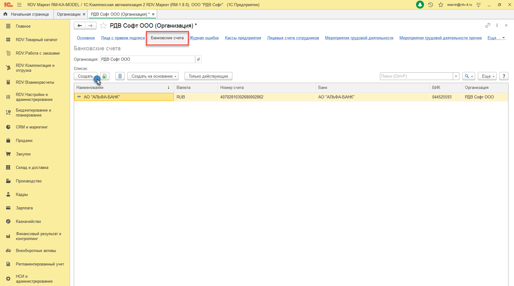 4. В меню "Банковские счета" необходимо создать банковский счет организации.