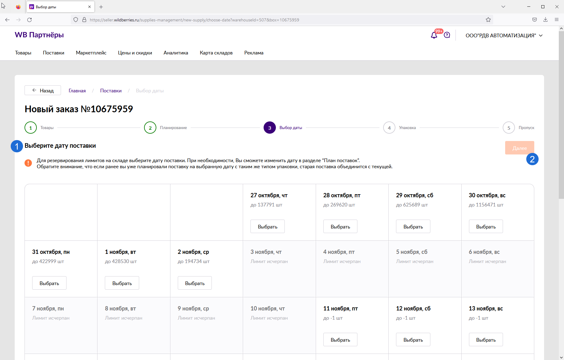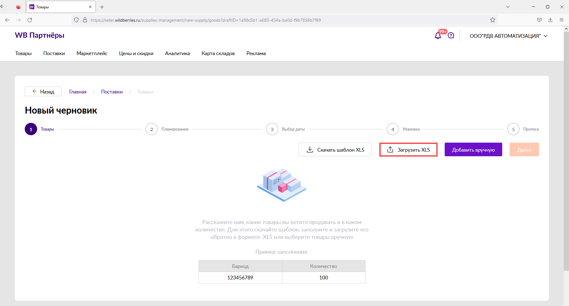 Загрузка заказа в личном кабинете Wildberries