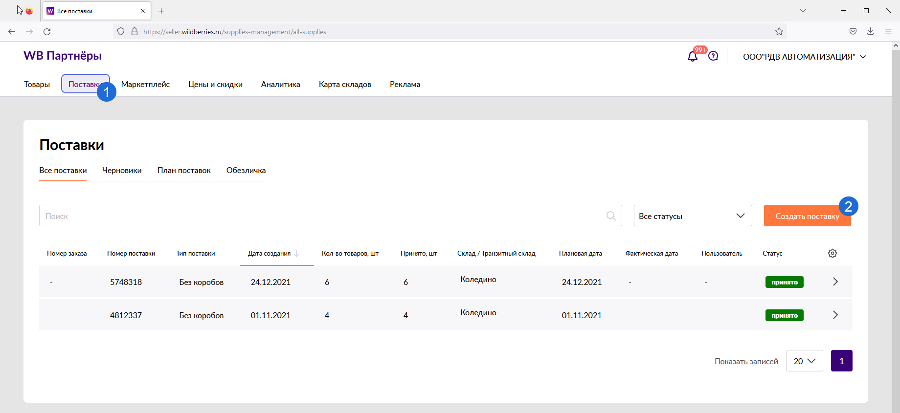 - Нажать на кнопку "Создать поставку"