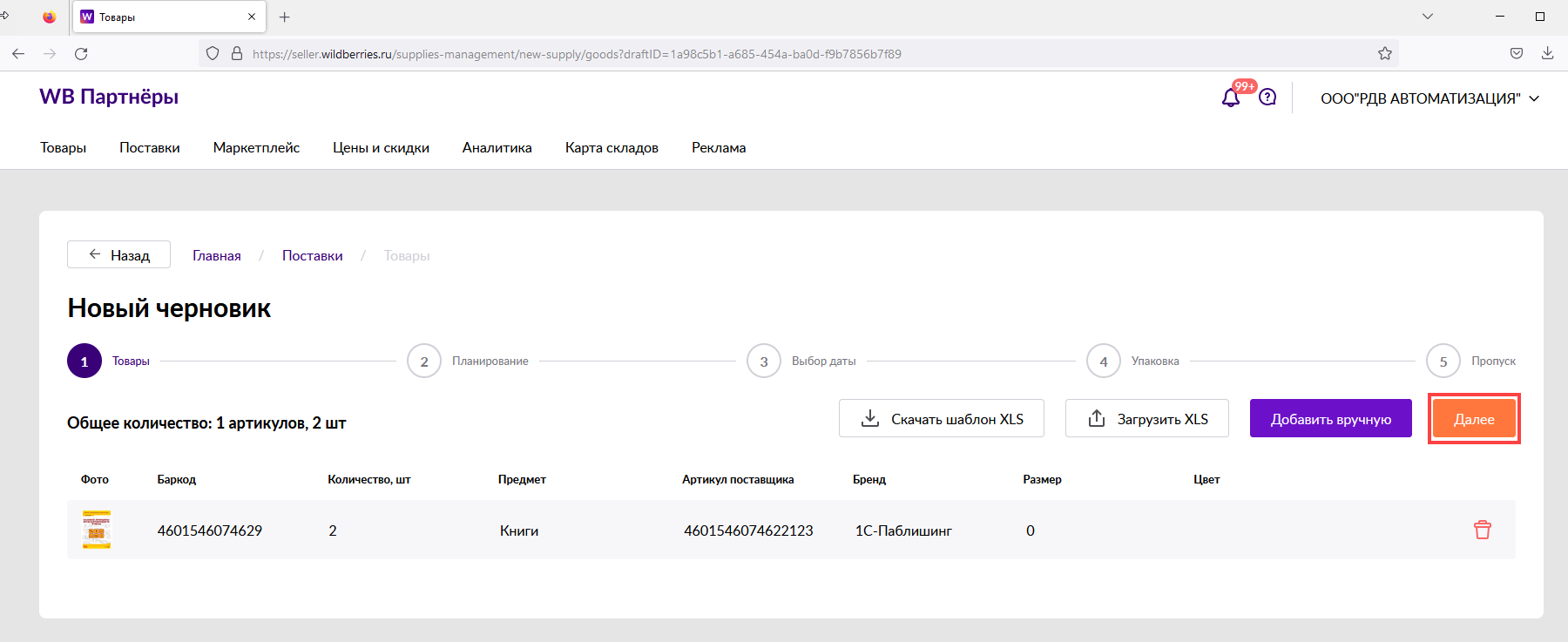 После того как товары добавятся в поставку, нажмите на кнопку "Далее"