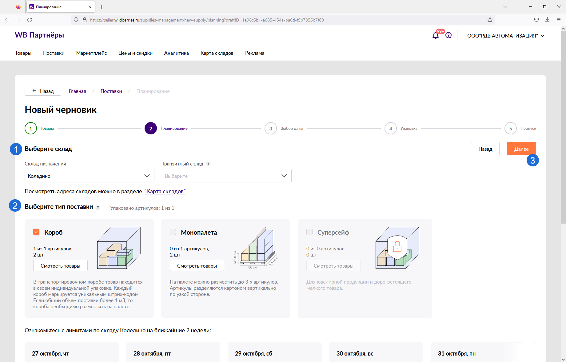 - Склад маркетплейса - склад маркетплейса, на который будет доставлен товар.
