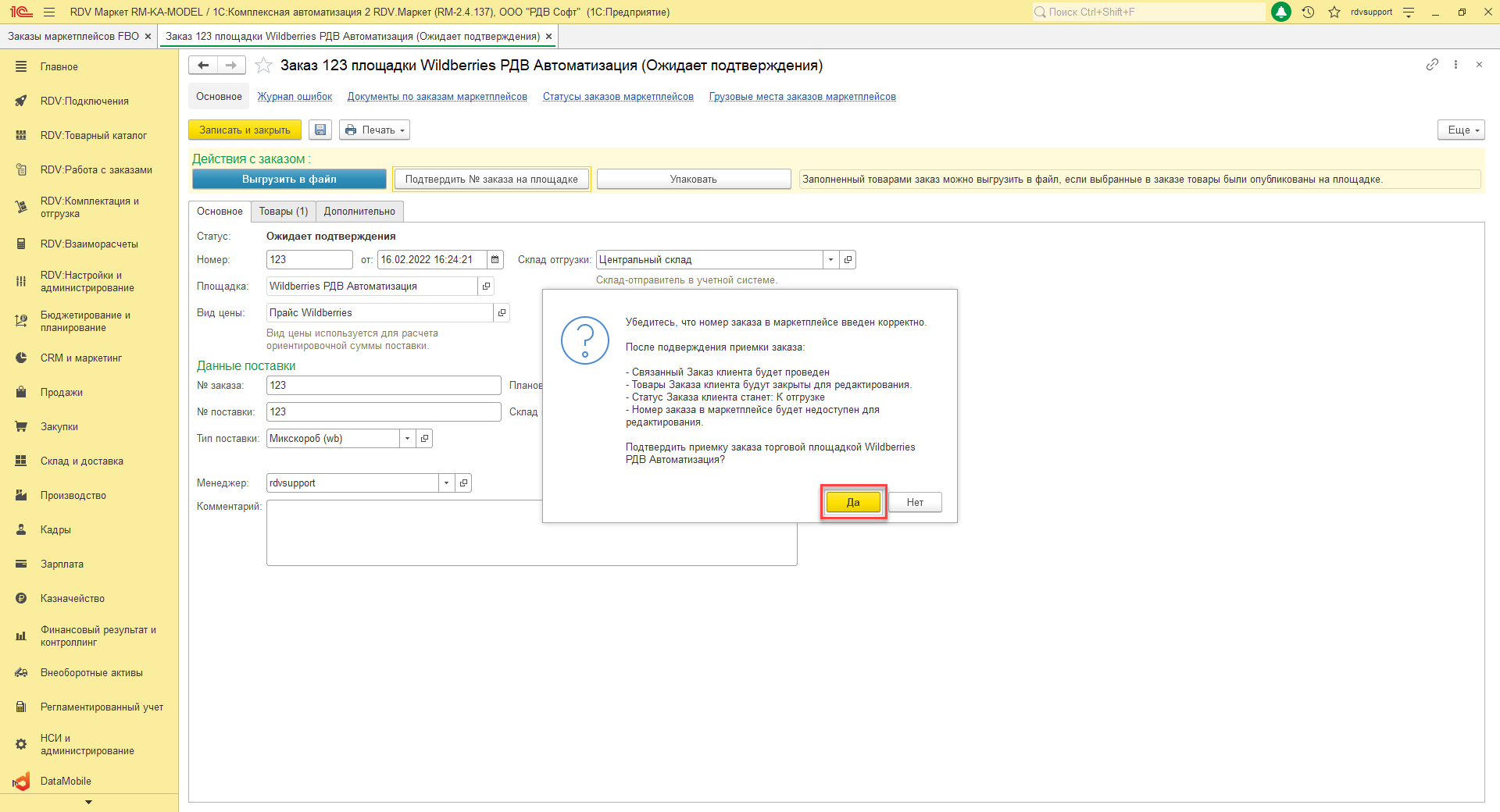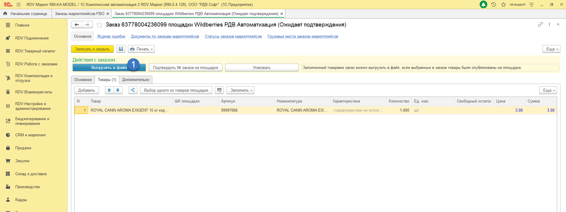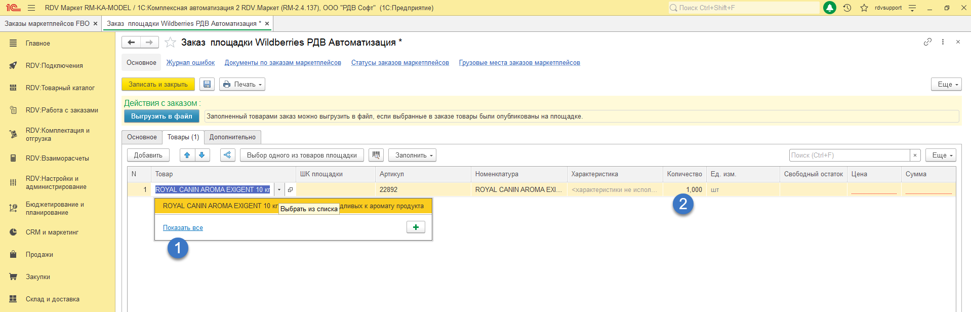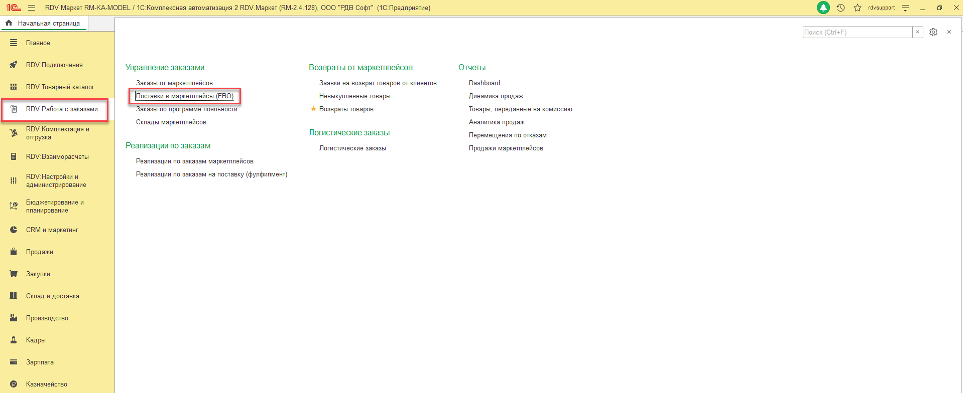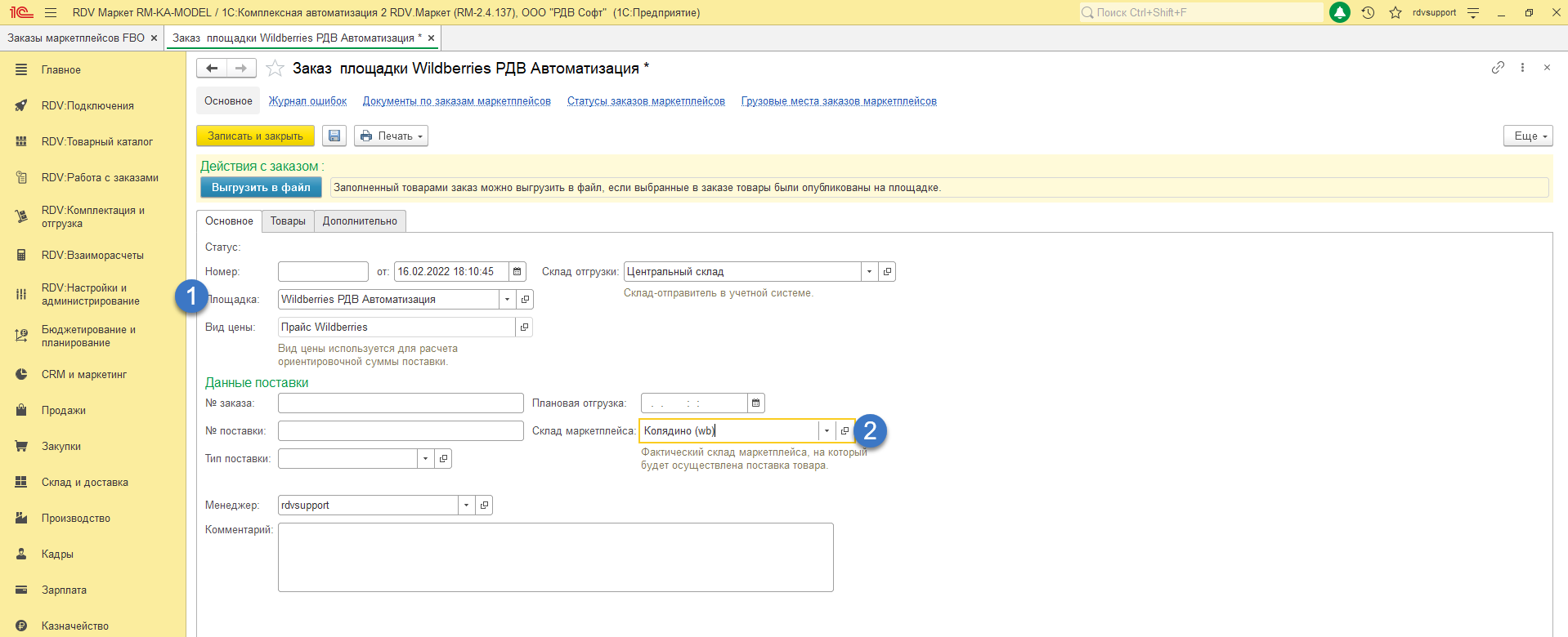 - Заказ на поставку Wildberries по схеме FBO создается в раздел "RDV: Работа с заказами" - "Управление заказами" - "Поставки в маркетплейсы (FBO)":