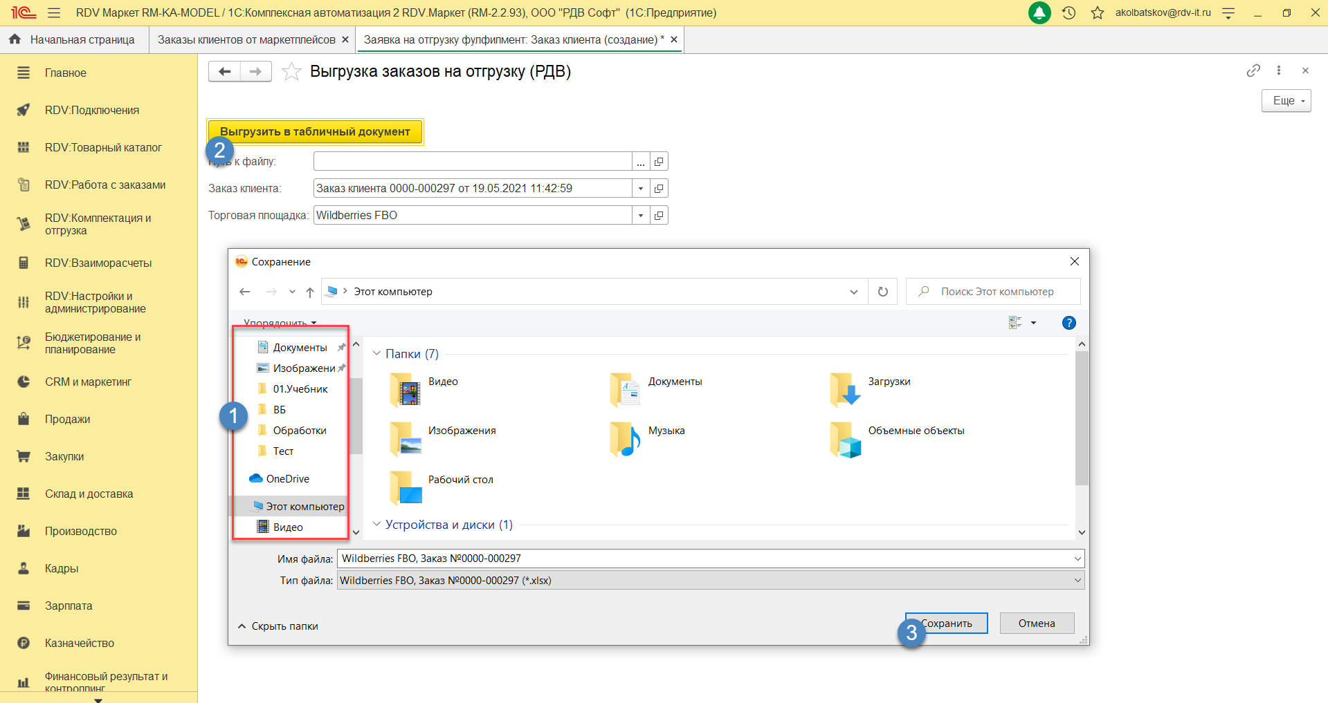 2. Необходимо указать папку, в которую будет сохранен документ - нажать кнопки "Сохранить" и "Выгрузить в табличный документ":