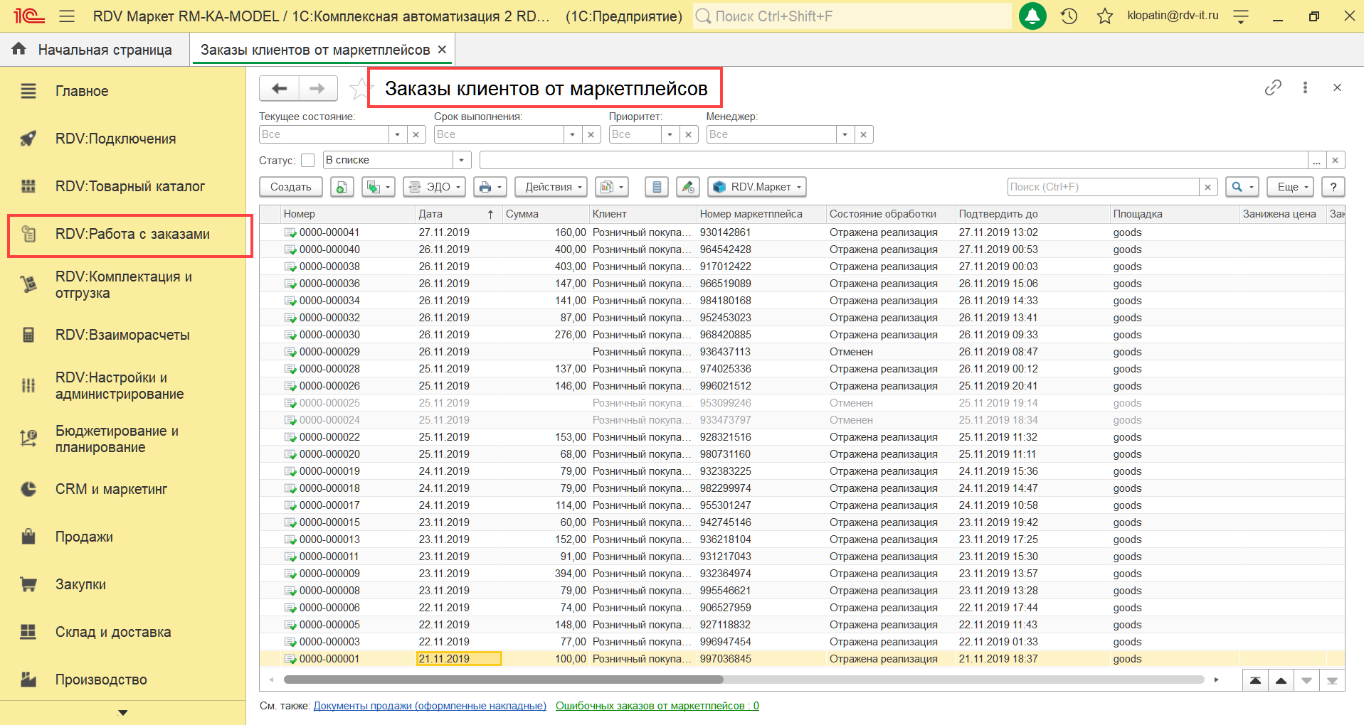 Академия RDV Маркет Платформа RDV Маркет 2.0 Инструкции по работе с системой Инструкция по работе со МегаМаркет Работа с заказами МегаМаркет Current: Как открыть список заказов МегаМаркет Как открыть список заказов МегаМаркет Работа с заказами выполняется из рабочего места менеджера по продажам, в разделе "RDV: Работа с заказами" - "Заказы от маркетплейсов" Для удобного и быстрого подтверждения заказов вы можете настроить фильтр, чтобы в окне рабочего места видеть только неподтвержденные заказы. ×