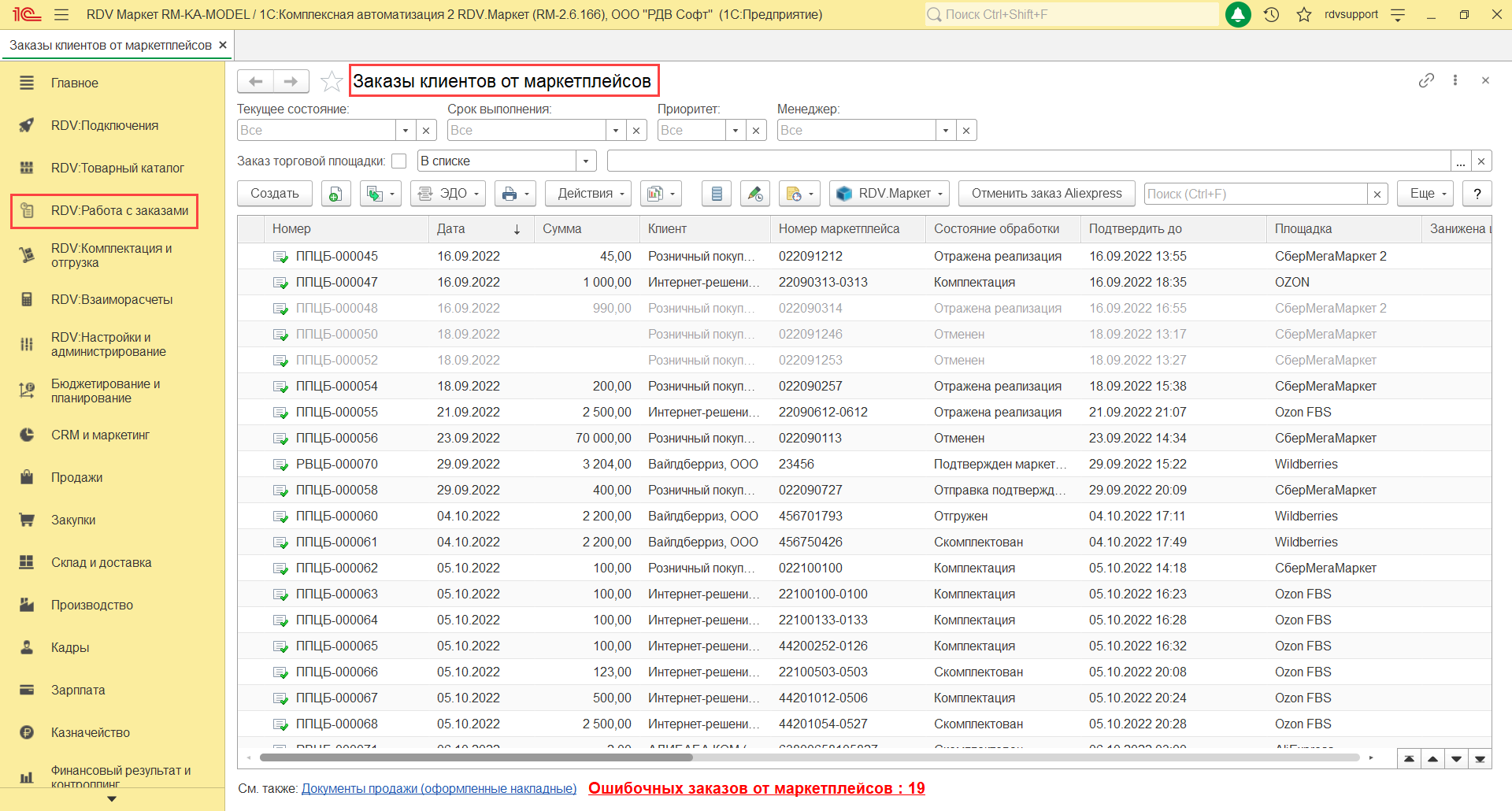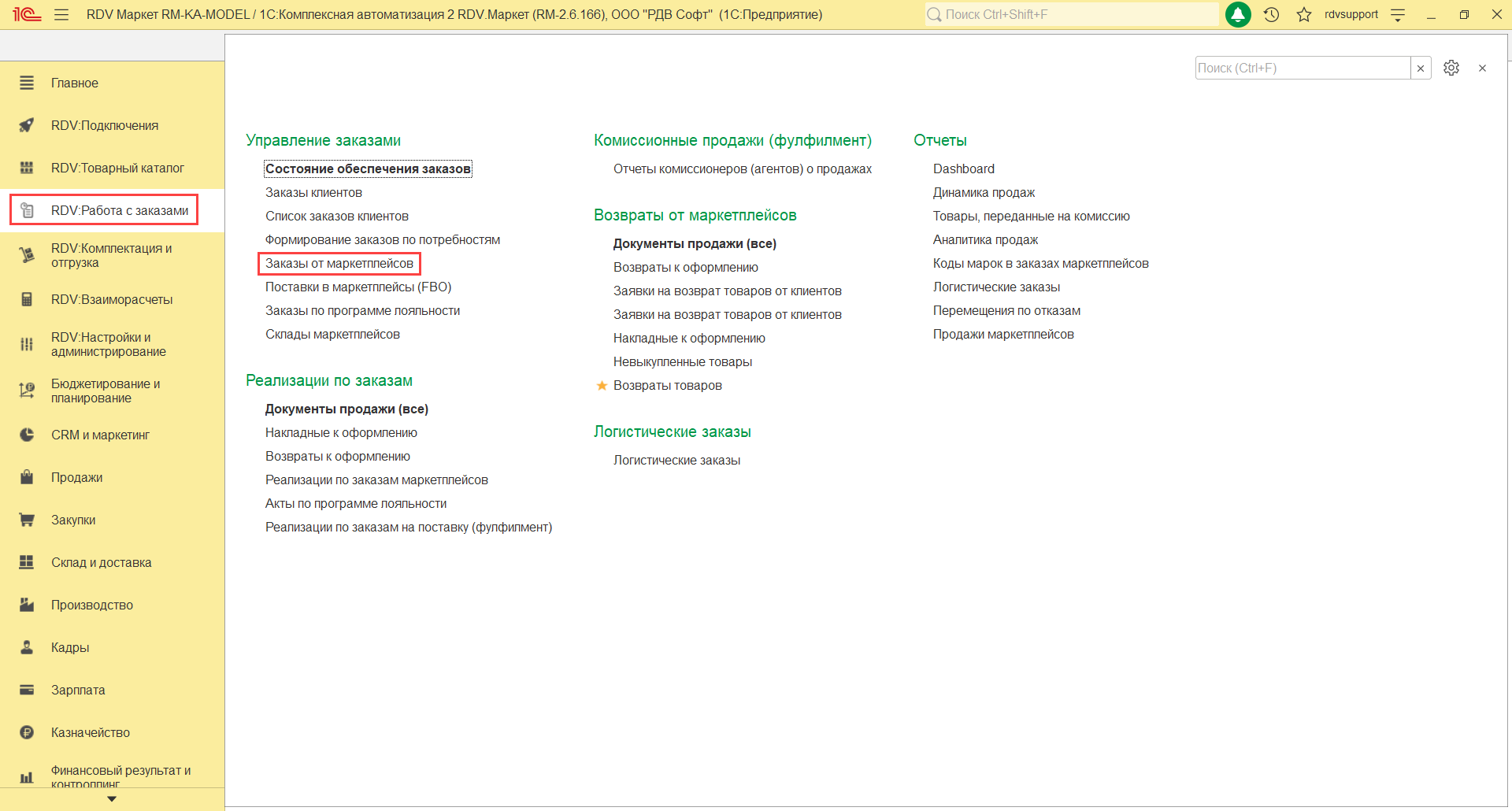 Все поступившие заказы отображаются в разделе "RDV: Работа с заказами" - "Заказы от маркетплейсов"