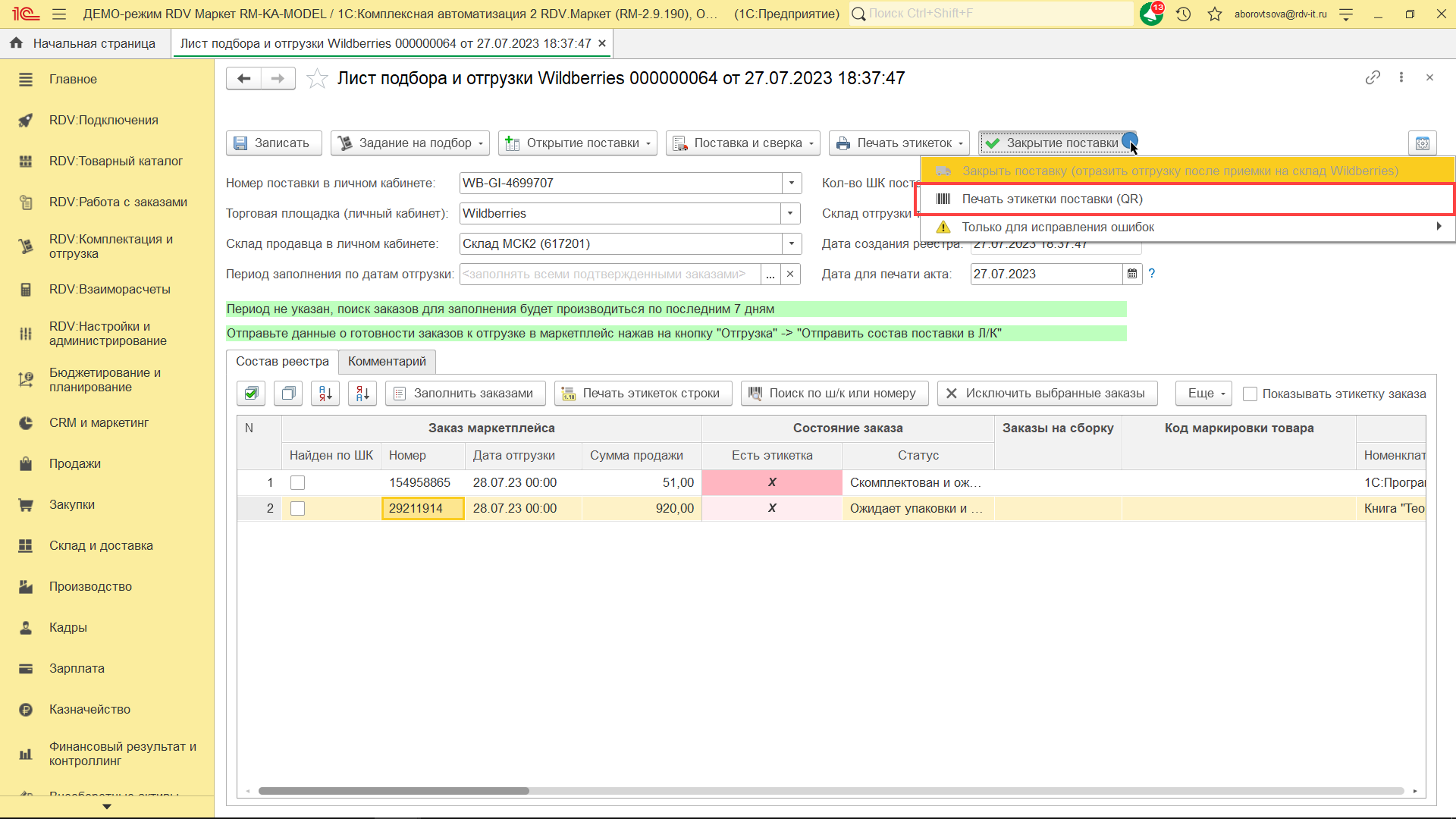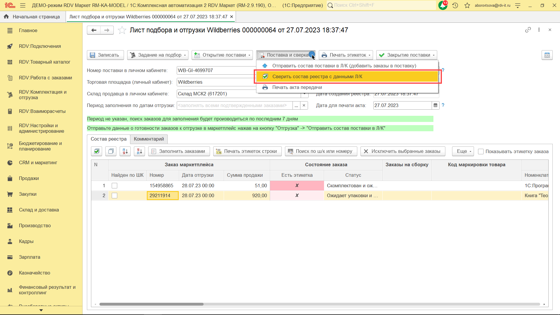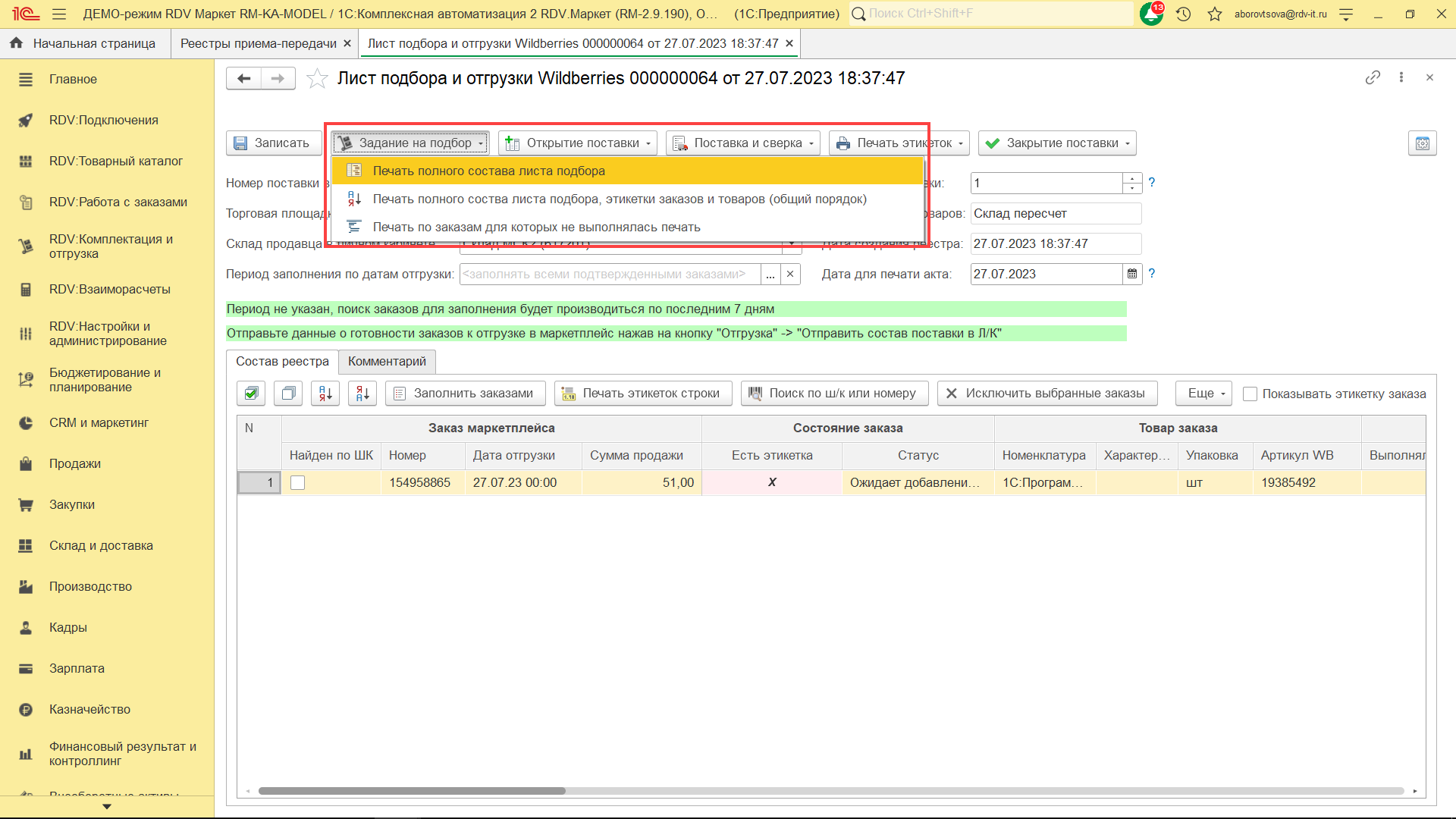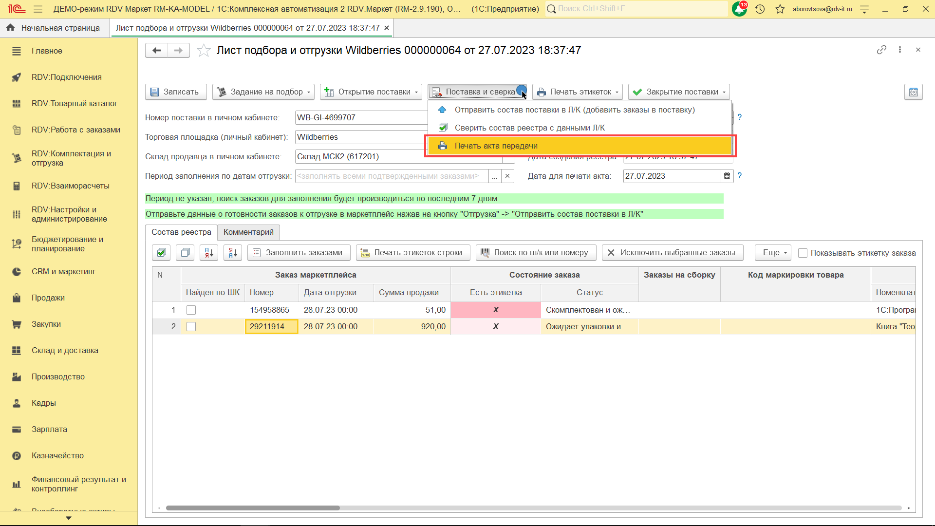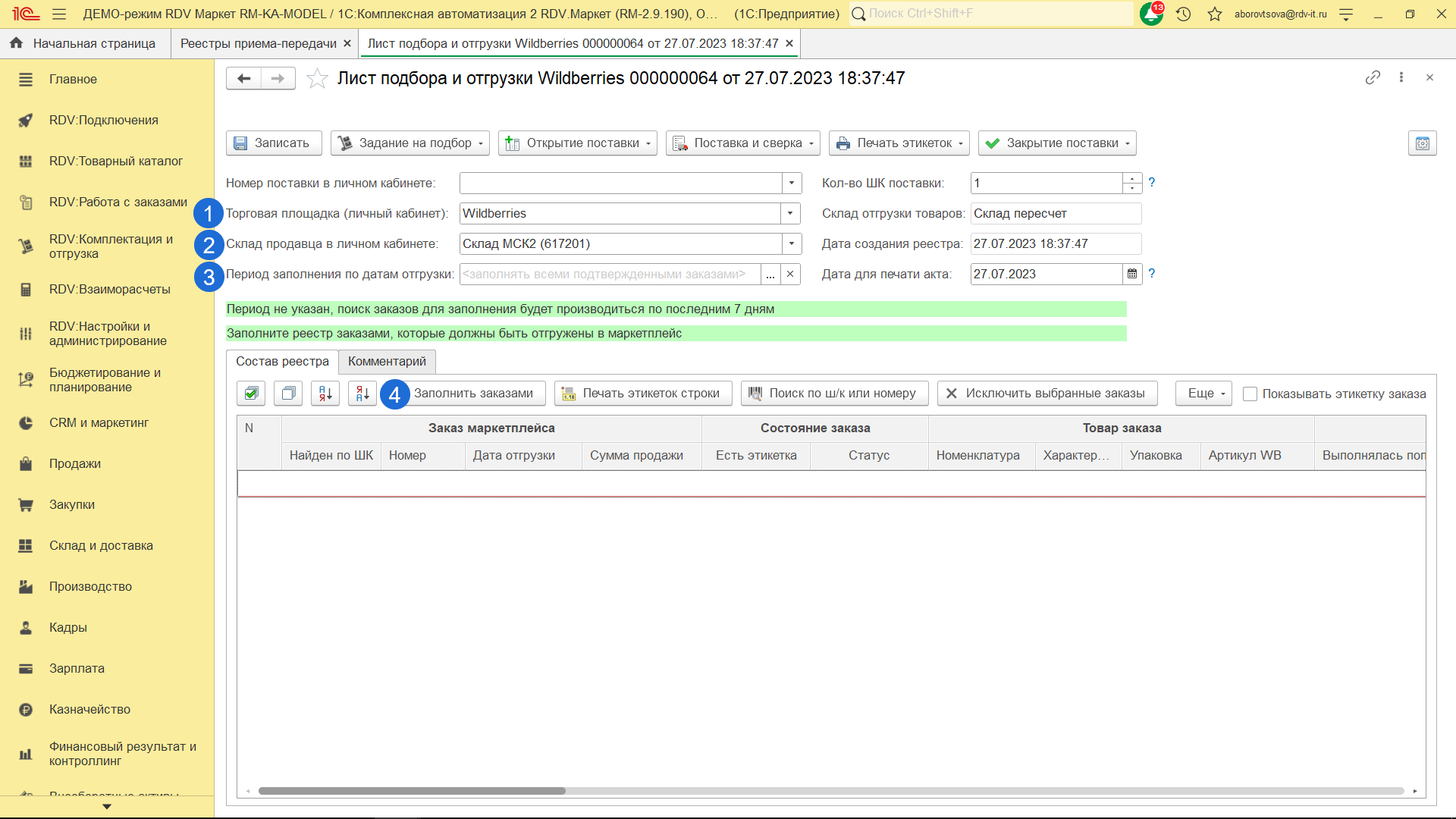 Для комплектации и отгрузки заказов Wildberries FBS, необходимо перейти в раздел "RDV: Комплектация и отгрузка" - "Реестры приема-передачи".