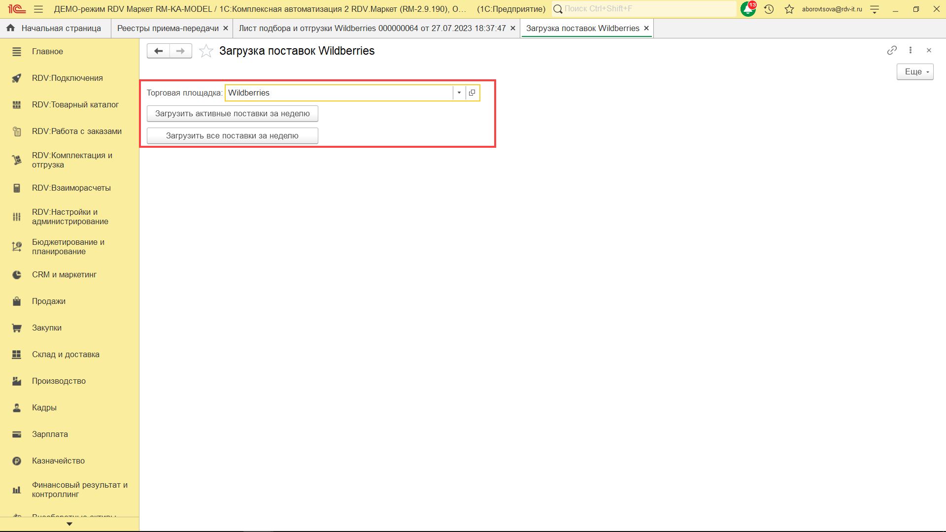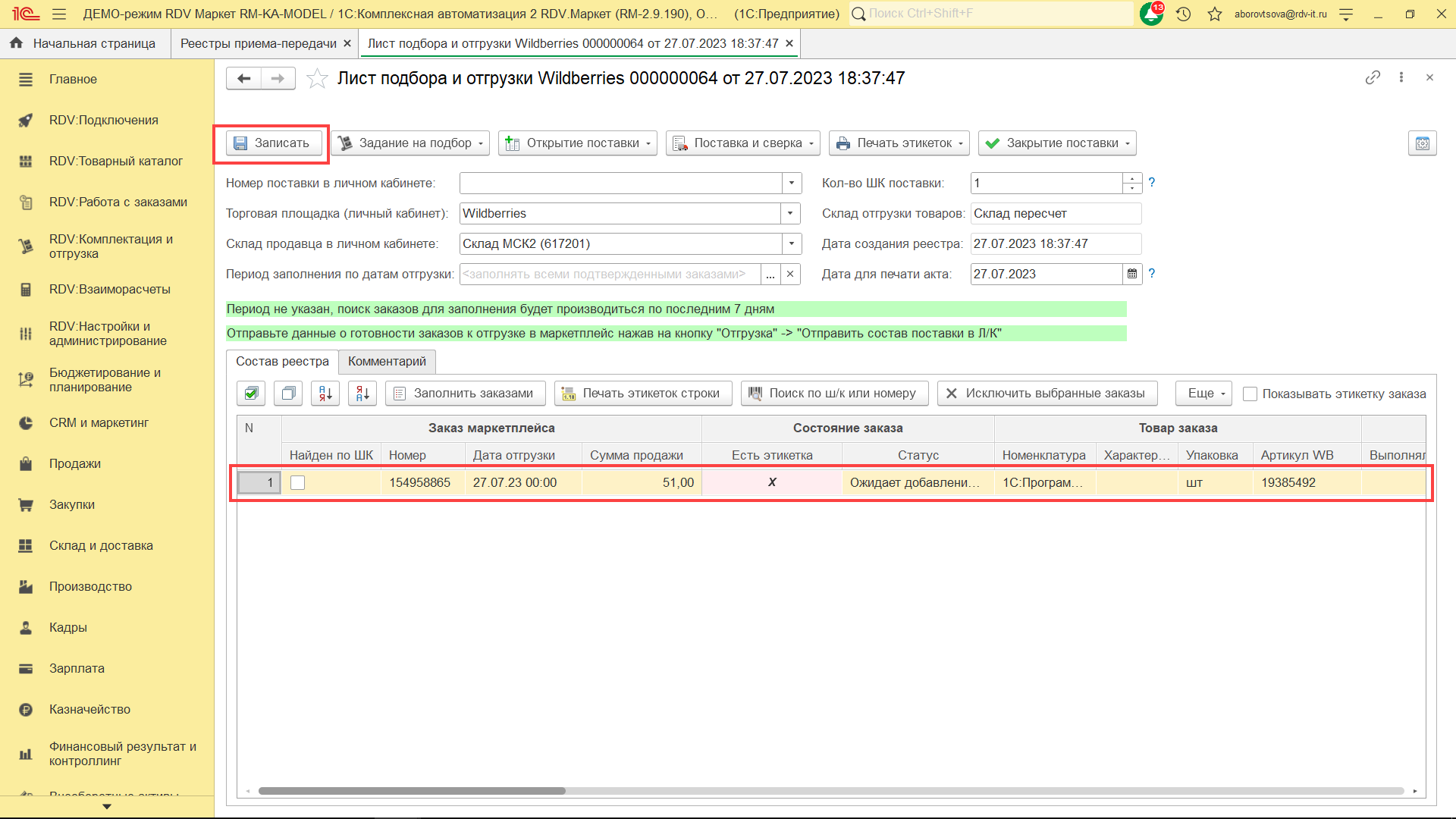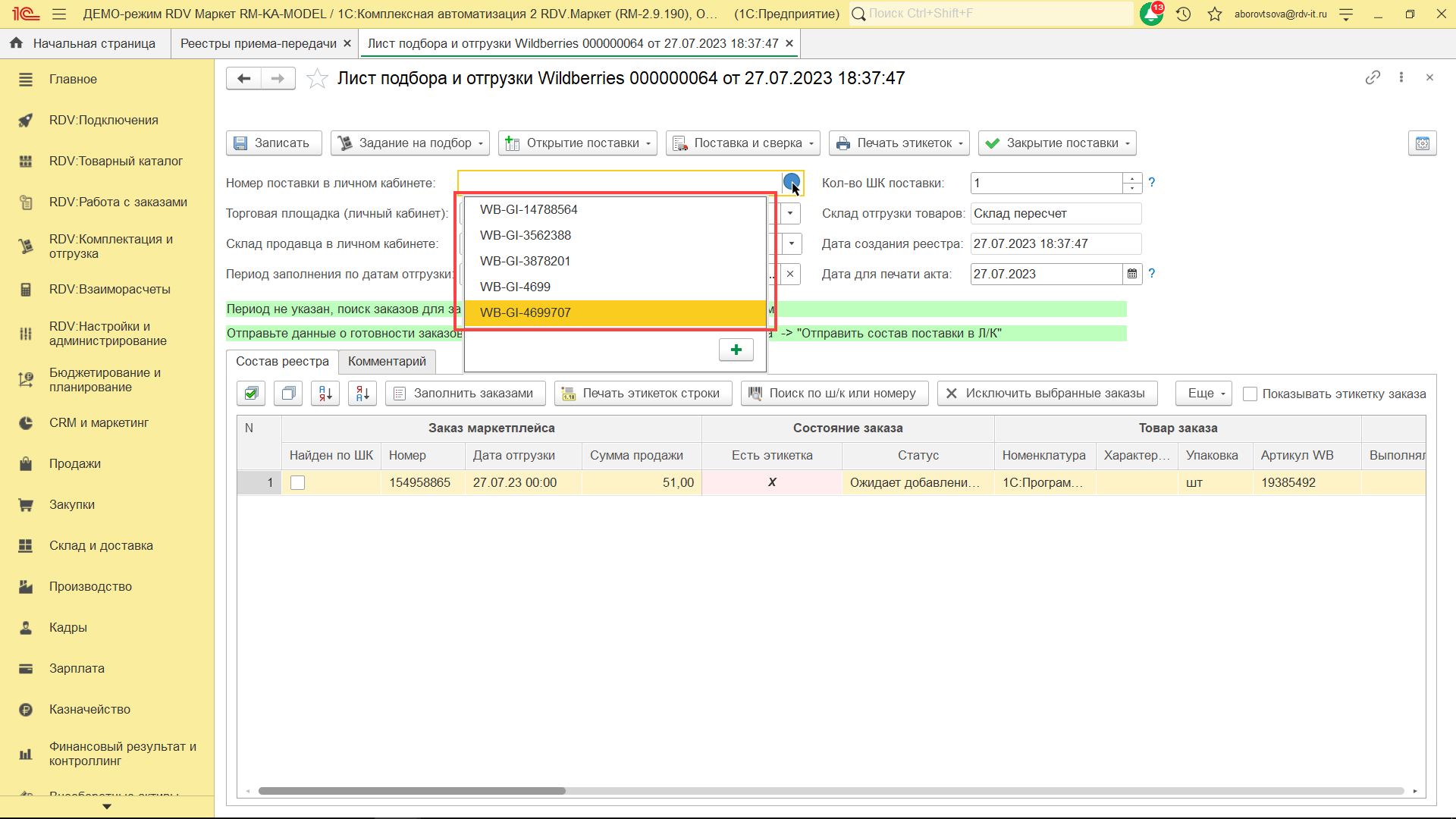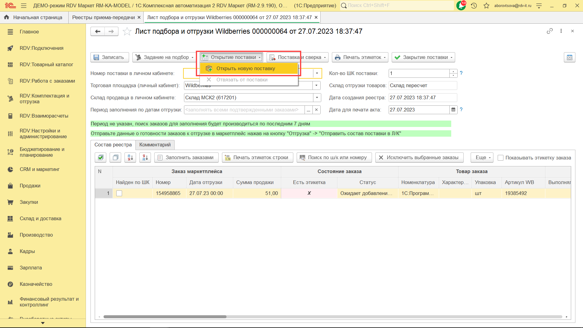 Для комплектации и отгрузки заказов Wildberries FBS, необходимо перейти в раздел "RDV: Комплектация и отгрузка" - "Реестры приема-передачи".