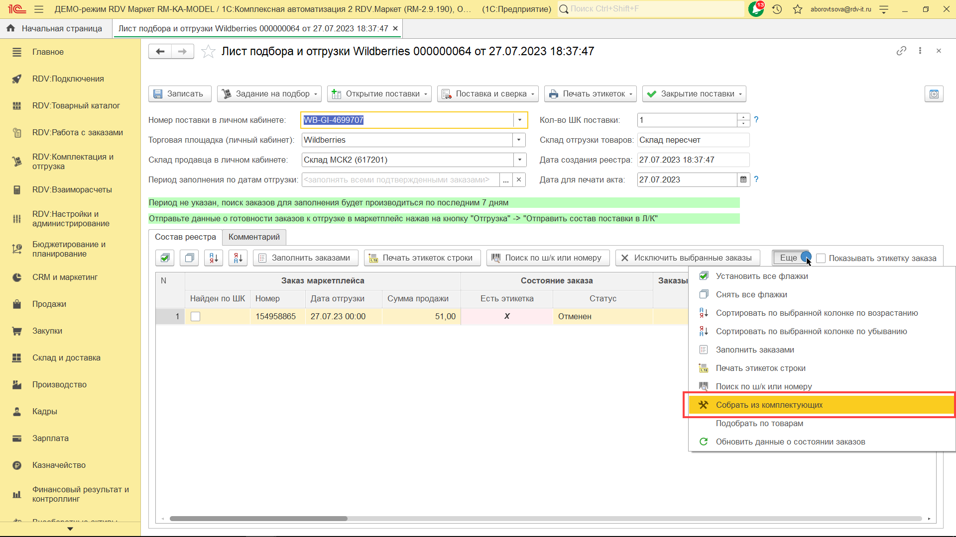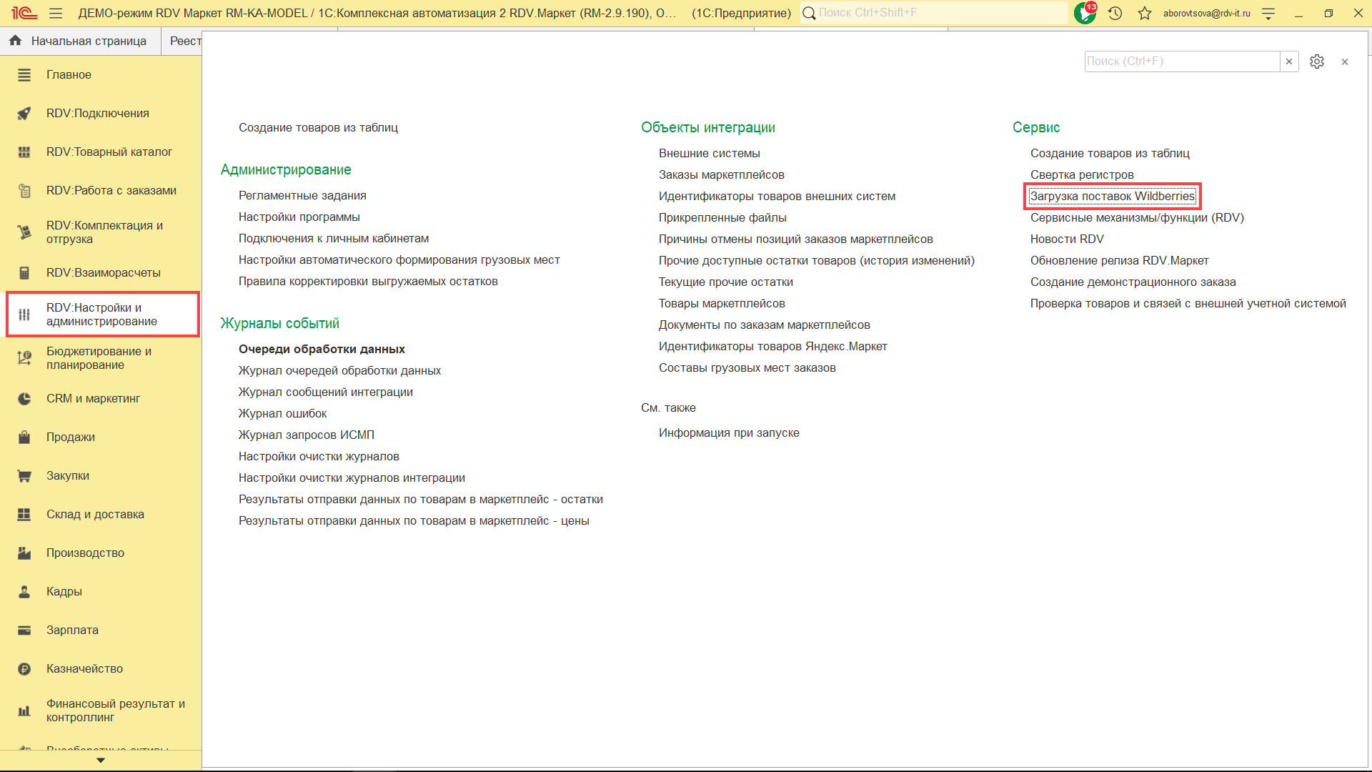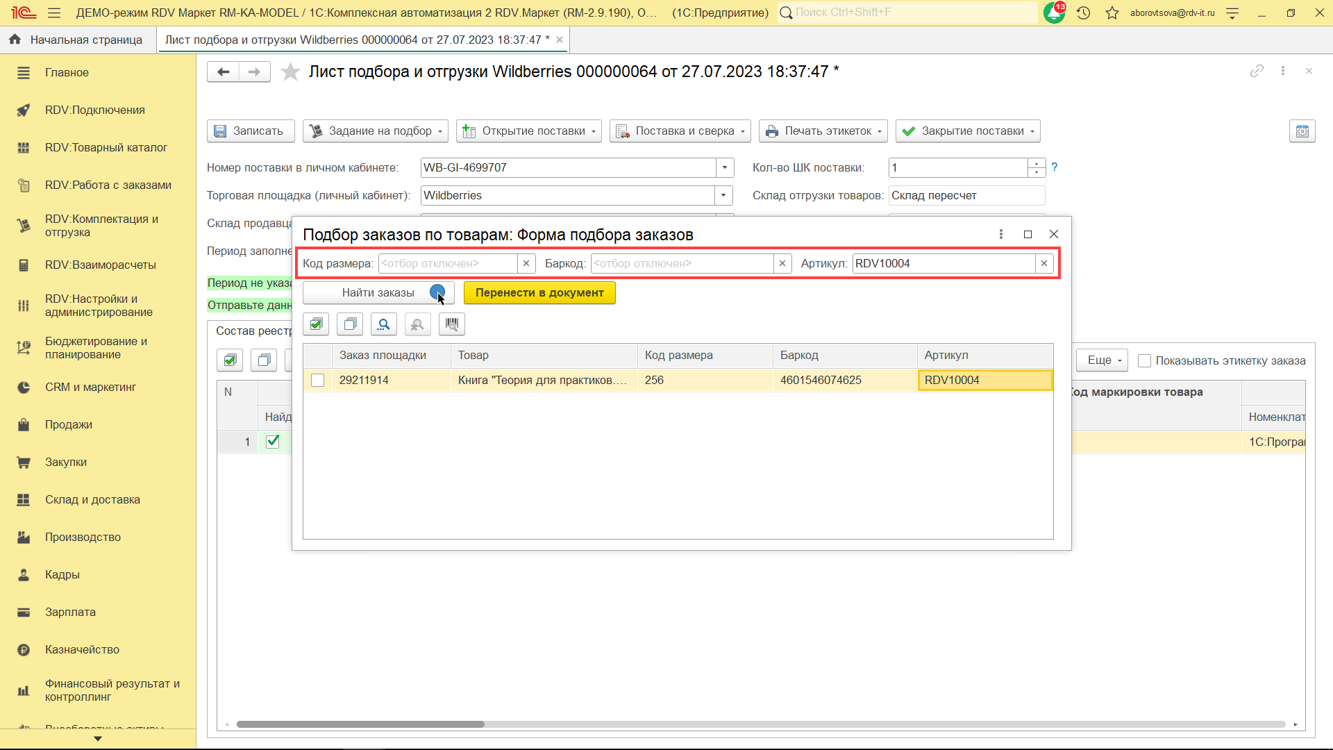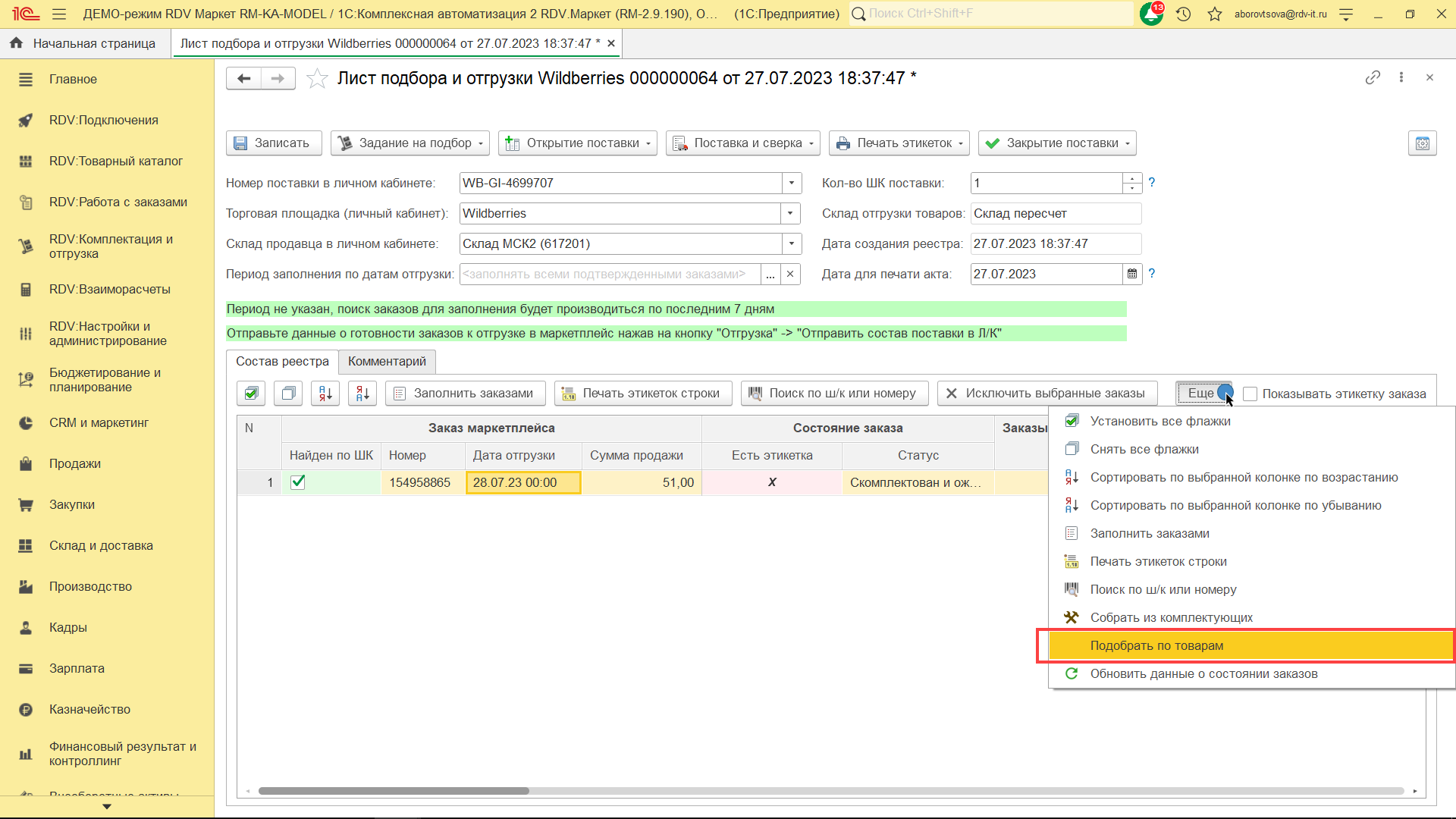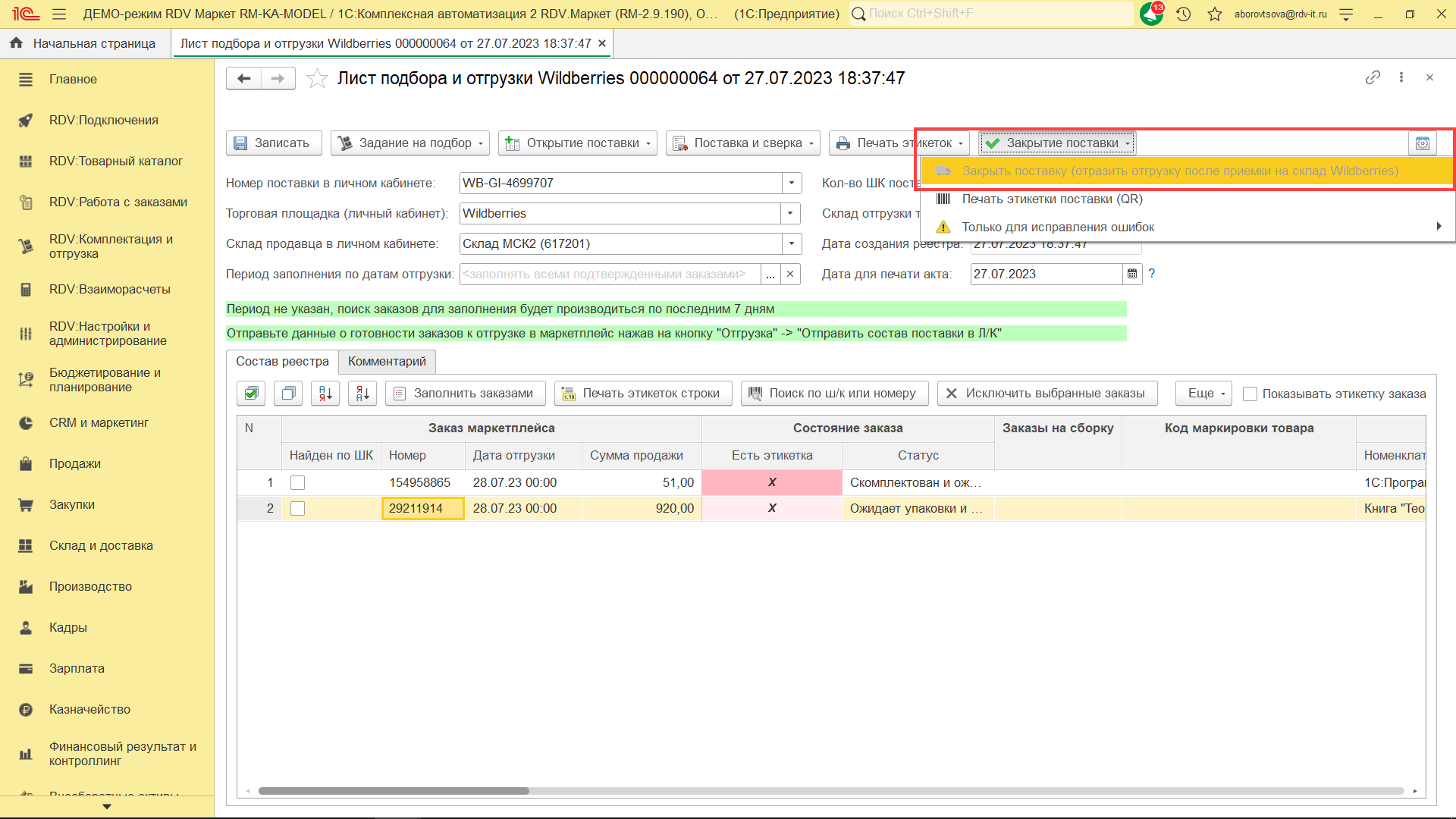 Для комплектации и отгрузки заказов Wildberries FBS, необходимо перейти в раздел "RDV: Комплектация и отгрузка" - "Реестры приема-передачи".