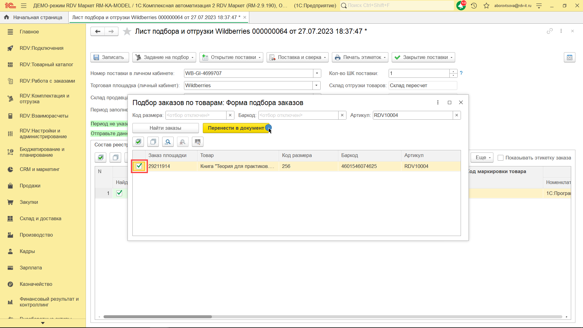 Установите флаг напротив заказов, которые вы хотите перенести в лист подбора, после чего нажмите на кнопку "Перенести в документ".