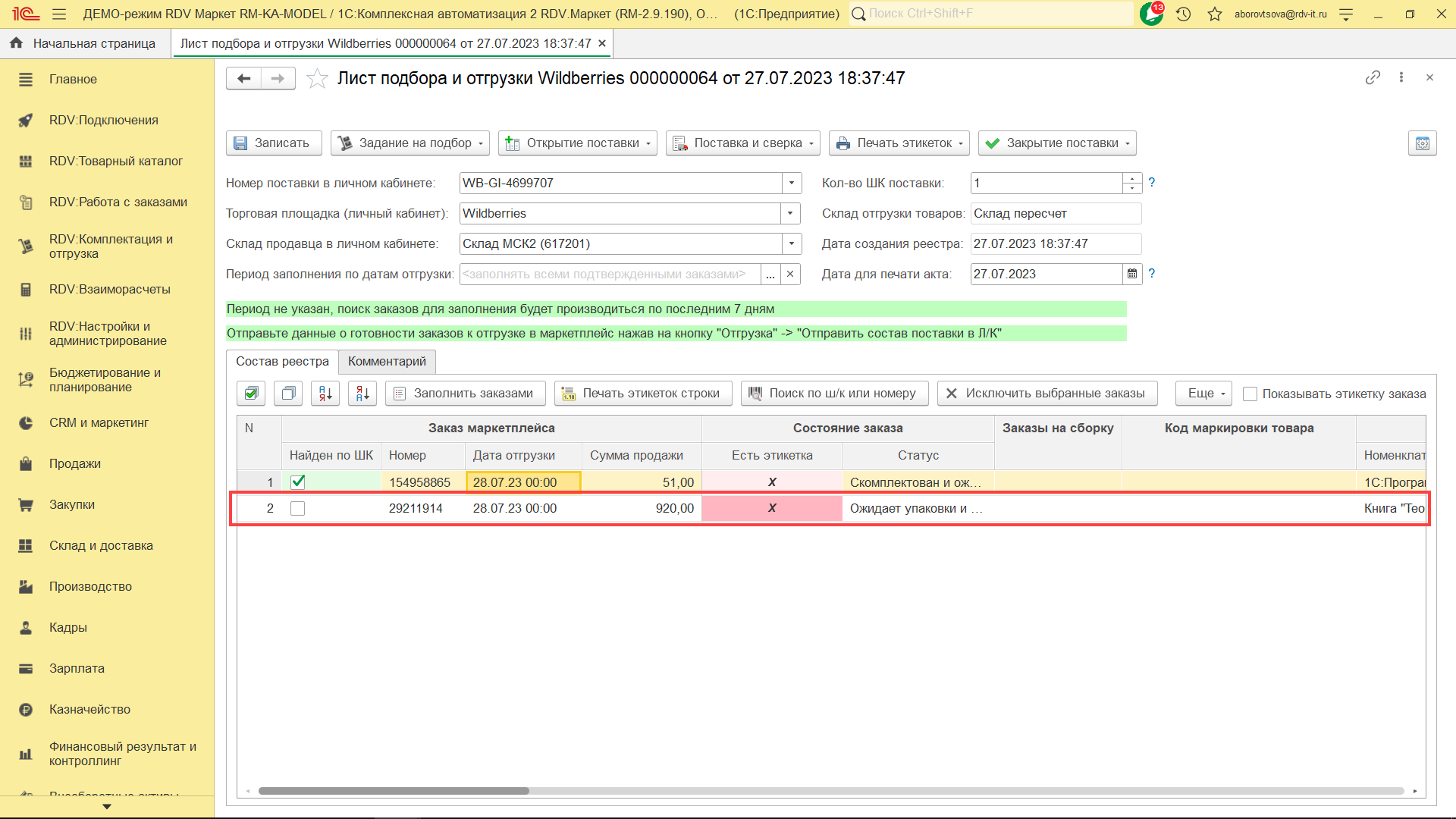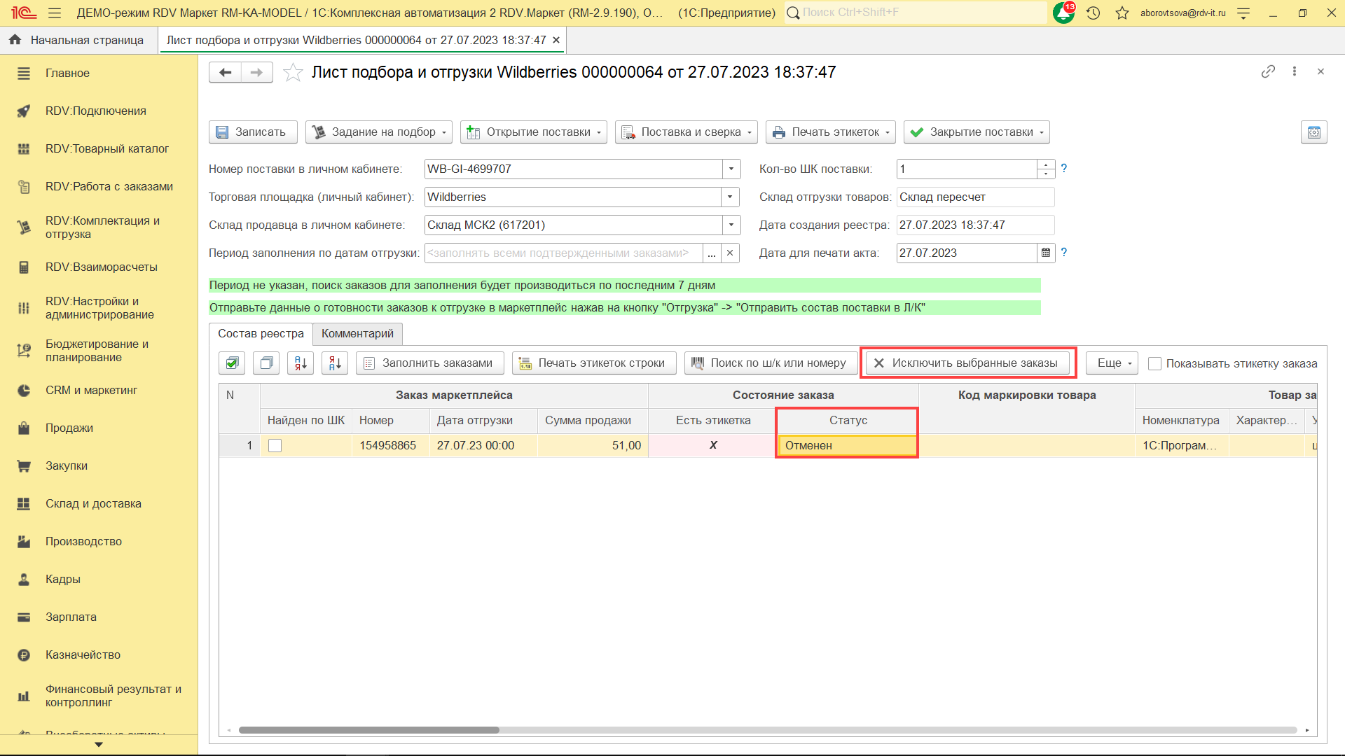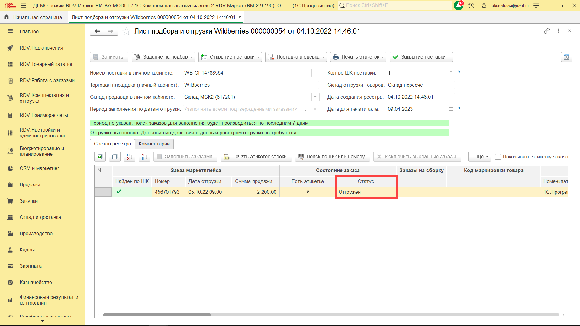 После отгрузки заказов на маркетплейс, RDV Маркет будет динамически получать от Wildberries обновление статуса заказов. Текущие статусы заказов можно будет увидеть в листе подбора и отгрузки, который был сформирован ранее: