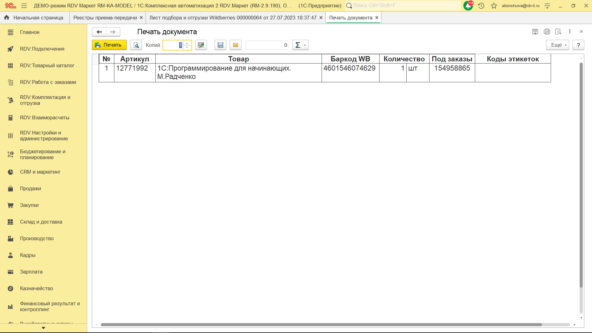 Далее необходимо распечатать задание на подбор товаров для сборки товаров под заказ.