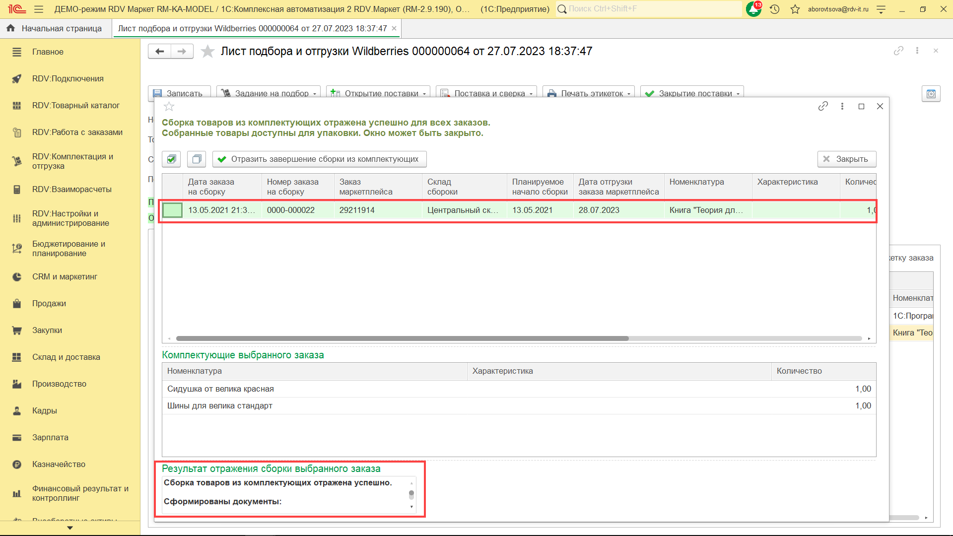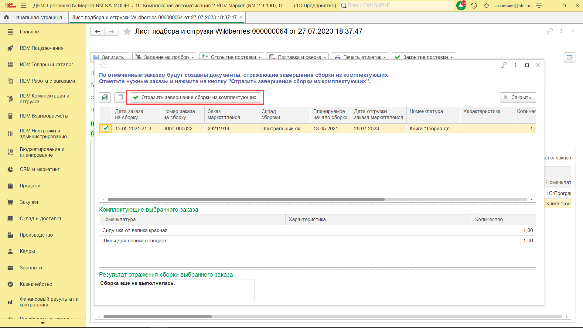 Система покажет цветом по каким заказам сборка была отражена (зелёный), а по каким нет (красный). В поле "Результат отражения сборки выбранного заказа" будет указана информация о созданных документах сборки (если закрытие сборки было отражено) или текст ошибки с информацией о причине, по которой не было отражено закрытие сборки.