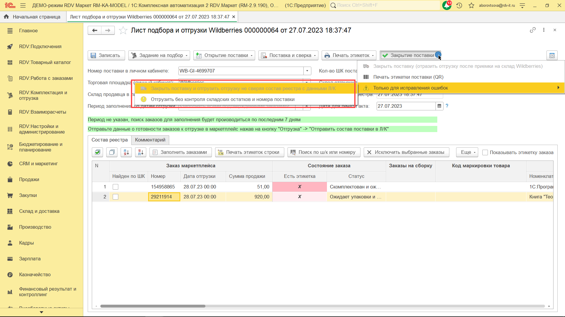 Важно! Отгрузка заказов - это обязательный этап, выполняющийся перед передачей заказов курьеру, который повезёт эти заказы на пункт приёма маркетплейса. При отгрузке листа подбора в системе RDV Маркет автоматически формируются документы "Перемещение товаров" и "Реализация товаров и услуг".