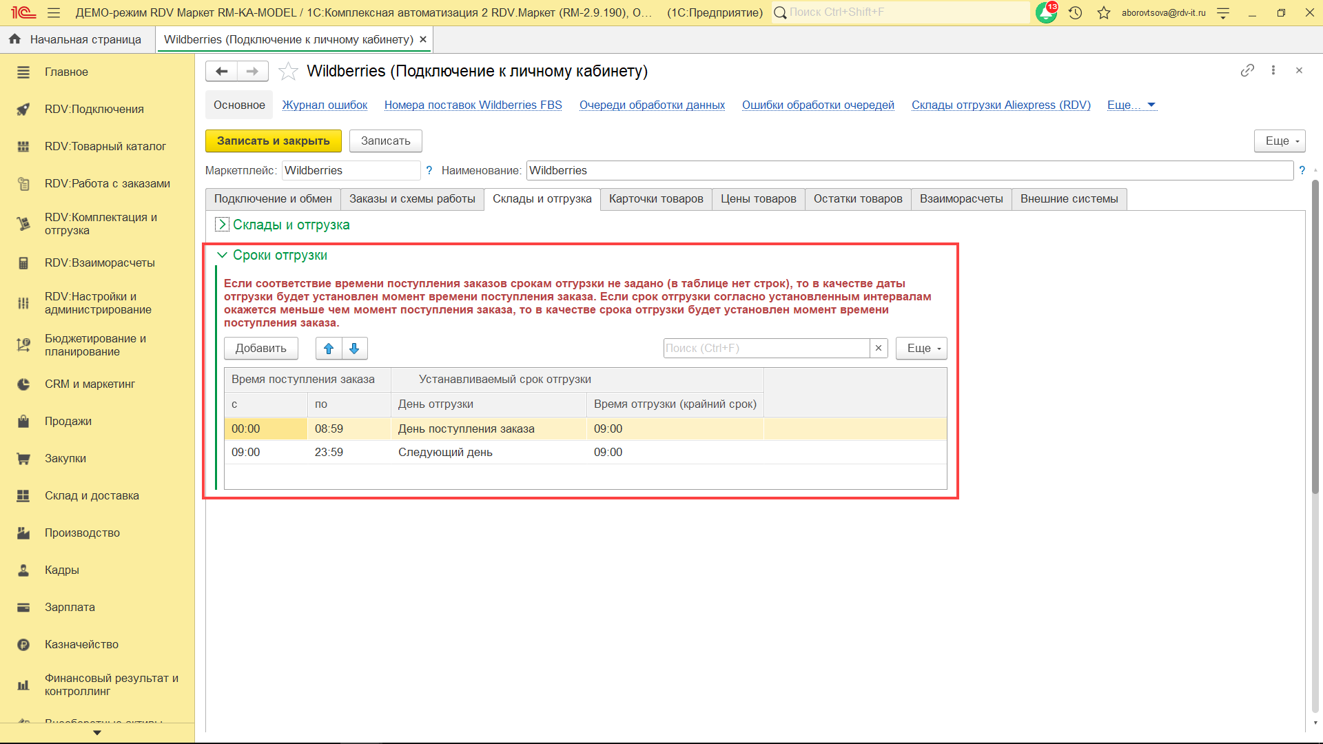Для того, чтобы указать срок отгрузки заказов Wildberries, необходимо перейти в настройки данного ЛК (через разделы "RDV: Настройки и администрирование" - "Подключения к личным кабинетам") на вкладку "Склады и отгрузка". При установке интервала, в листе подбора Wildberries будут отображаться заказы согласно установленным настройкам.