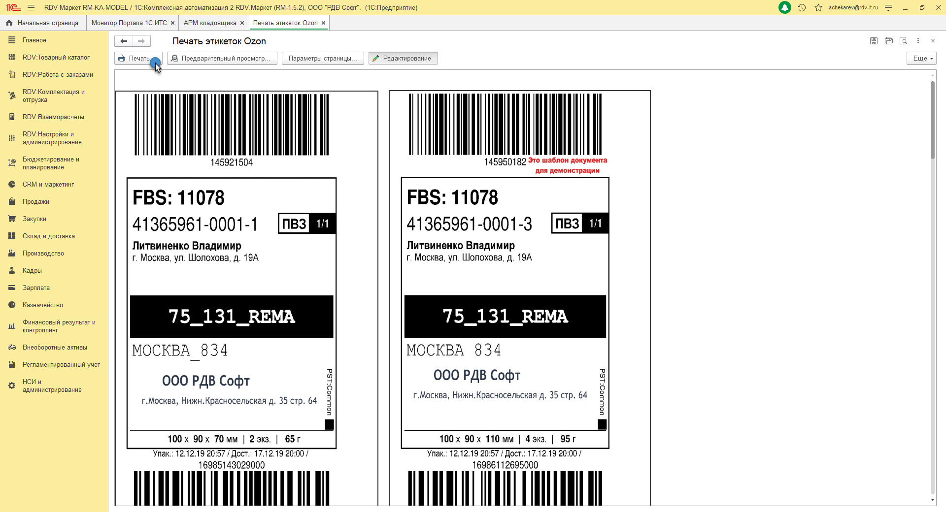 Вам откроется окно для печати этикеток Ozon - нажмите на кнопку "Печать":