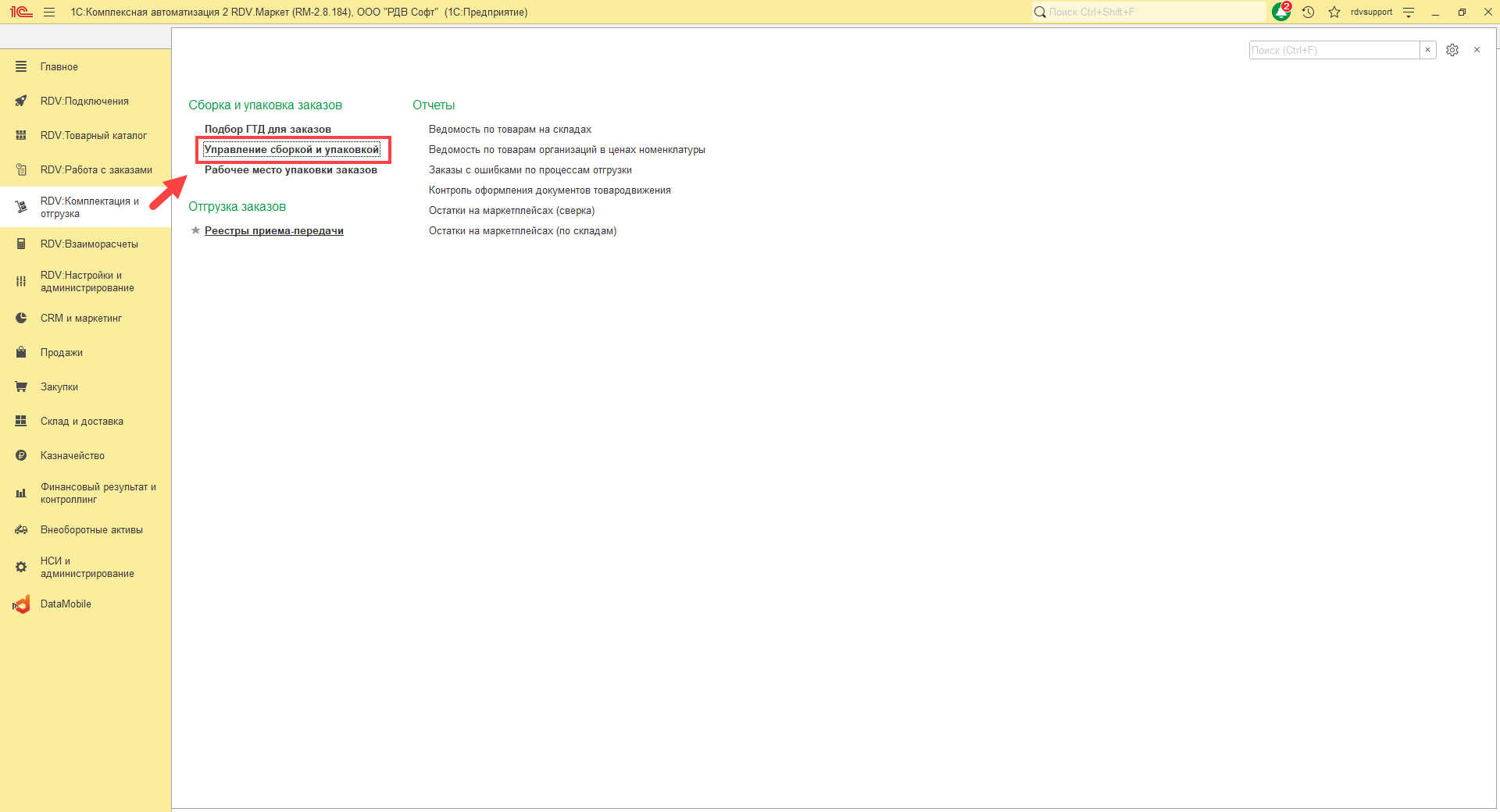 Комплектация и упаковка заказов выполняется в рабочем месте "Управление сборкой и упаковкой":