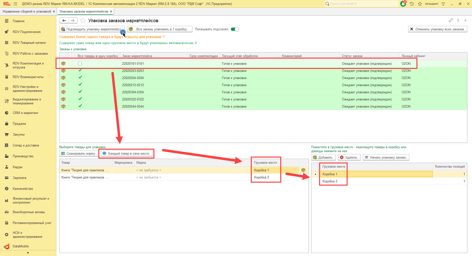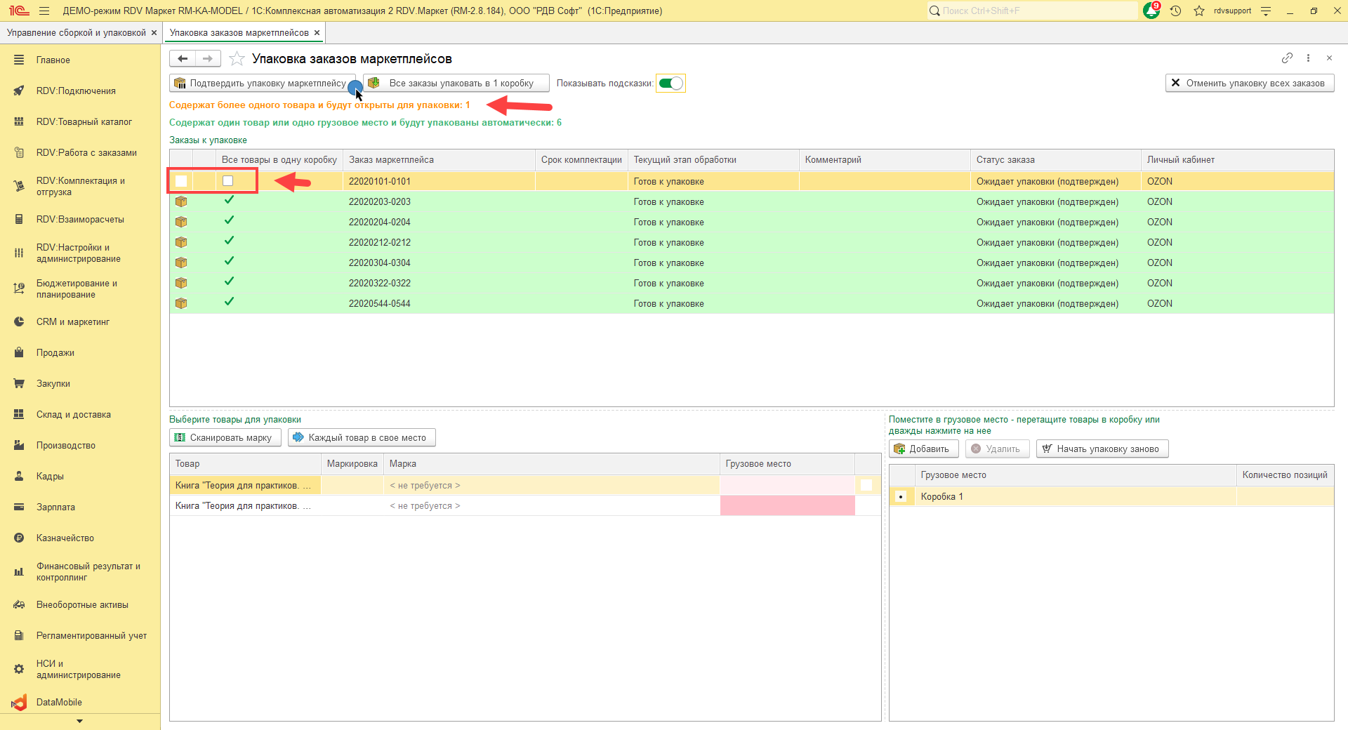 Если товаров в заказе несколько, то модуль RDV.Маркет предложит выбор - упаковать товар в одно грузовое место или несколько. Для упаковки товаров в одно грузовое место, поставьте соответствующий флаг и нажмите не кнопку "Подтвердить упаковку":