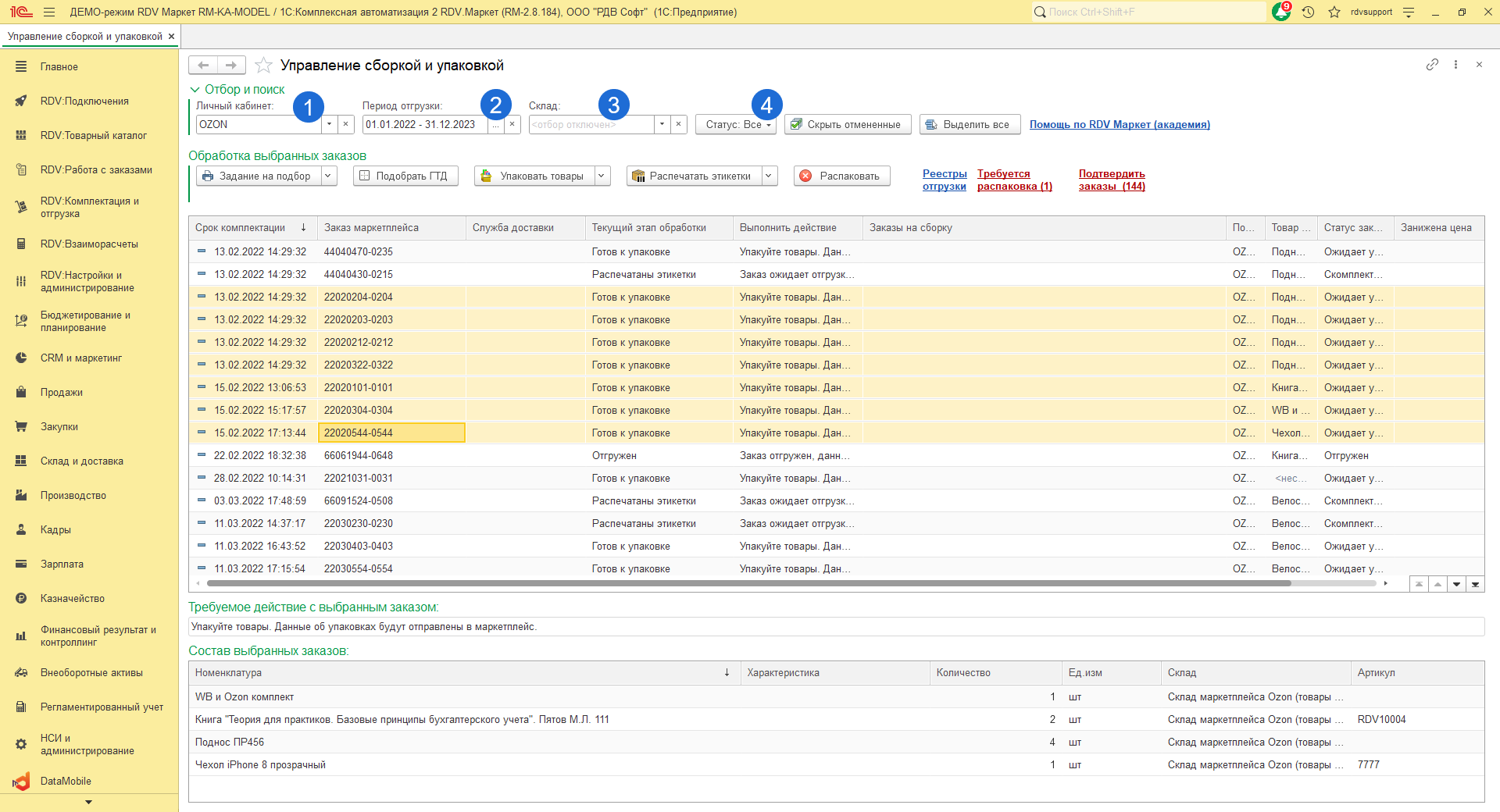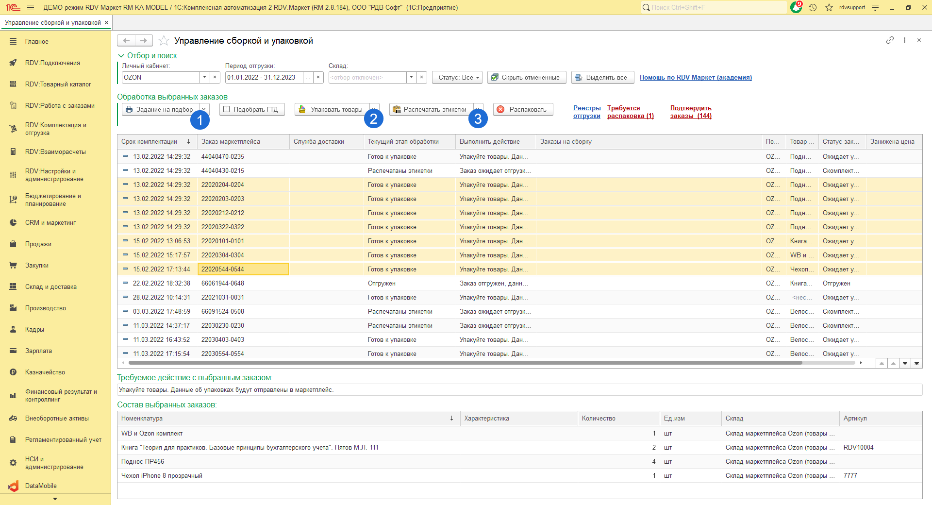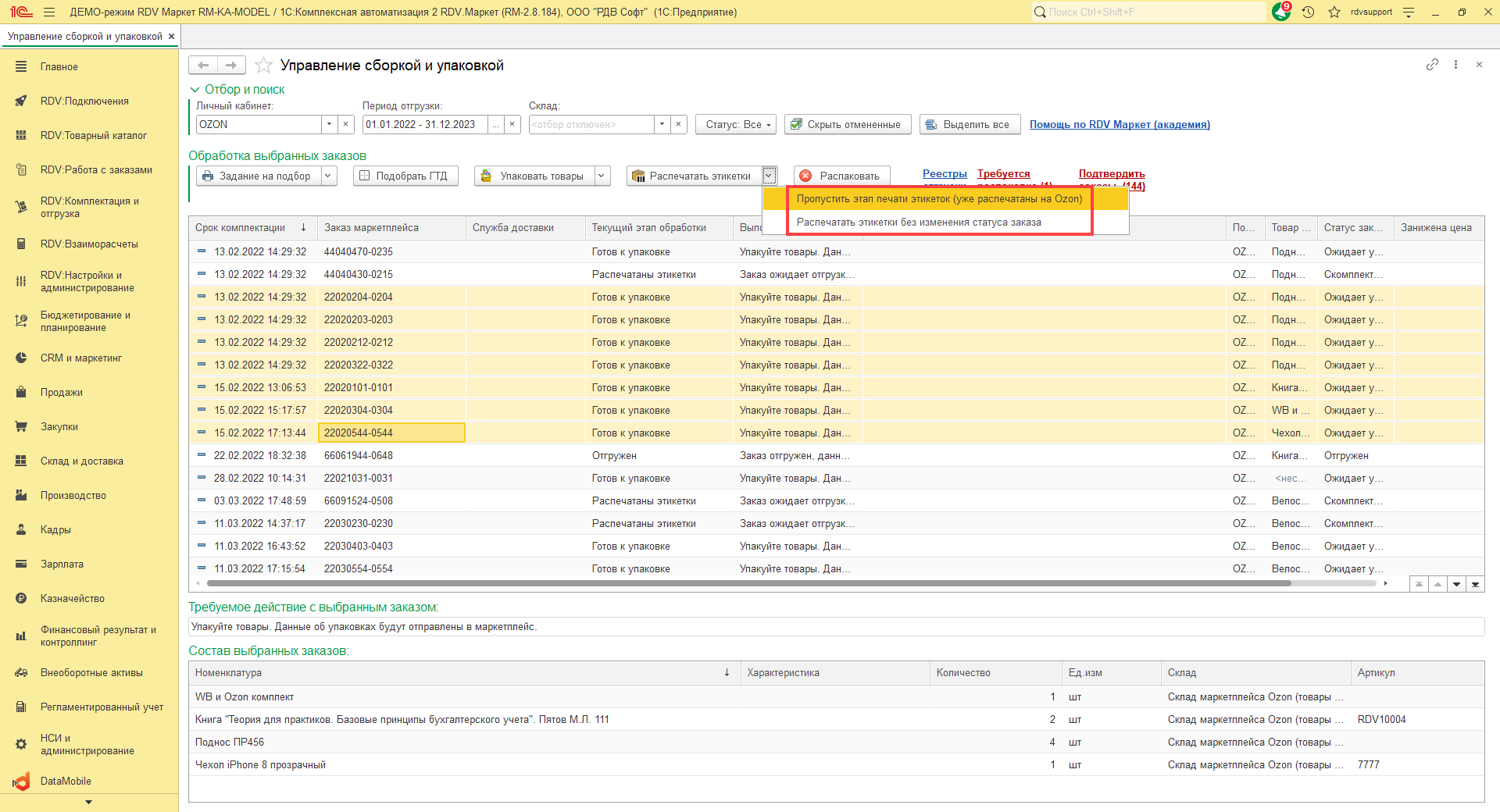 Нажатие на данную кнопку упаковывает товары по выбранным заказам, отправляет статус об упаковке на Ozon, запрашивает информацию о грузовых местах.