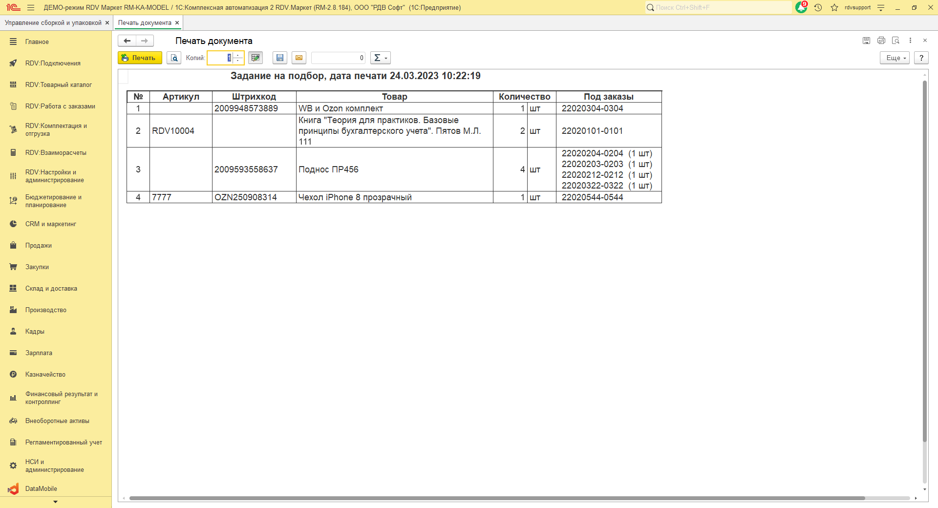 При выборе нескольких заказов и нажатии на кнопку "Задание на подбор", открывается печатная форма задания на подбор: