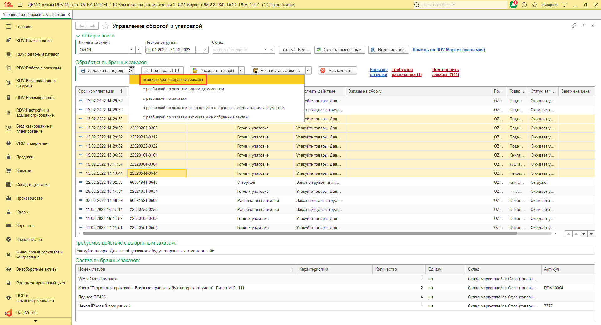Для начала сборки заказа необходимо выделить его и последовательно пройти следующие этапы: