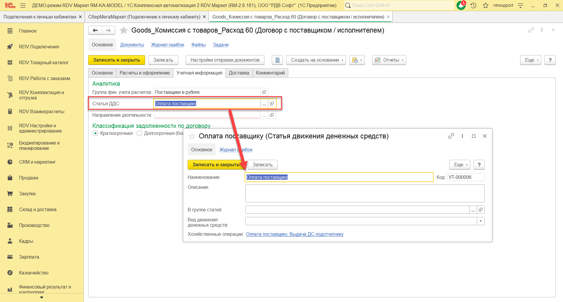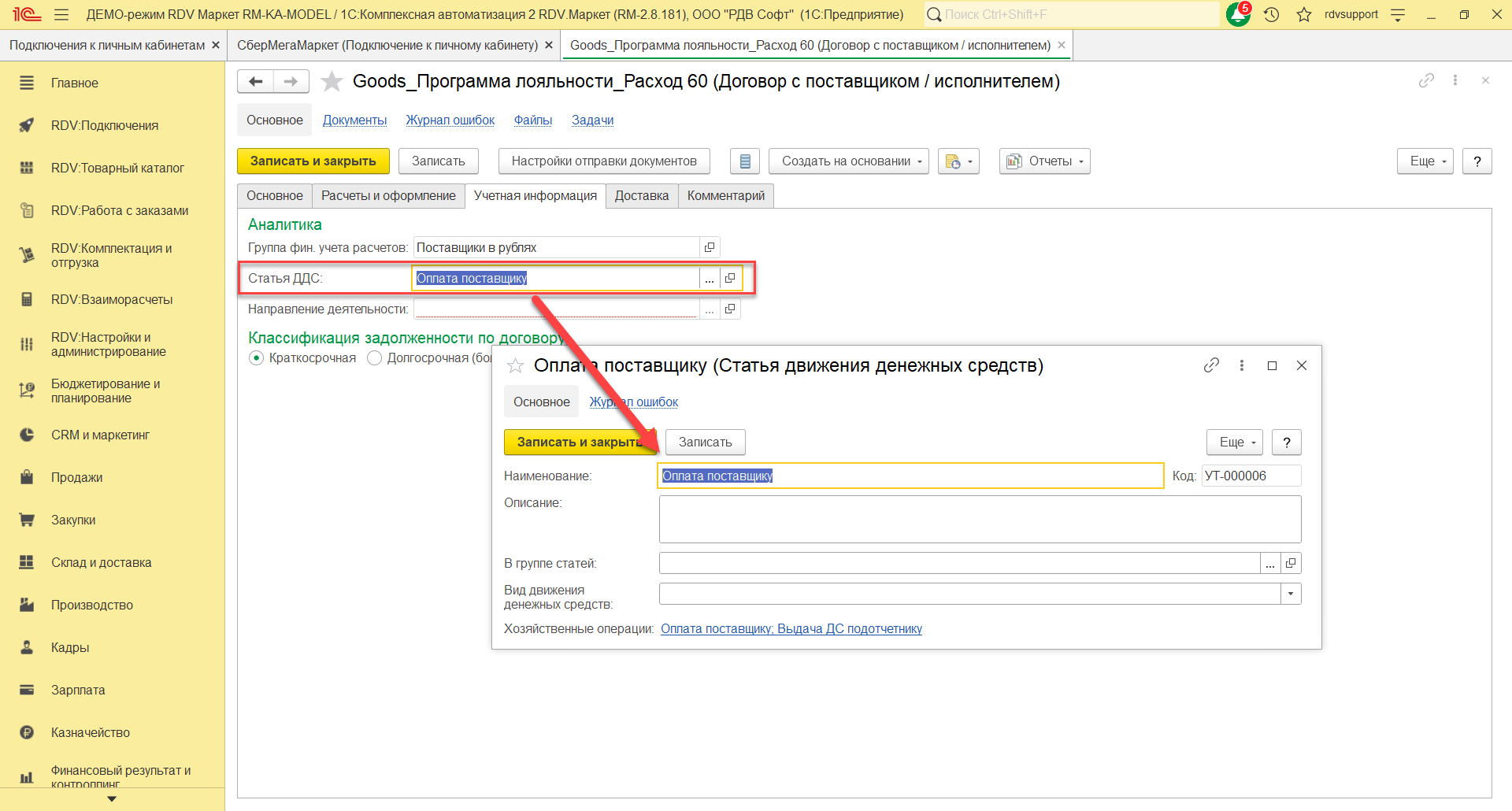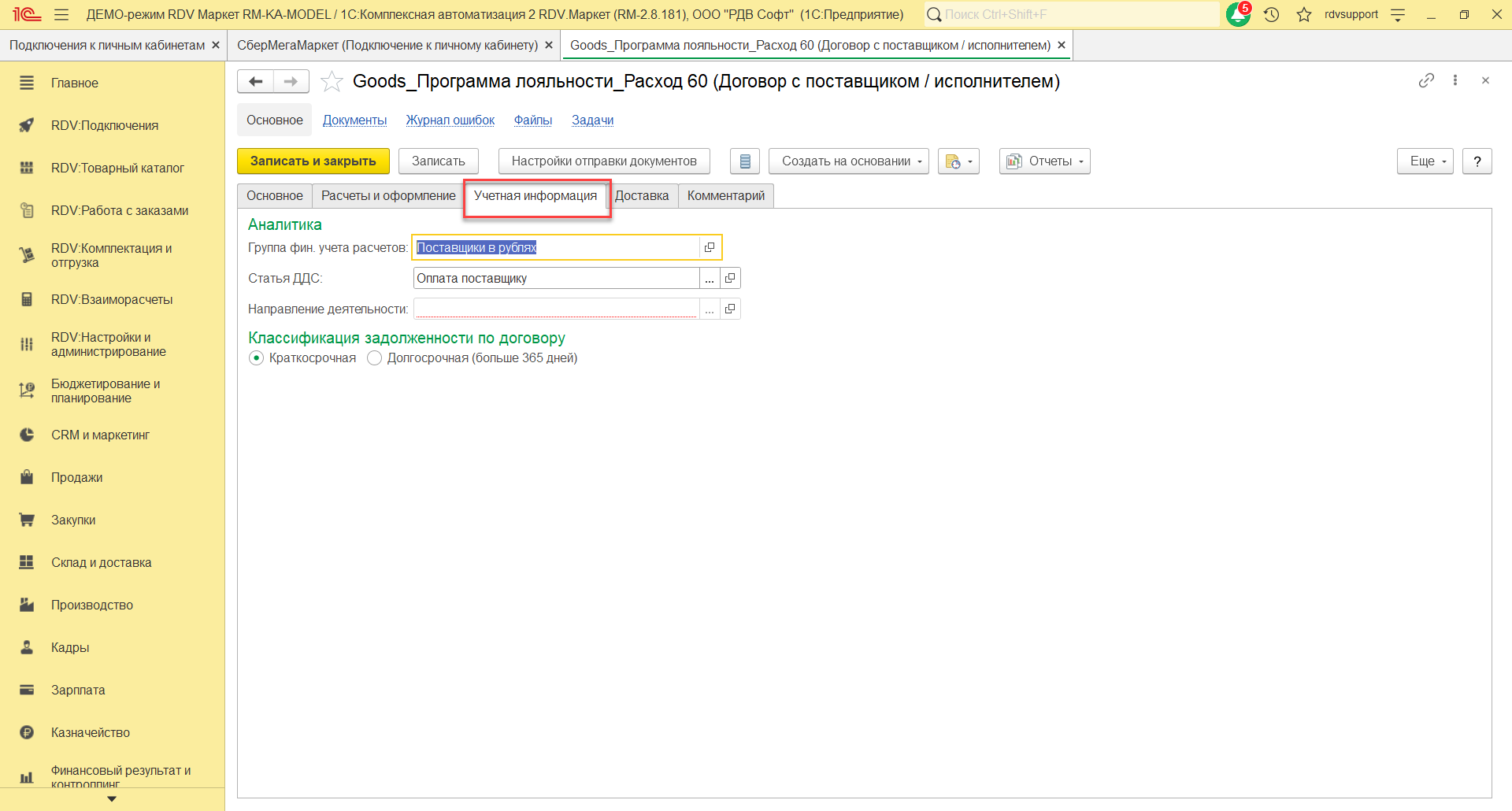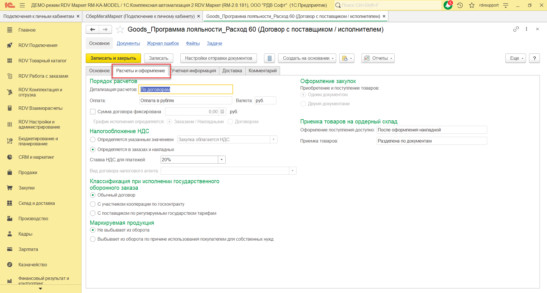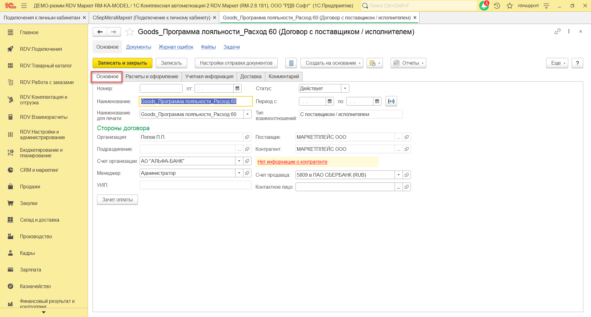 На закладке Основное нужно указать наименование договора "Goods_Программа лояльности_Расход 60", организацию, счет, статус, покупателя, контрагента, тип взаимоотношений. На закладке Расчеты и оформление указать детализацию расчетов, оплату, налогообложение НДС.
