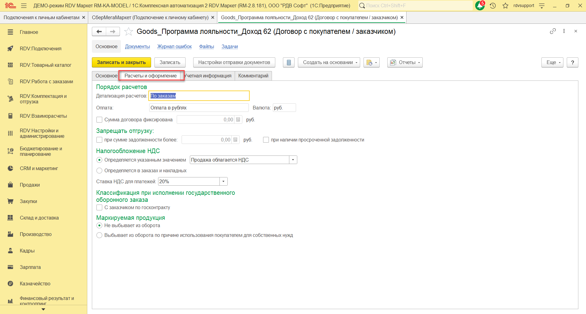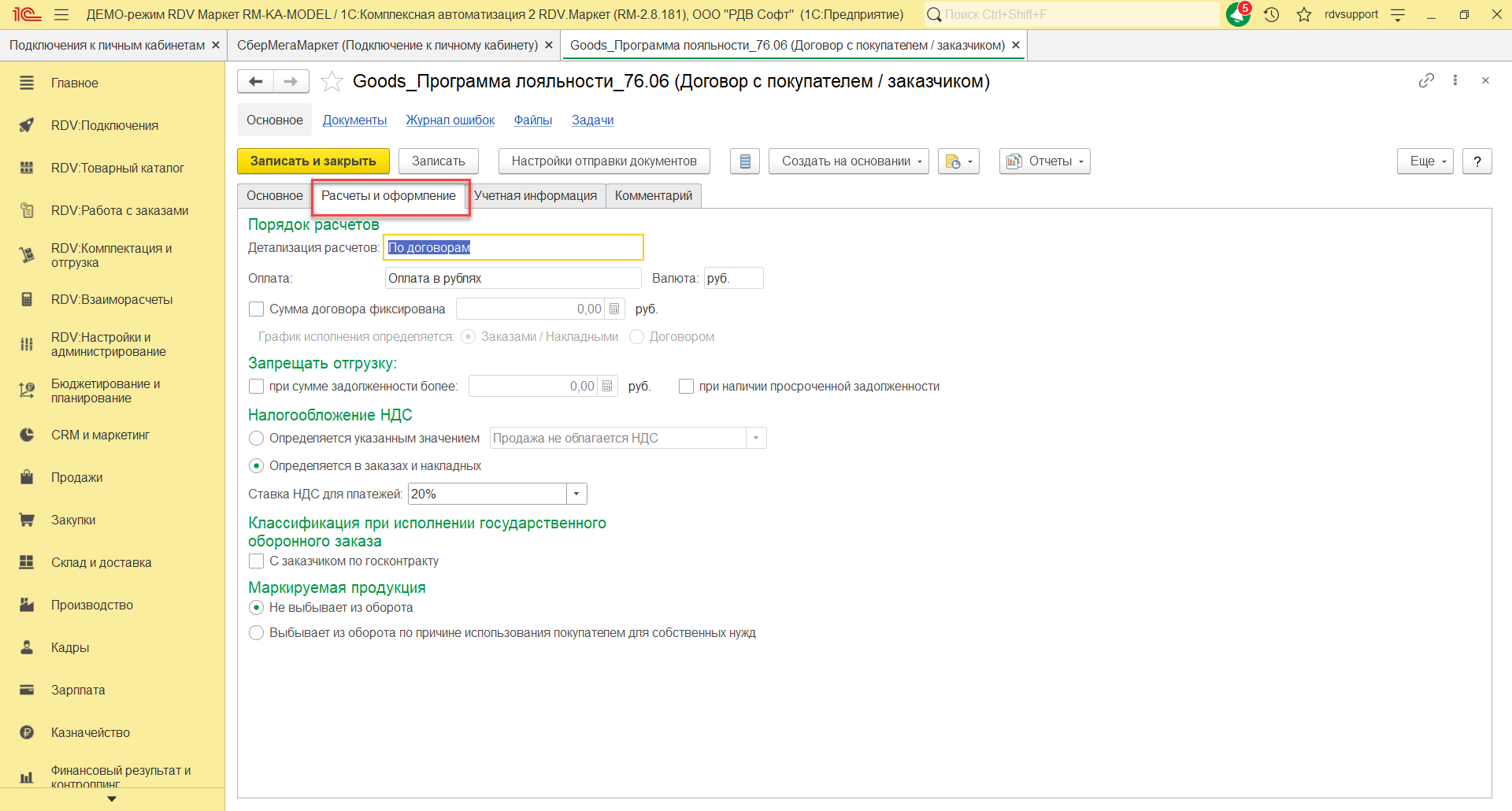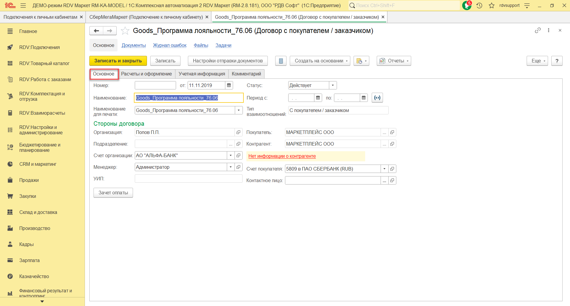 На закладке Основное нужно указать наименование договора "Goods_Программа лояльности_76.06", организацию, счет, статус, покупателя, контрагента, тип взаимоотношений. На закладке Расчеты и оформление указать детализацию расчетов, оплату, налогообложение НДС.