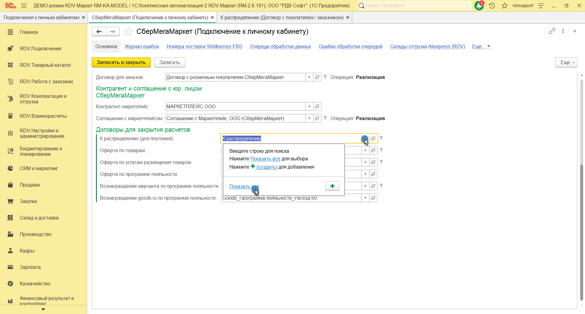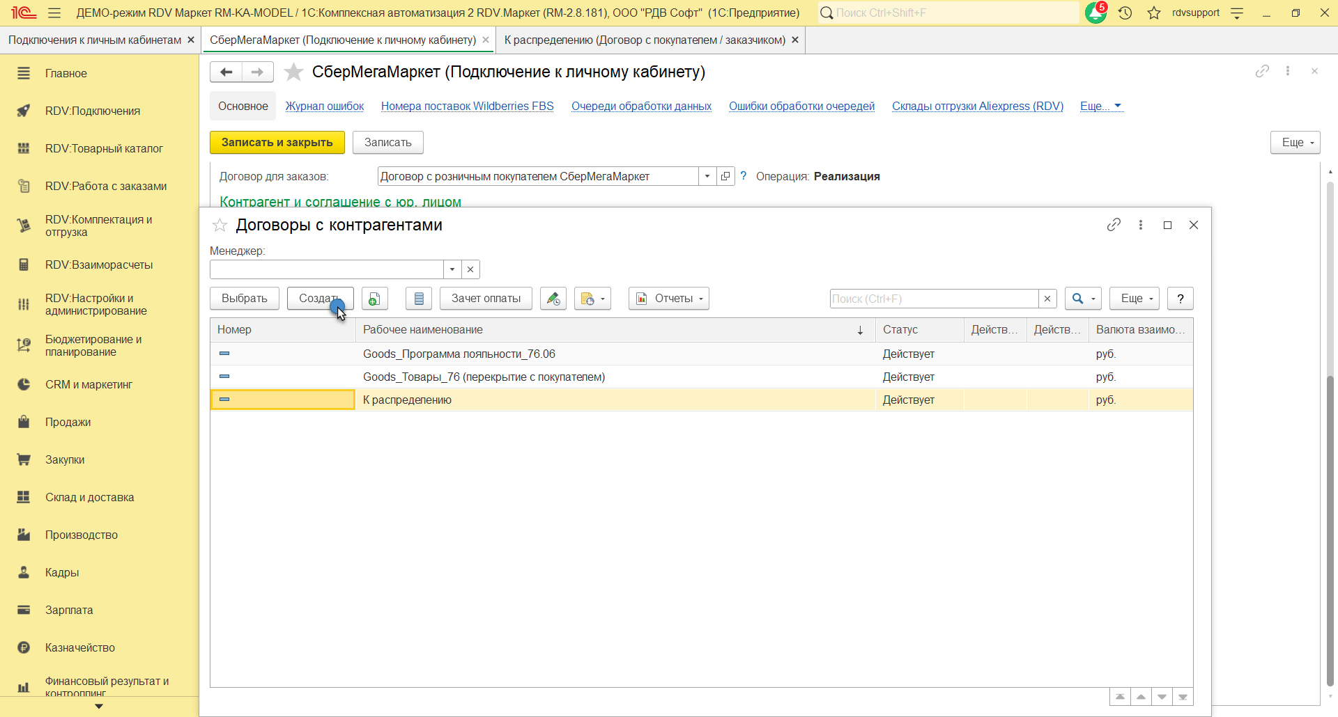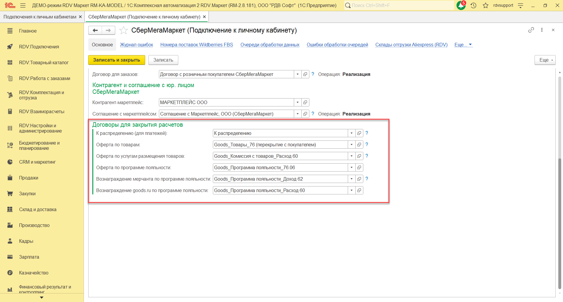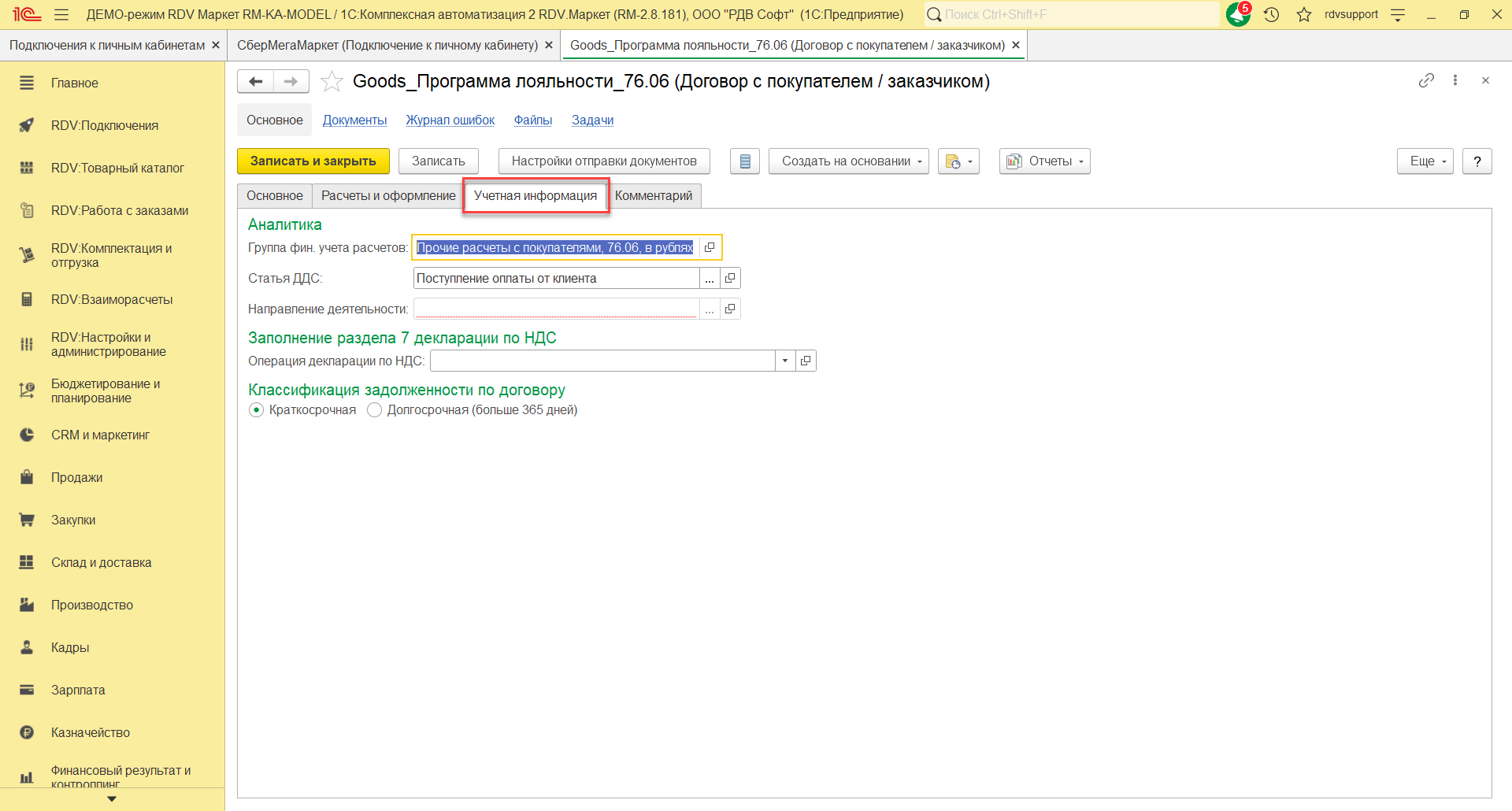 На закладке Основное нужно указать наименование договора "Goods_Программа лояльности_76.06", организацию, счет, статус, покупателя, контрагента, тип взаимоотношений. На закладке Расчеты и оформление указать детализацию расчетов, оплату, налогообложение НДС.
