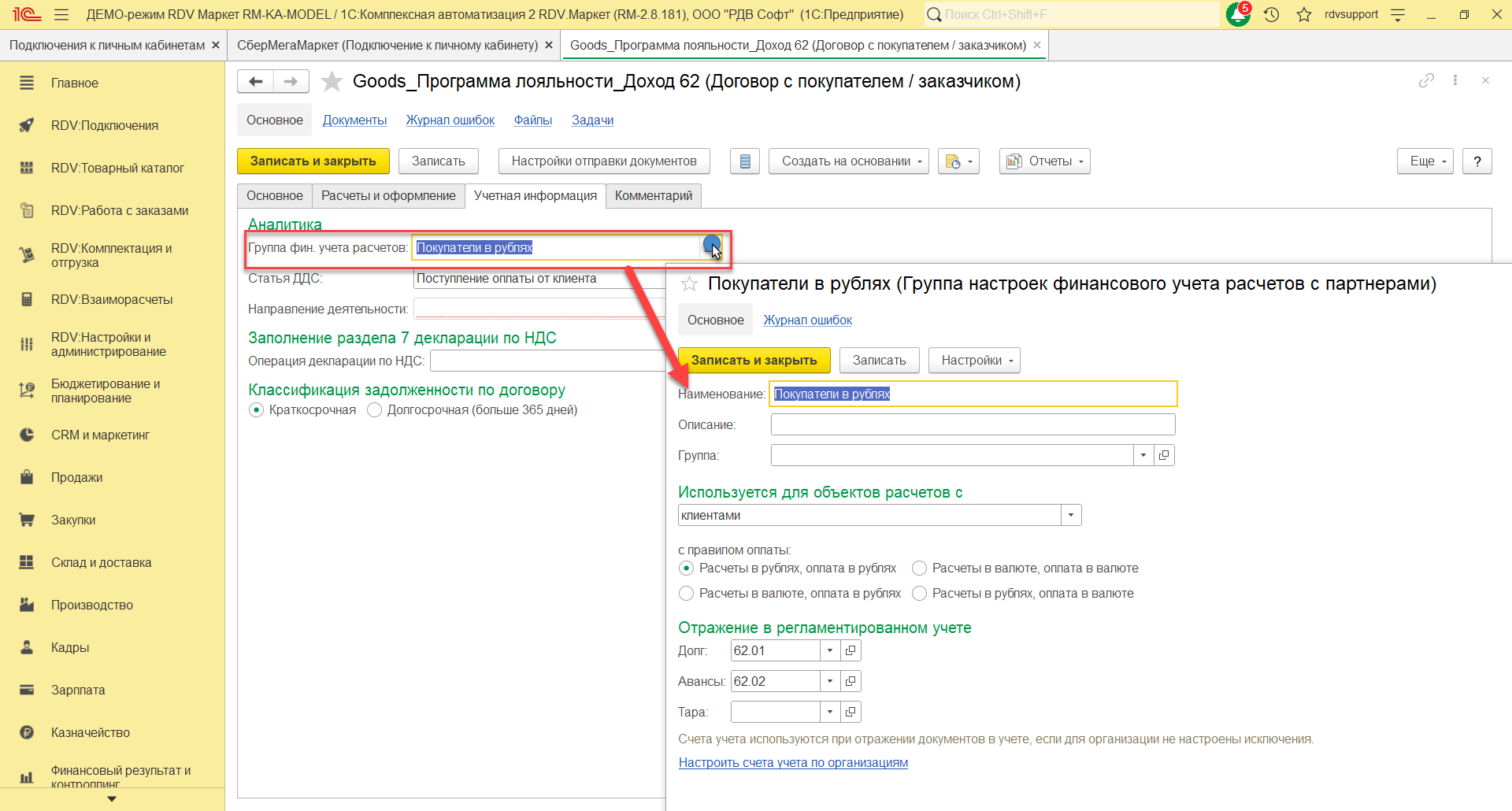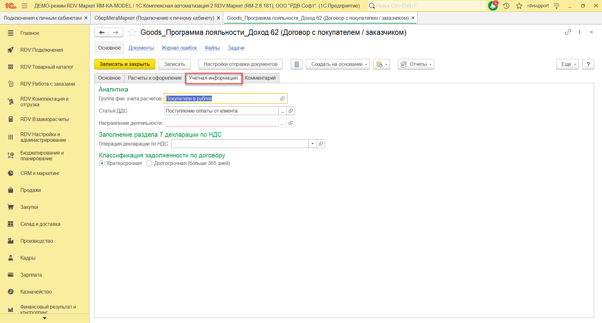 На закладке Основное нужно указать наименование договора "Goods_Программа лояльности_Доход 62", организацию, счет, статус, покупателя, контрагента, тип взаимоотношений. На закладке Расчеты и оформление указать детализацию расчетов, оплату, налогообложение НДС.