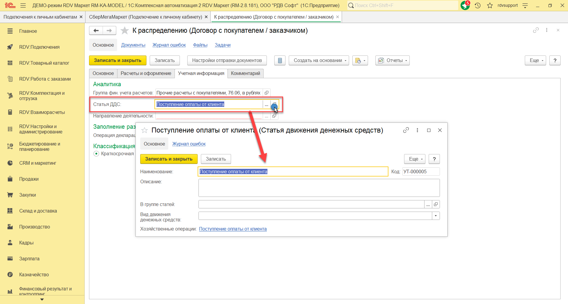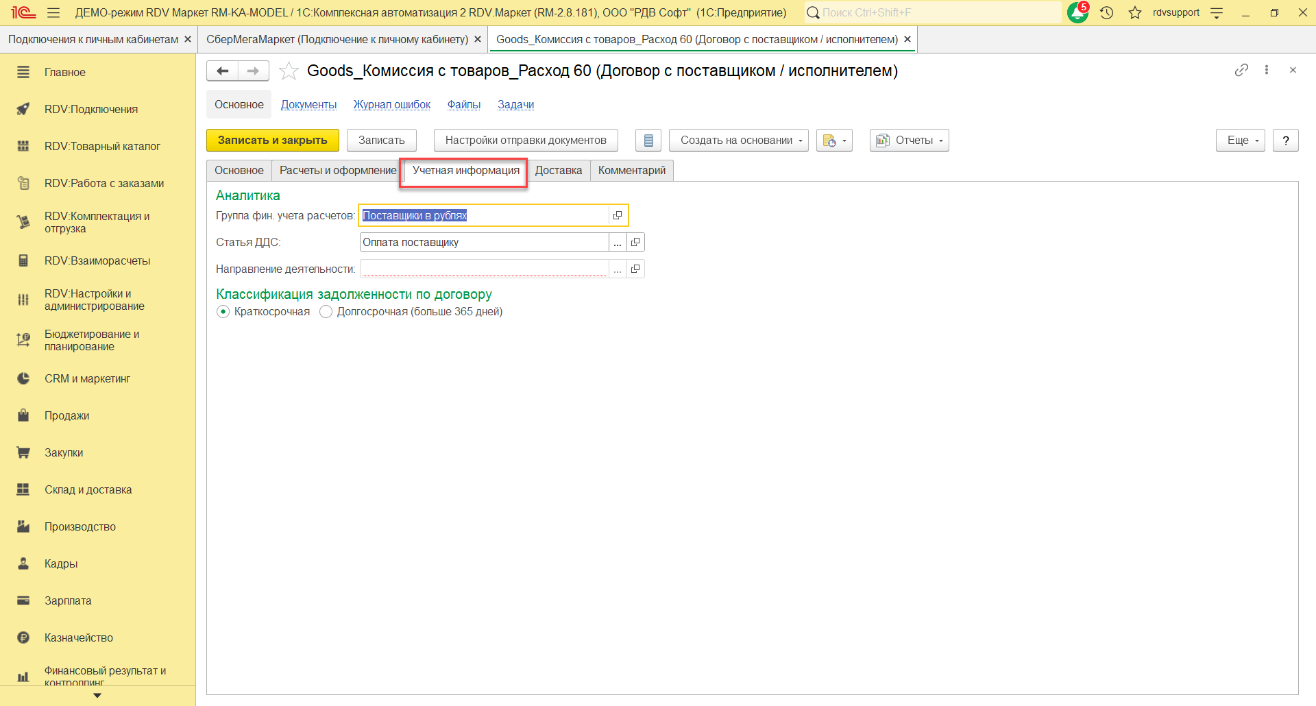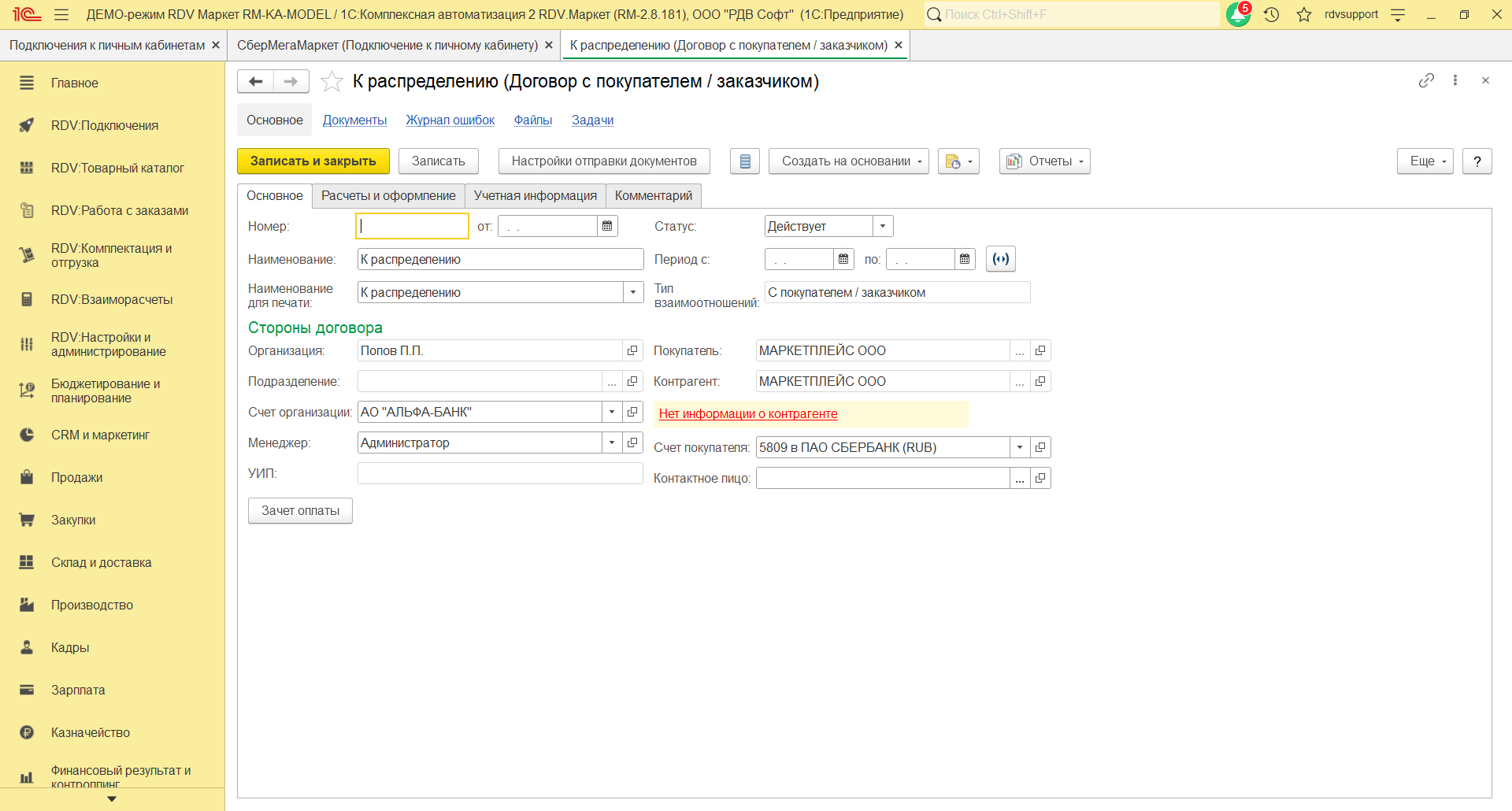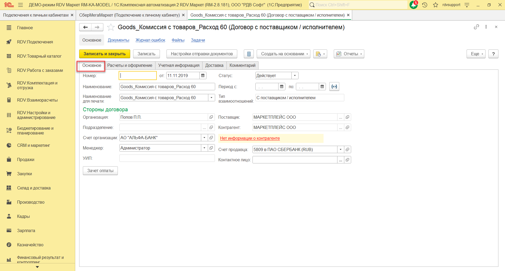 На закладке Основное нужно указать наименование договора, организацию, счет, статус, покупателя, контрагента, тип взаимоотношений