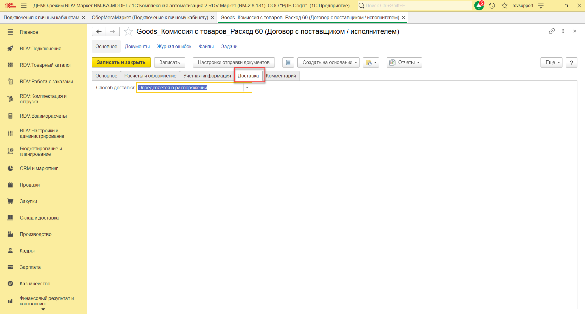 На закладке Основное нужно указать наименование договора "Goods_Комиссия с товаров_Расход 60", организацию, счет, статус, покупателя, контрагента, тип взаимоотношений. На закладке Расчеты и оформление указать детализацию расчетов, оплату, налогообложение НДС.