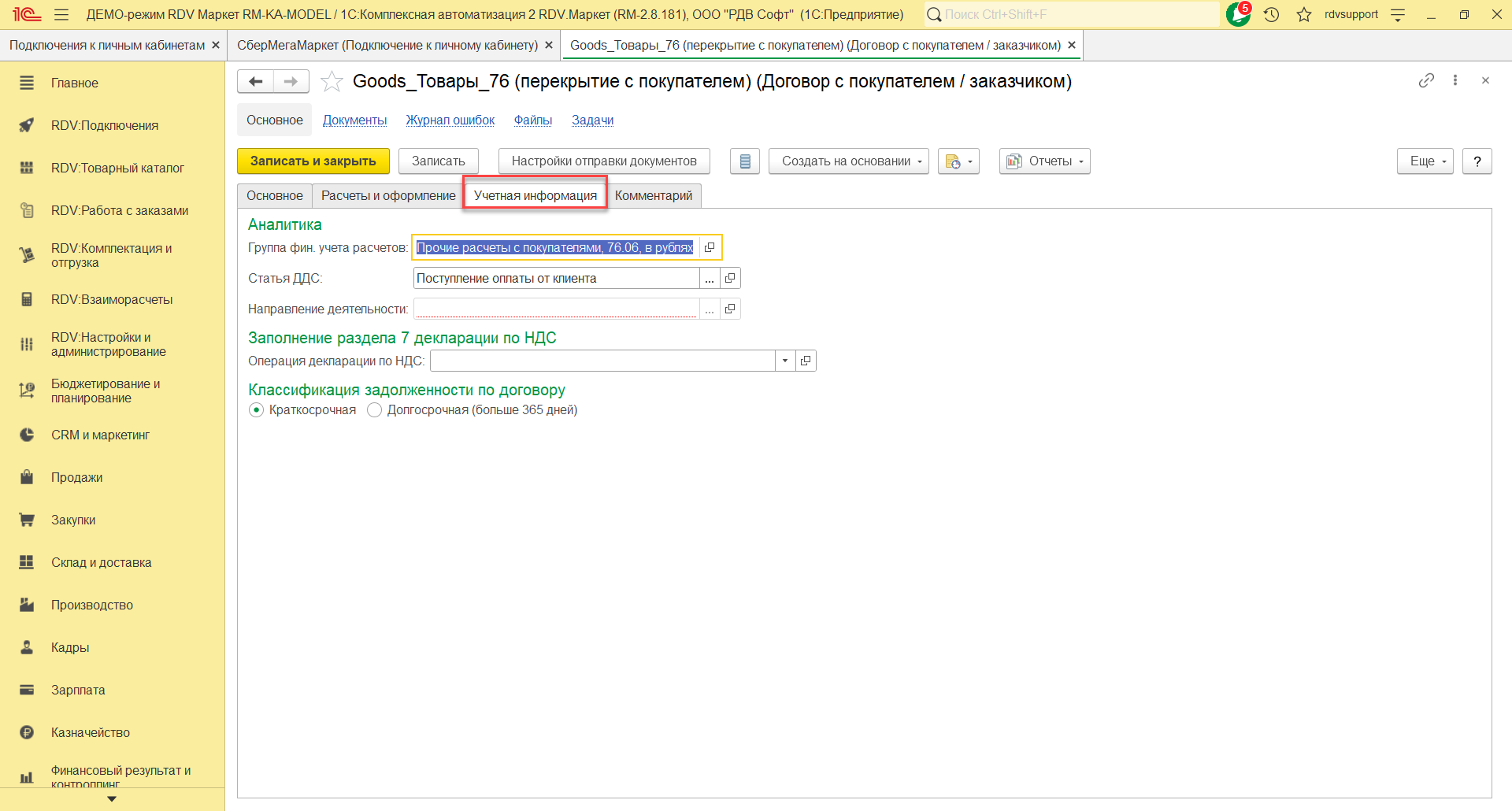 На закладке Основное нужно указать наименование договора "Goods_Товары_76 (перекрытие с покупателем)", организацию, счет, статус, покупателя, контрагента, тип взаимоотношений