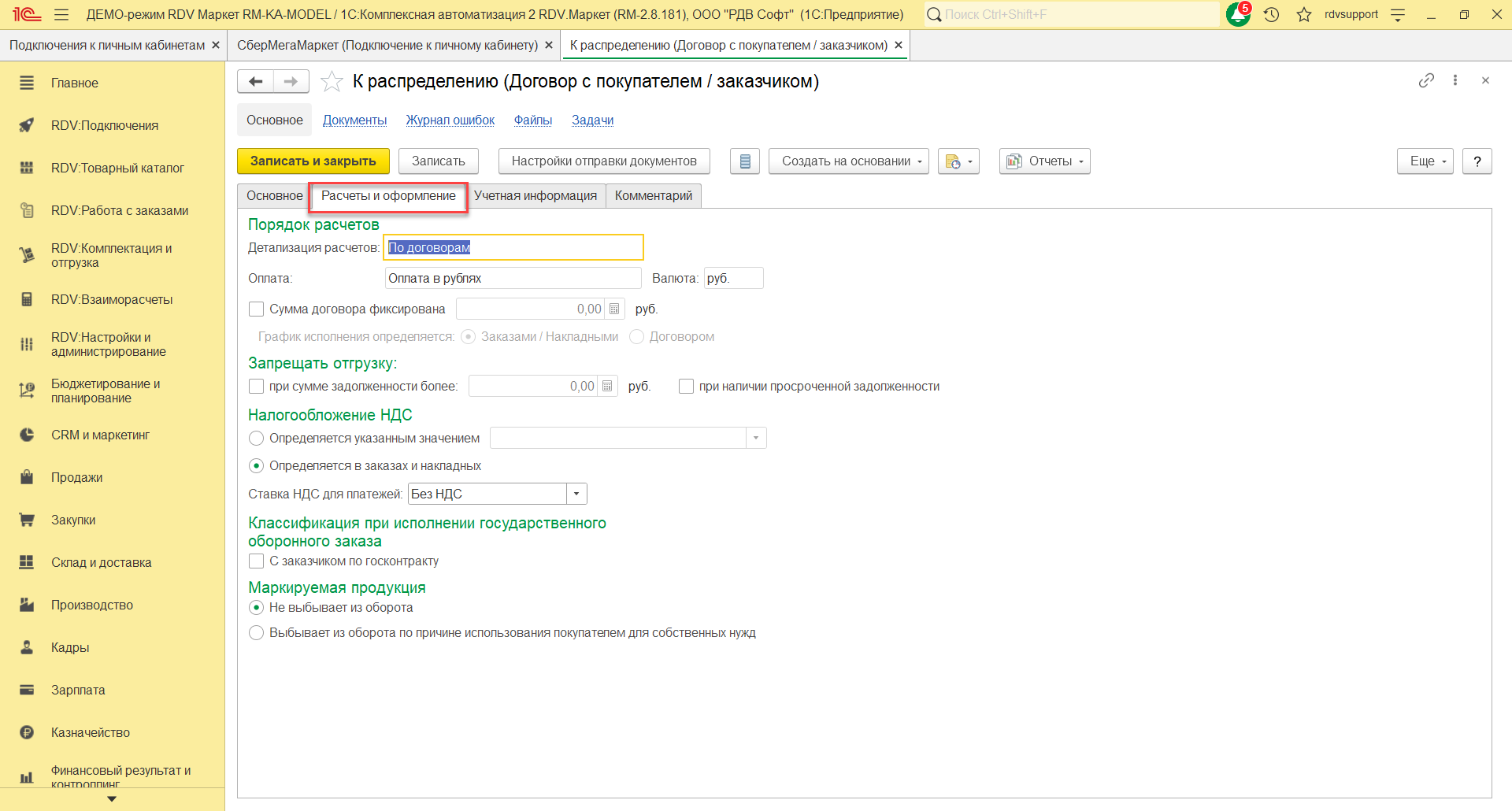 На закладке Расчеты и оформление указать детализацию расчетов, оплату, налогообложение НДС