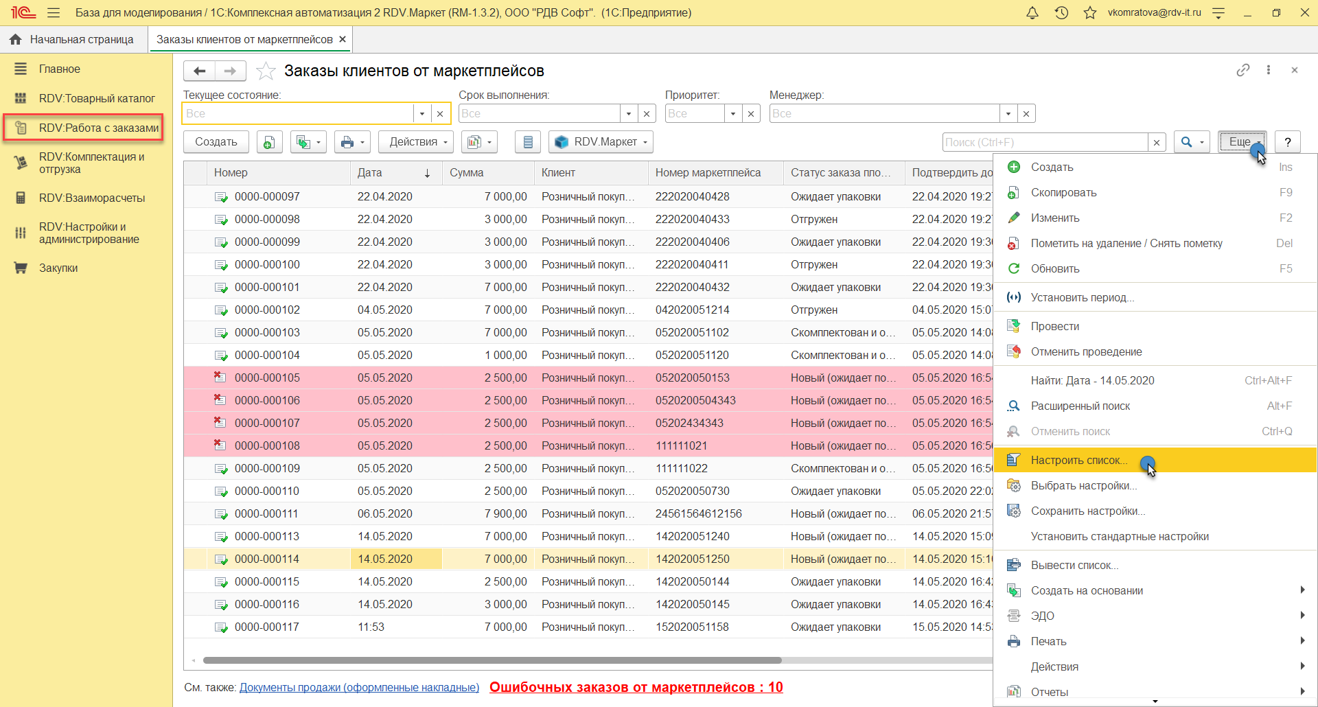 Для отображения в списке заказов, требующих обработки (подтверждения или отмены), необходимо перейти в меню "Еще" и выбрать пункт "Настроить список".
