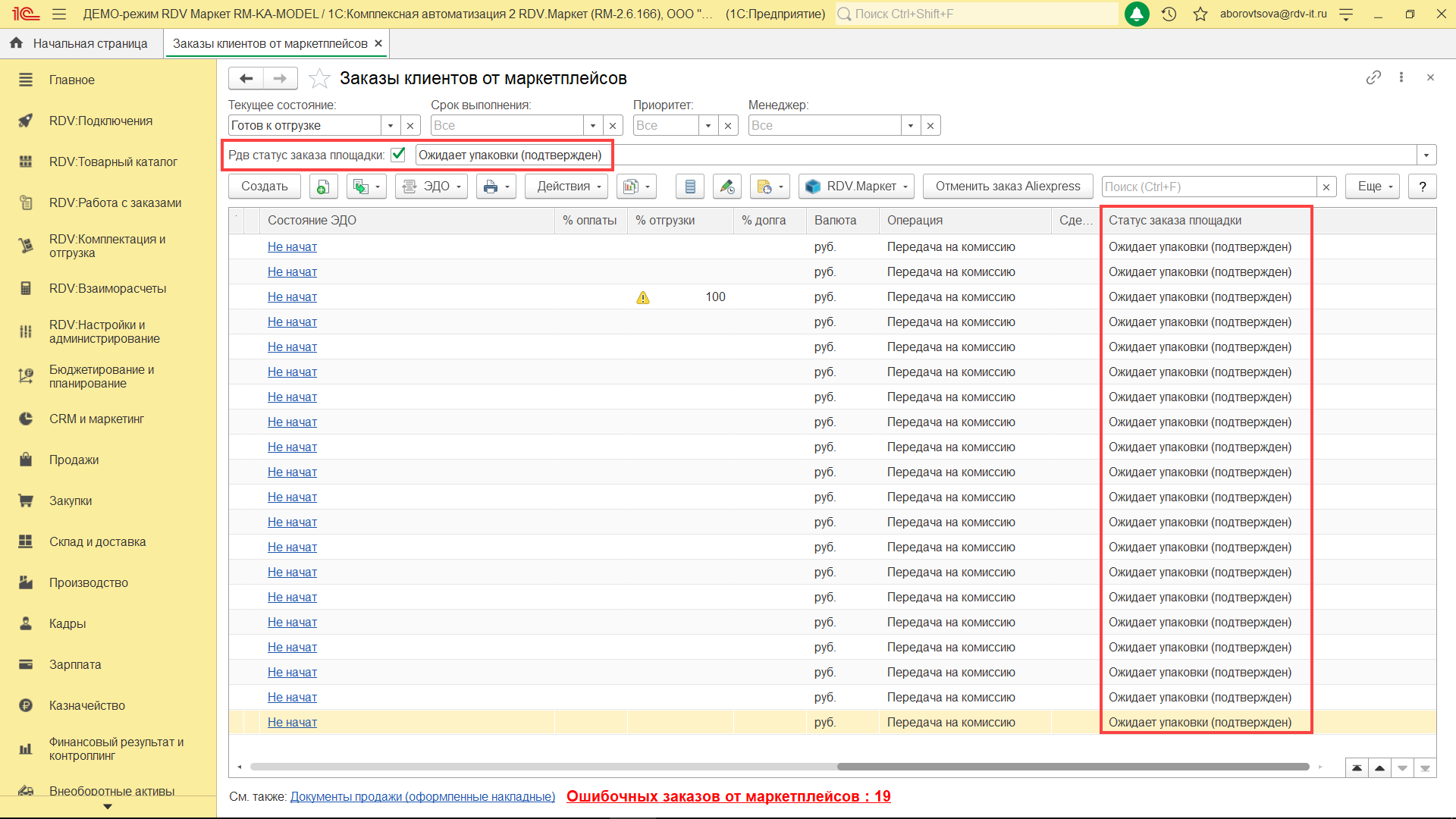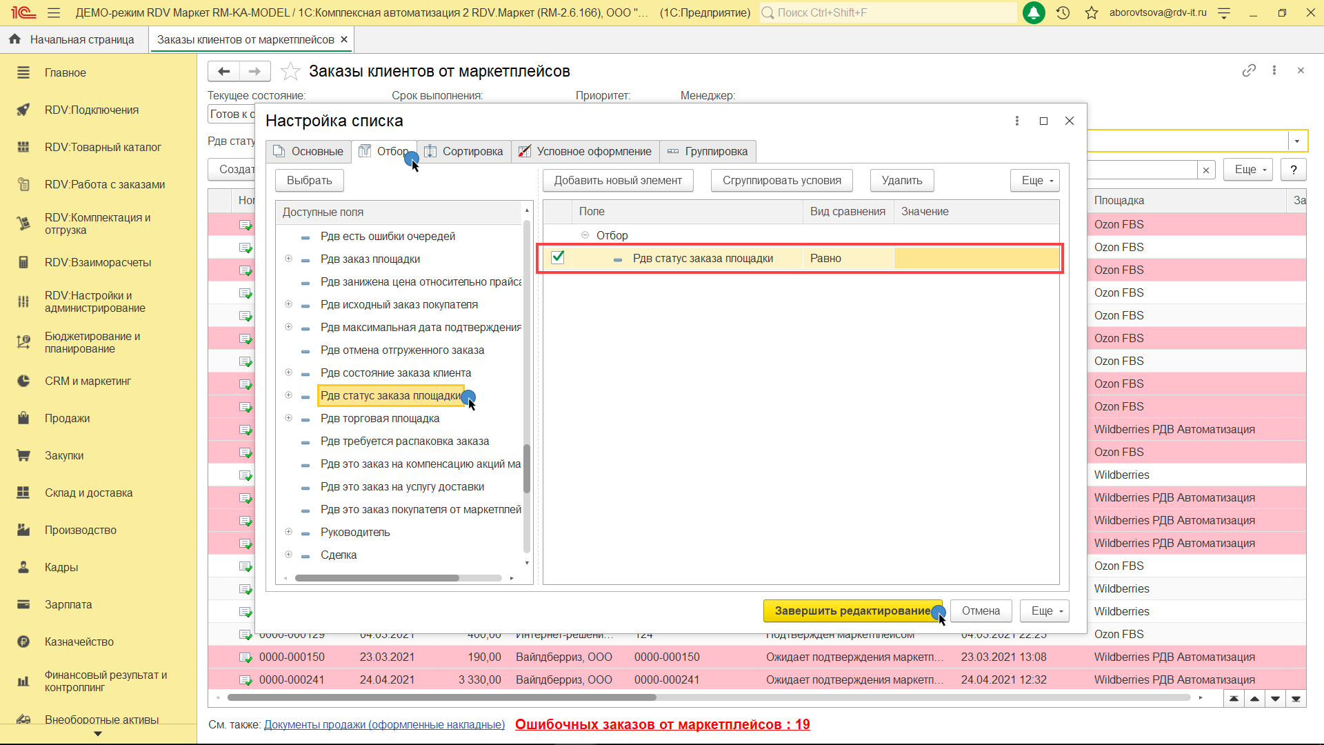 После этого в списке заказов появится фильтр "Рдв статус заказа площадки". Чтобы выбрать заказы со статусом "Ожидает упаковки (подтверждён)" необходимо нажать на кнопку "Выбрать из списка" и указать из выпадающего списка нужный статус.