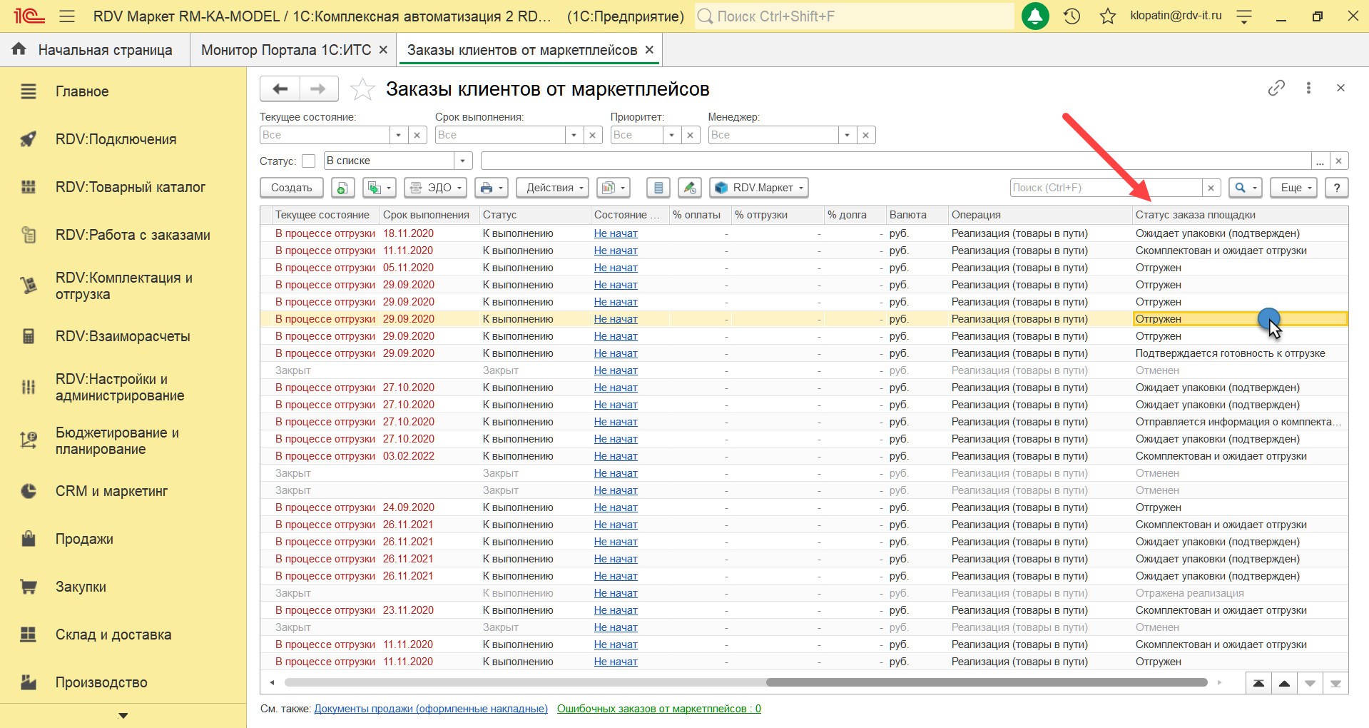 Заказы с маркетплейсов отображаются в форме списка заказов. По умолчанию фильтр не выведен на форму, это нужно сделать следующим образом. Выбираете любой заказ и нажимаете на него в столбце "Статус заказа площадки" и нажимаете "Alt + F"