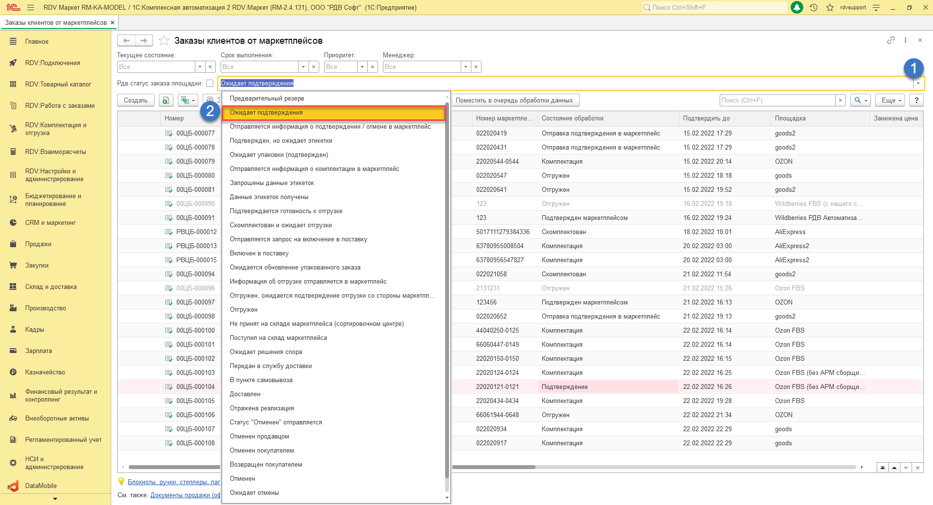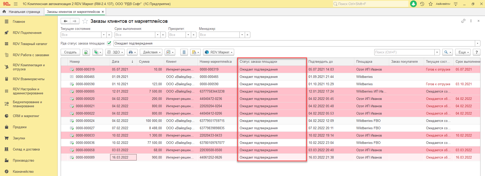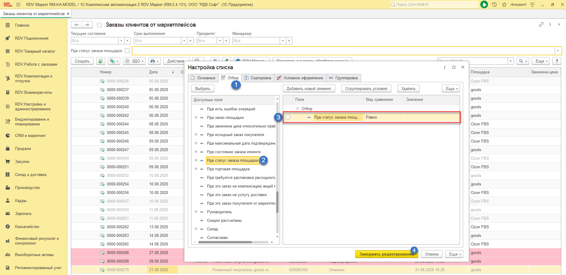 После этого в окне со списком заказов появится фильтр "Рдв статус заказа площадки".