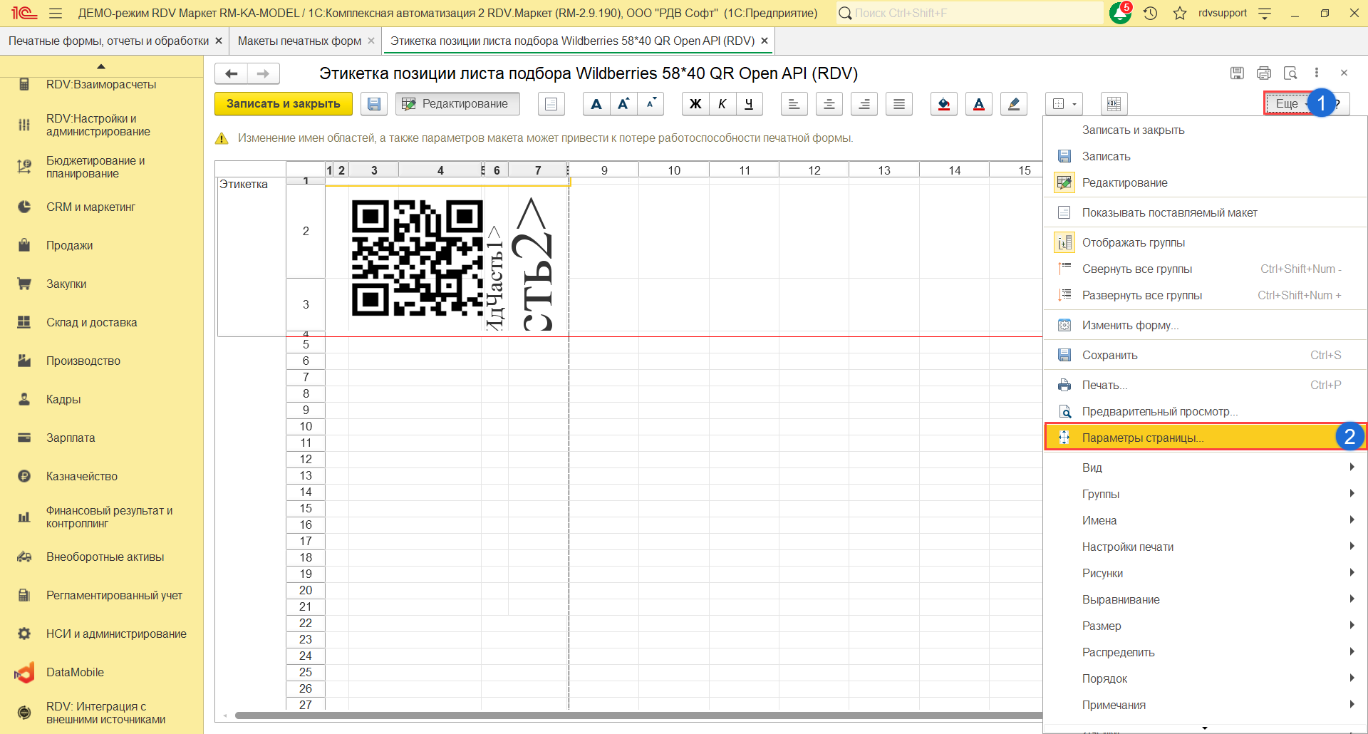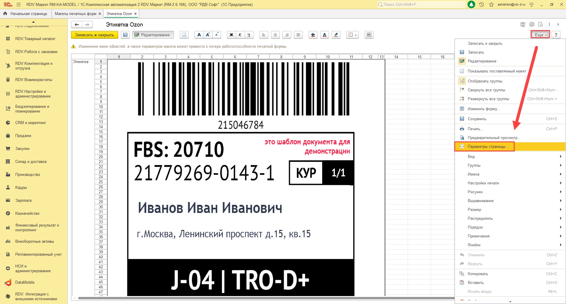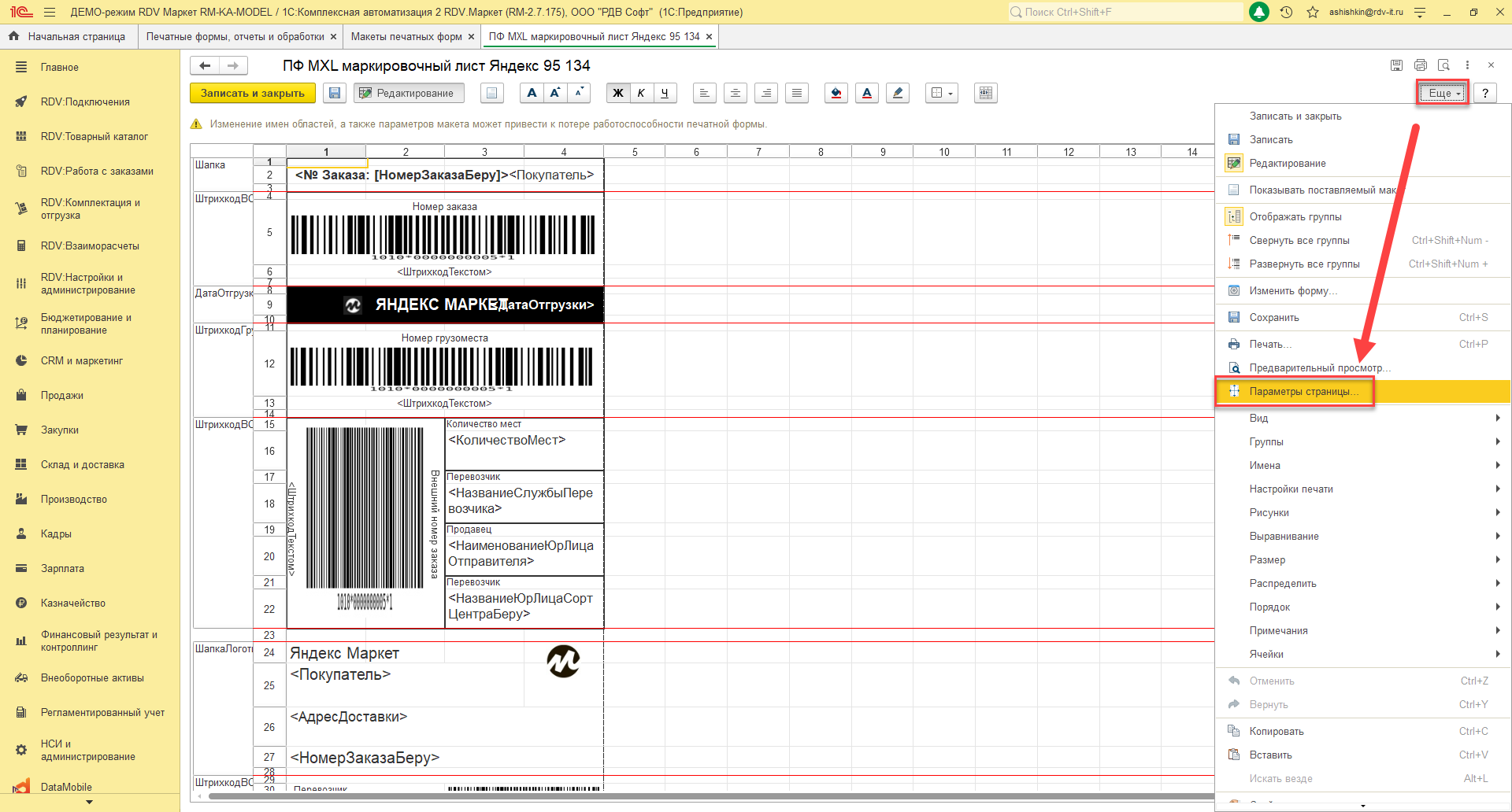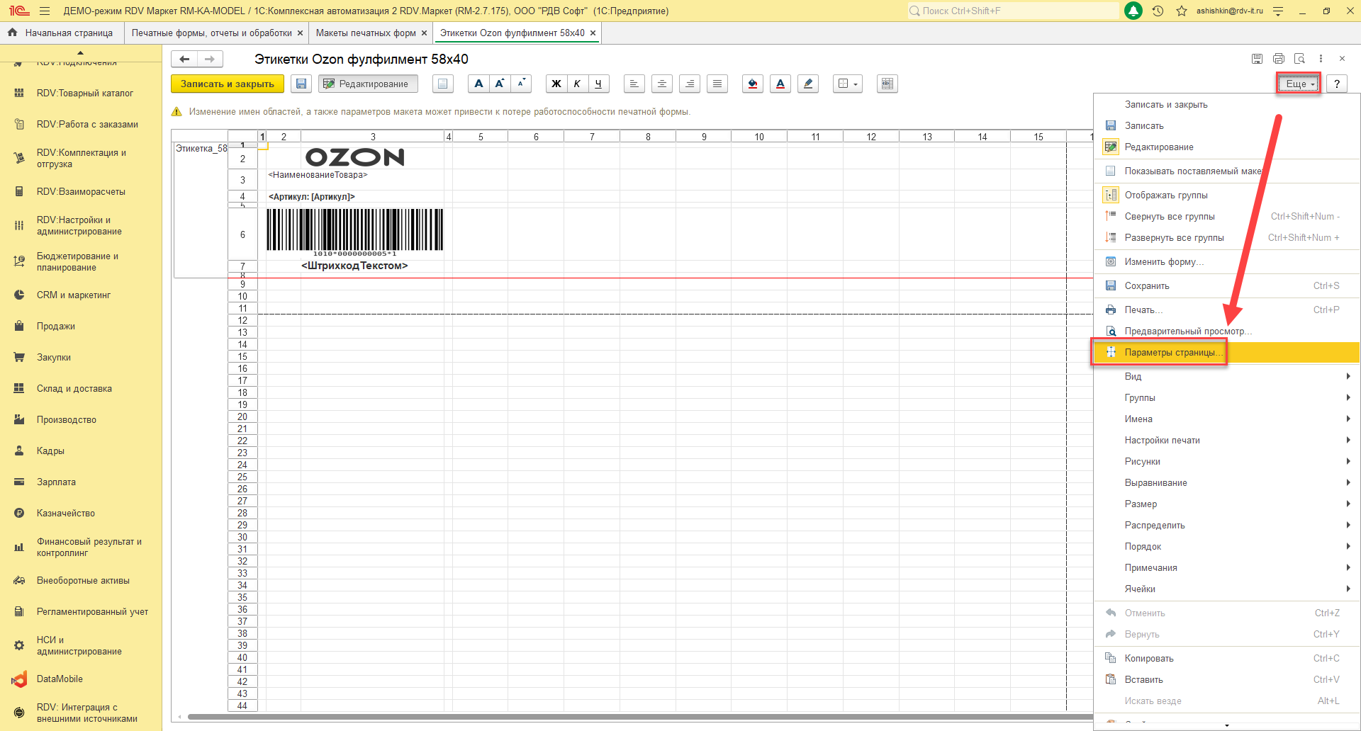 2. В настройки принтера можно перейти непосредственно из макета этикетки через меню "Еще" - "Параметры страницы" - "Принтер":