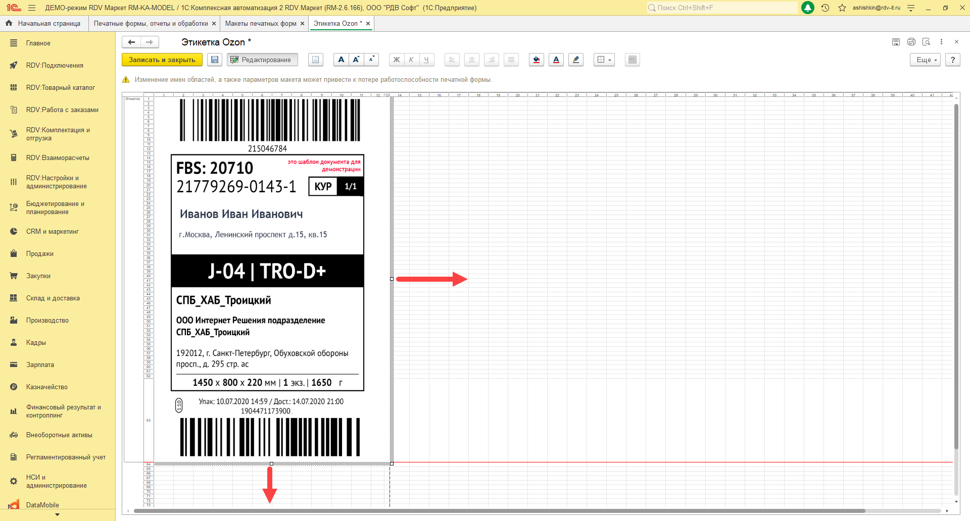 Если этикетка не помещается в необходимые размеры, то необходимо отредактировать размеры макета Это можно сделать с помощью растягивания самого макета: