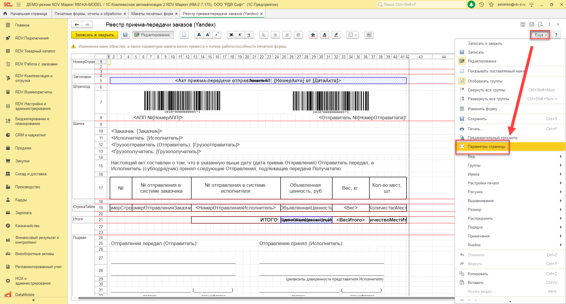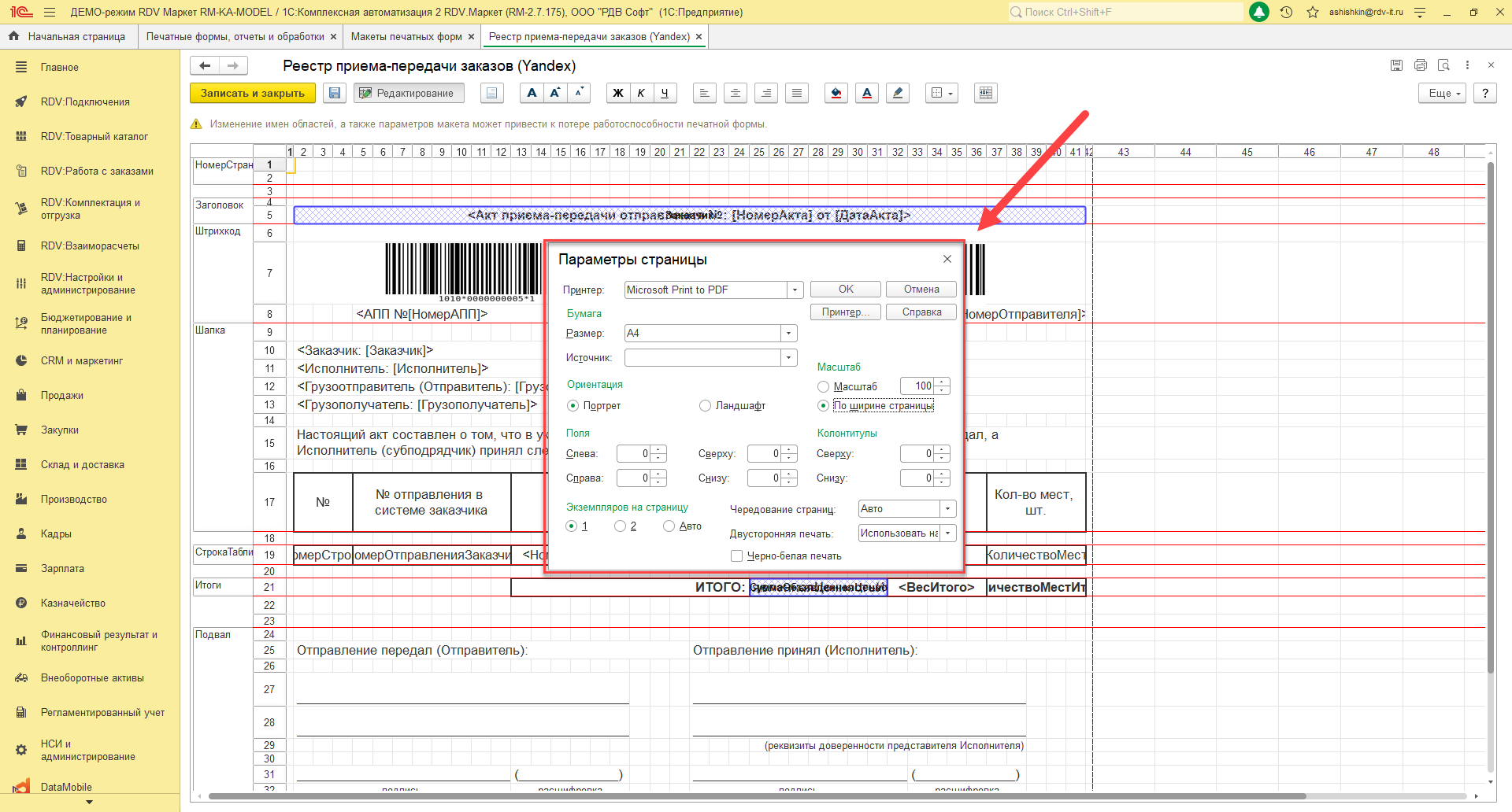 В параметрах страницы можно отредактировать настройки для корректной печати акта приема-передачи: