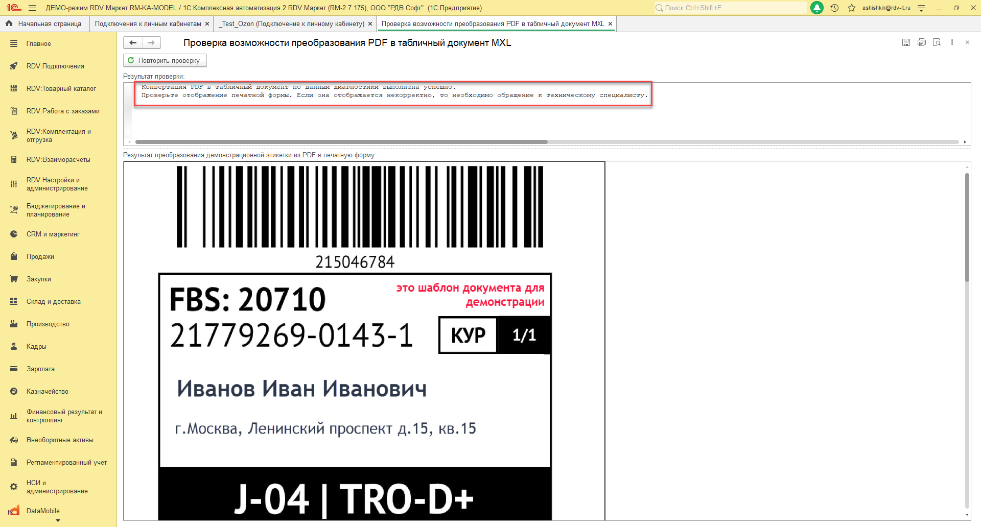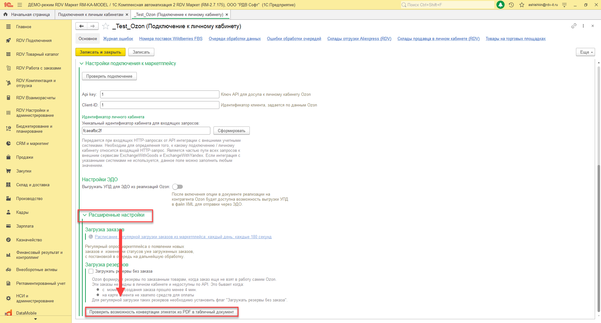 После настройки макета необходимо проверить конвертацию макета из PDF в формат MXL. Сделать это можно из настроек подключения к личным кабинетам: