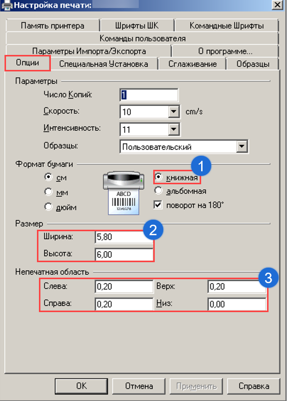На вкладке "Опции" необходимо выбрать формат бумаги "Книжная", "Размер" указать в соответствии с размером этикетки, "Непечатная область" - во всех полях необходимо выбрать значение "0"