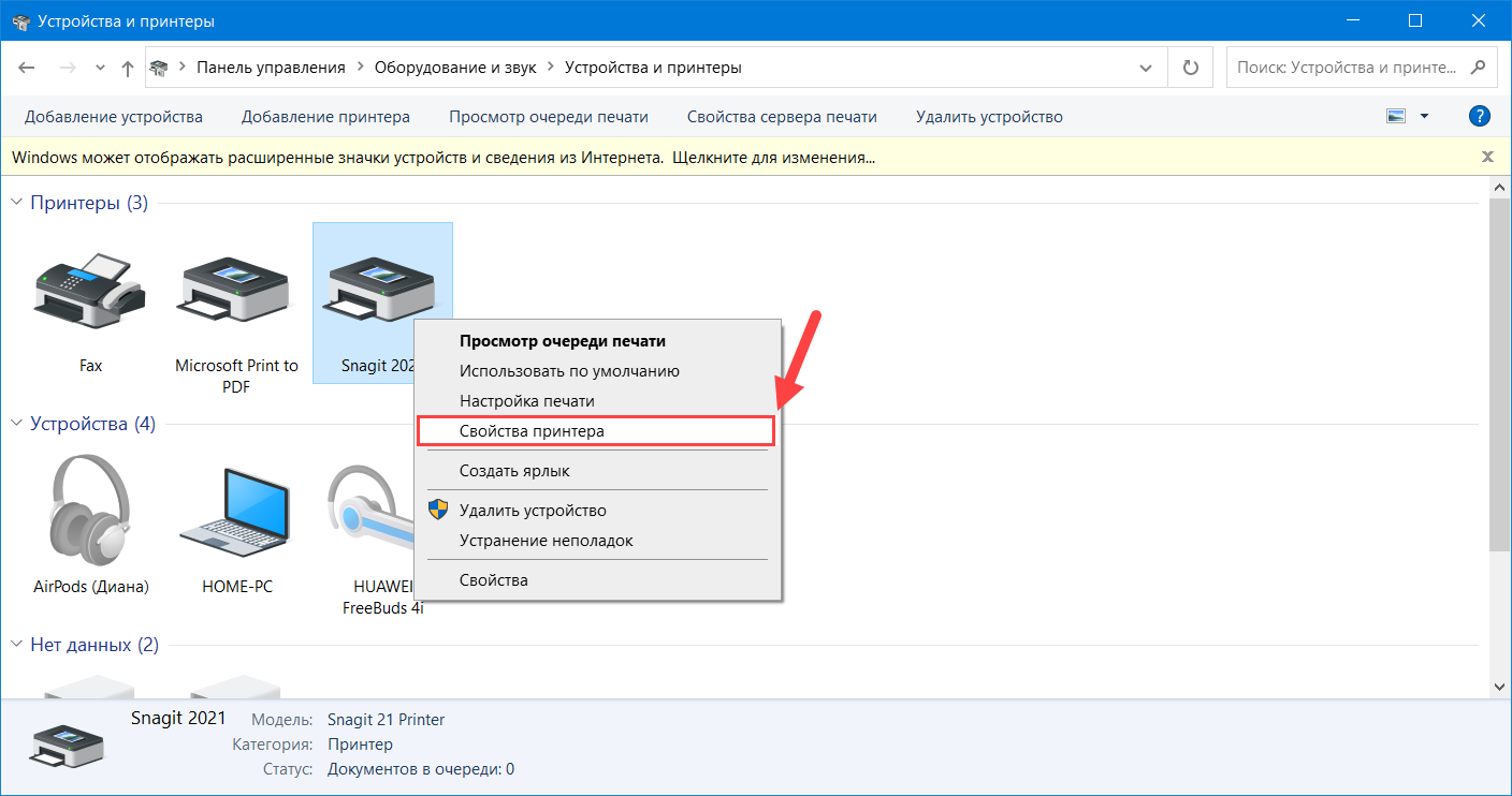 Далее необходимо выбрать принтер, на котором осуществляется печать этикеток и правой кнопки мыши перейти в меню "Свойства принтера"