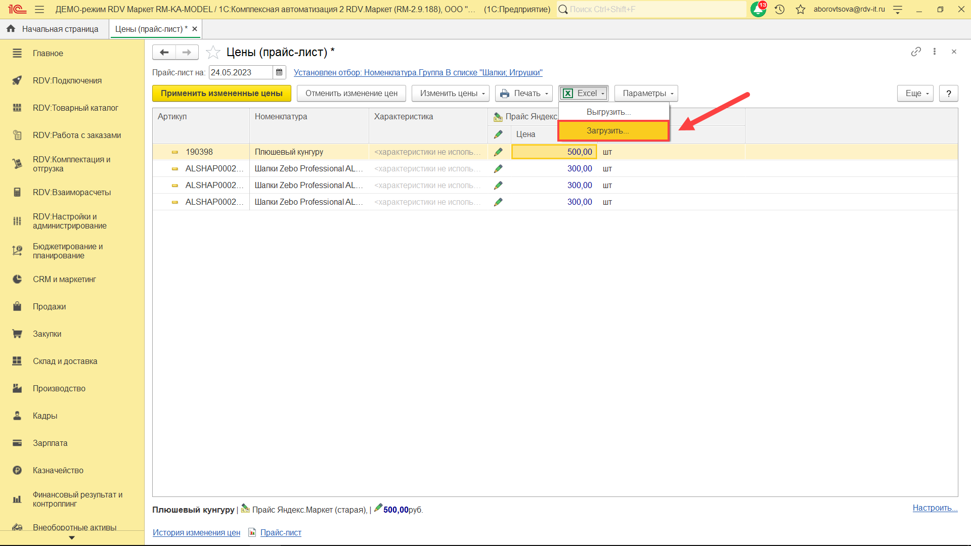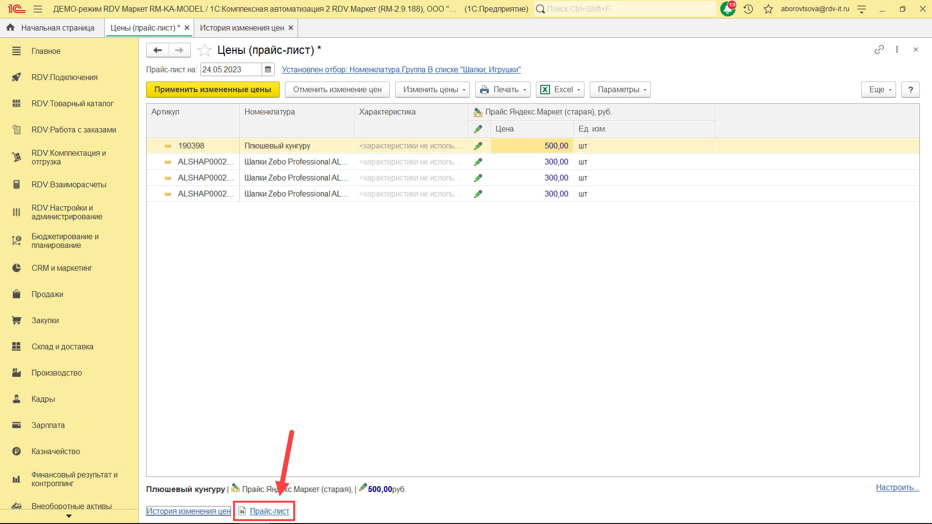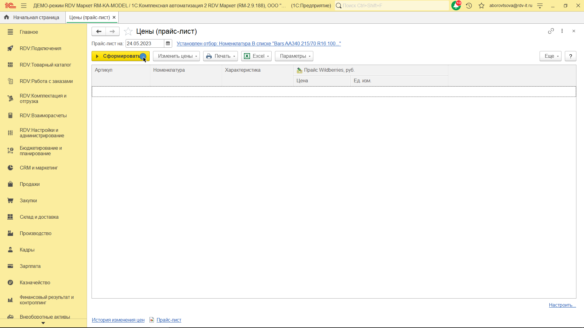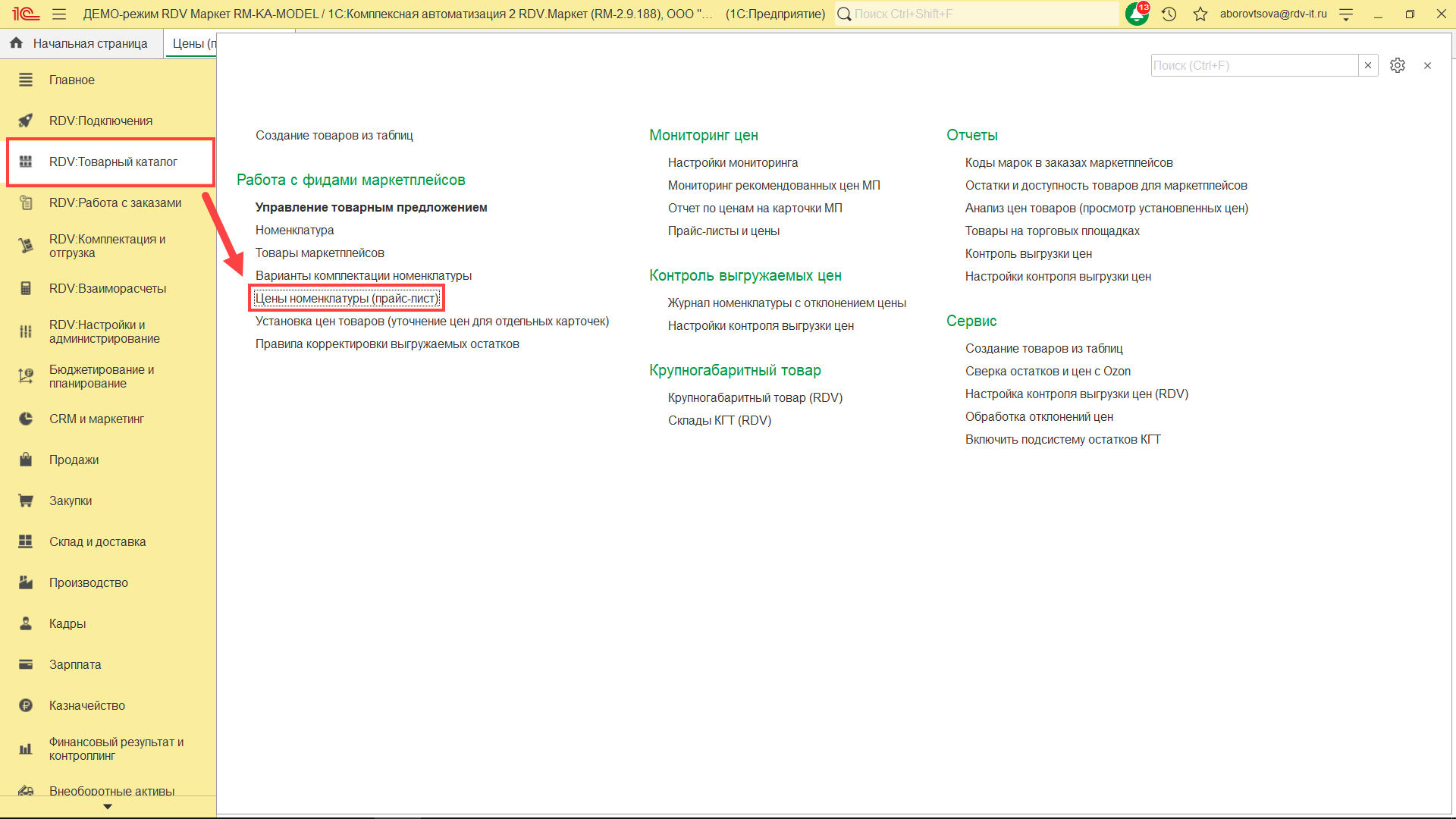 Для создания/обновления прайс-листа перейдите в раздел "RDV: Товарный каталог" - "Цены (прайс-лист)":