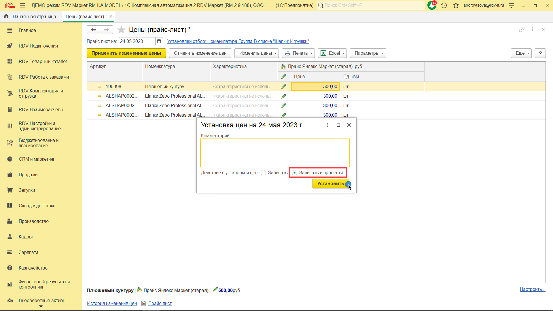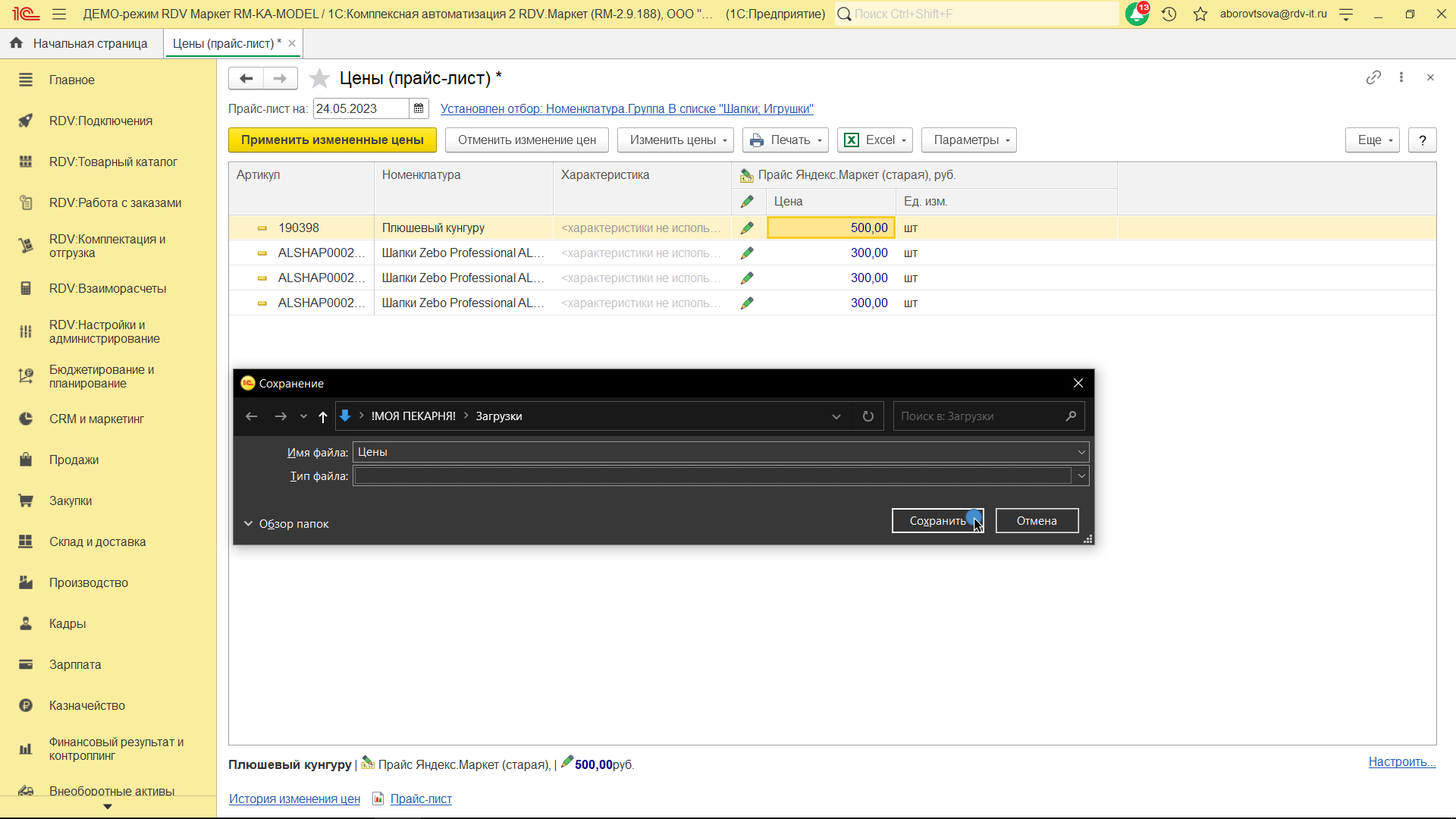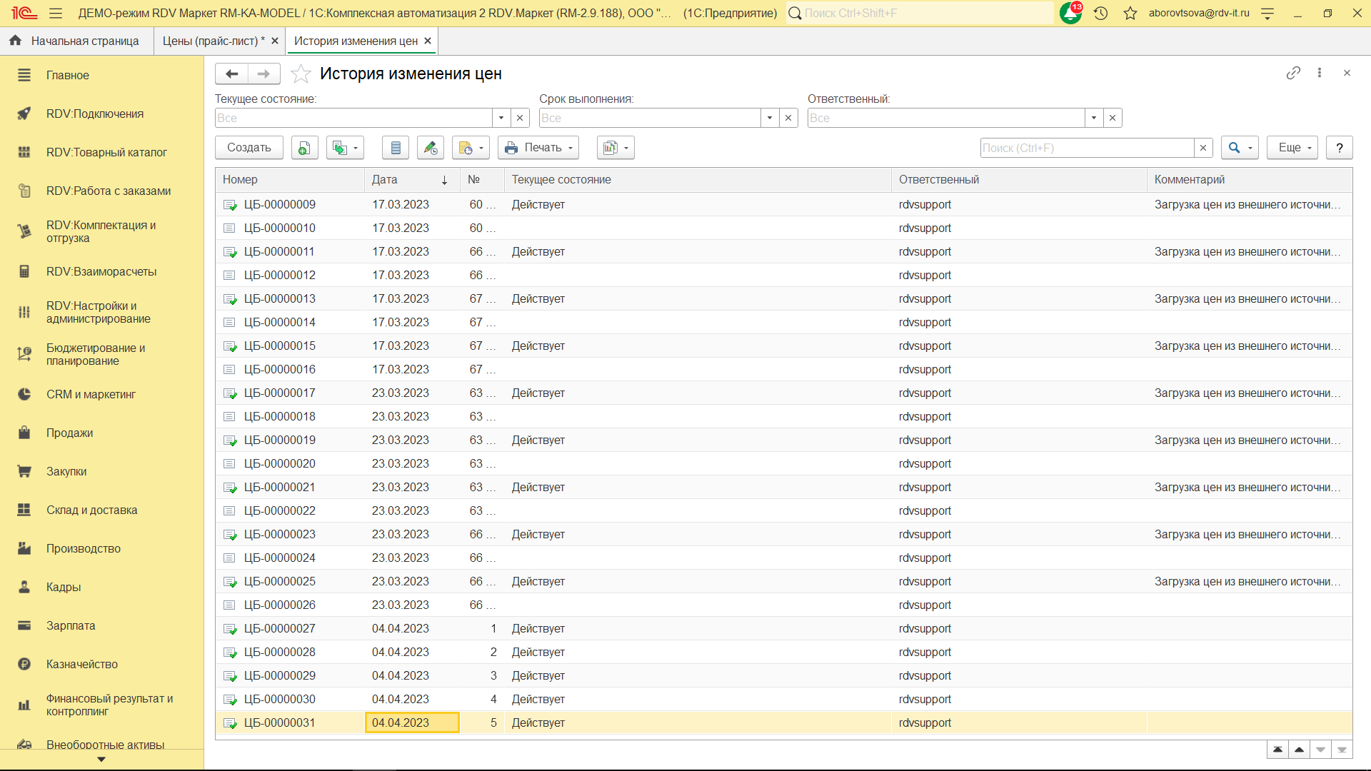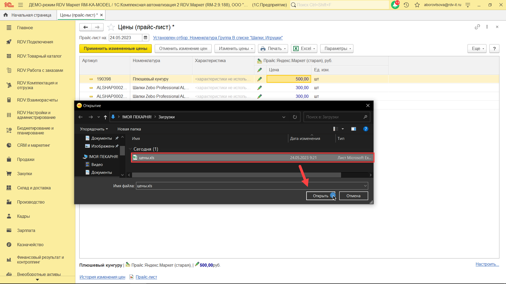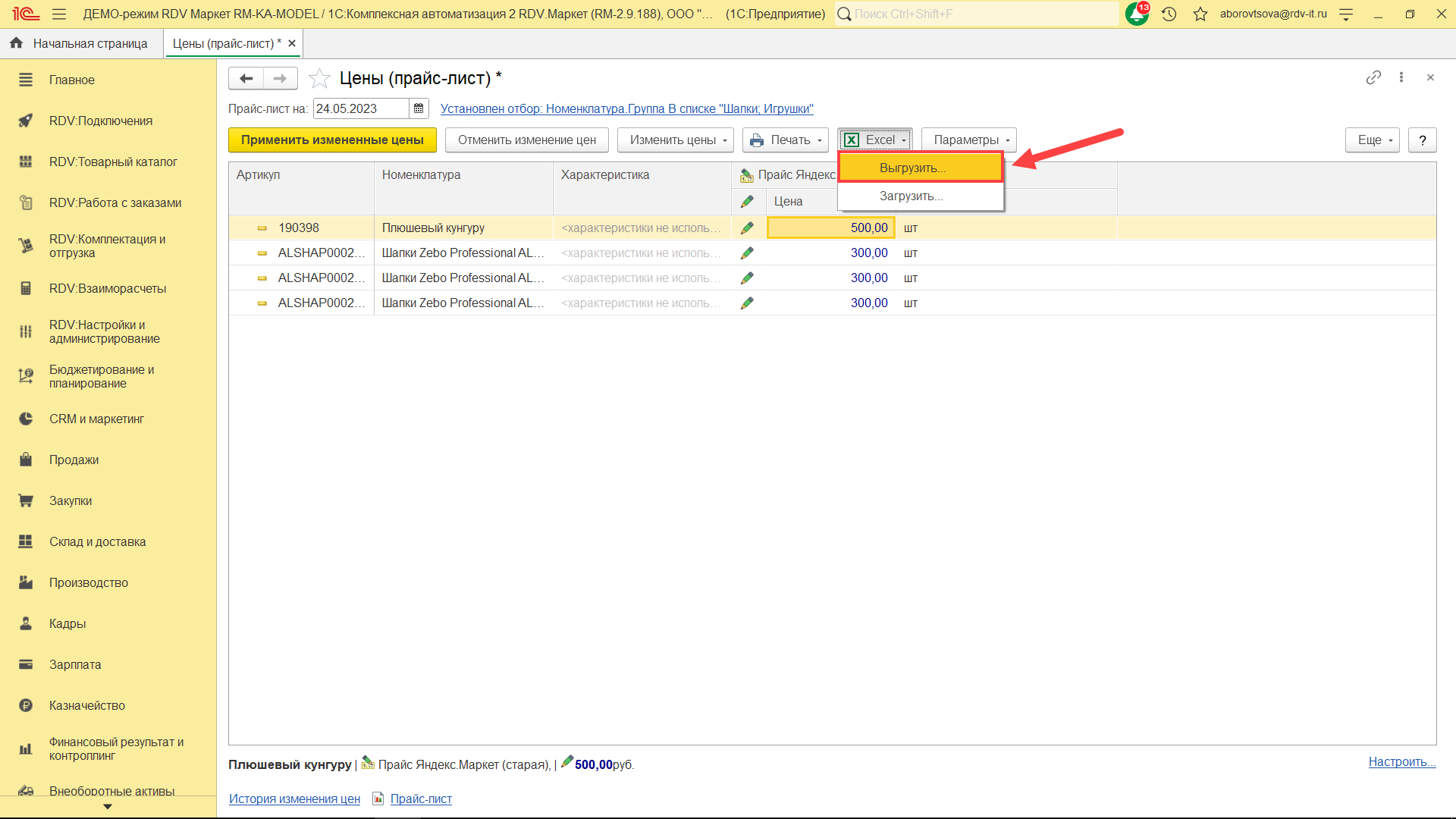 Для создания/обновления прайс-листа перейдите в раздел "RDV: Товарный каталог" - "Цены (прайс-лист)":