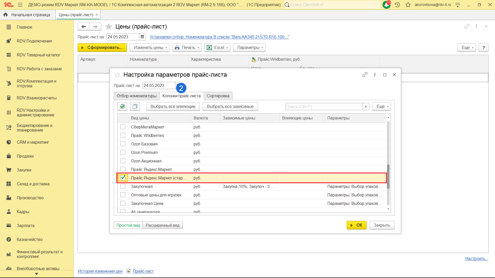 2. "Колонки прайс-листа" - установите вид цены, указанный в настройках подключения к личному кабинету Яндекс.Маркет.